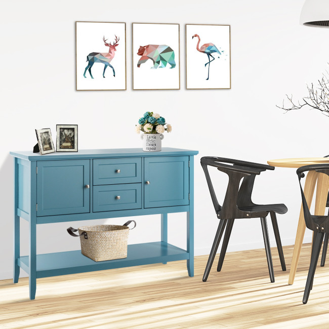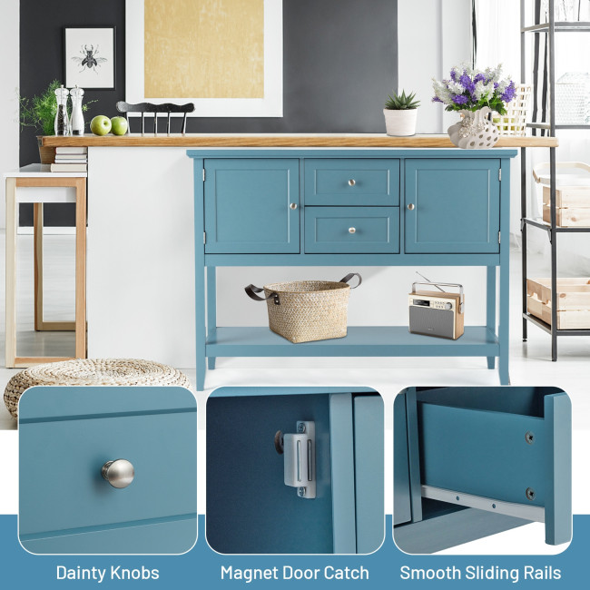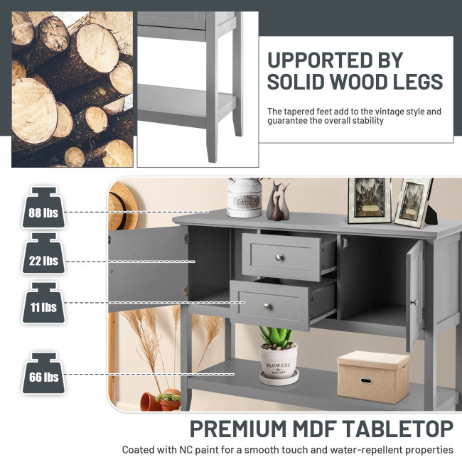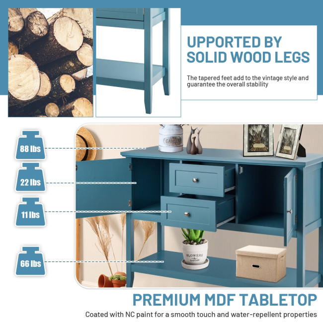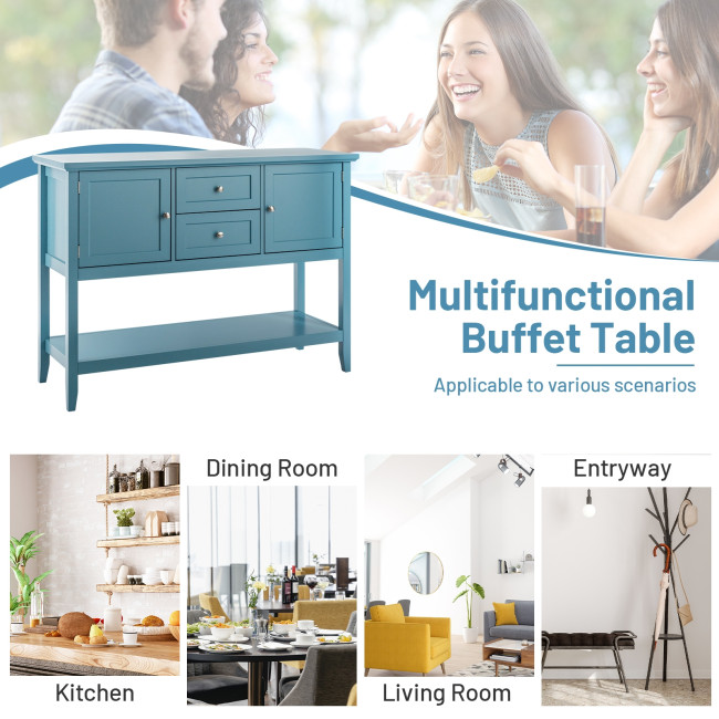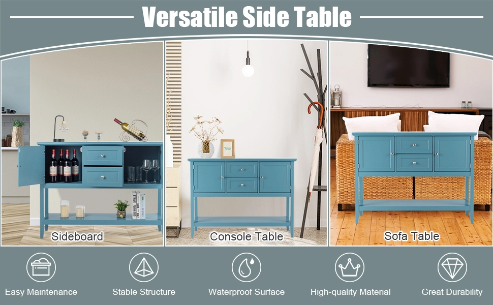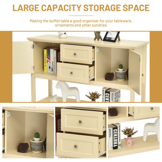 The smooth surface is not only easy to clean, but also burr-free to protect your hands from injury. Its sturdy desktop and bottom open shelf are ideal for displaying your kitchen utensil or decorative items. Equipped with 2 cabinets and 2 drawers, the sideboard offers spacious storage space. This elegant tables can be used as a buffet table, couch table and entry table in your dining room, living room, hallway and office.