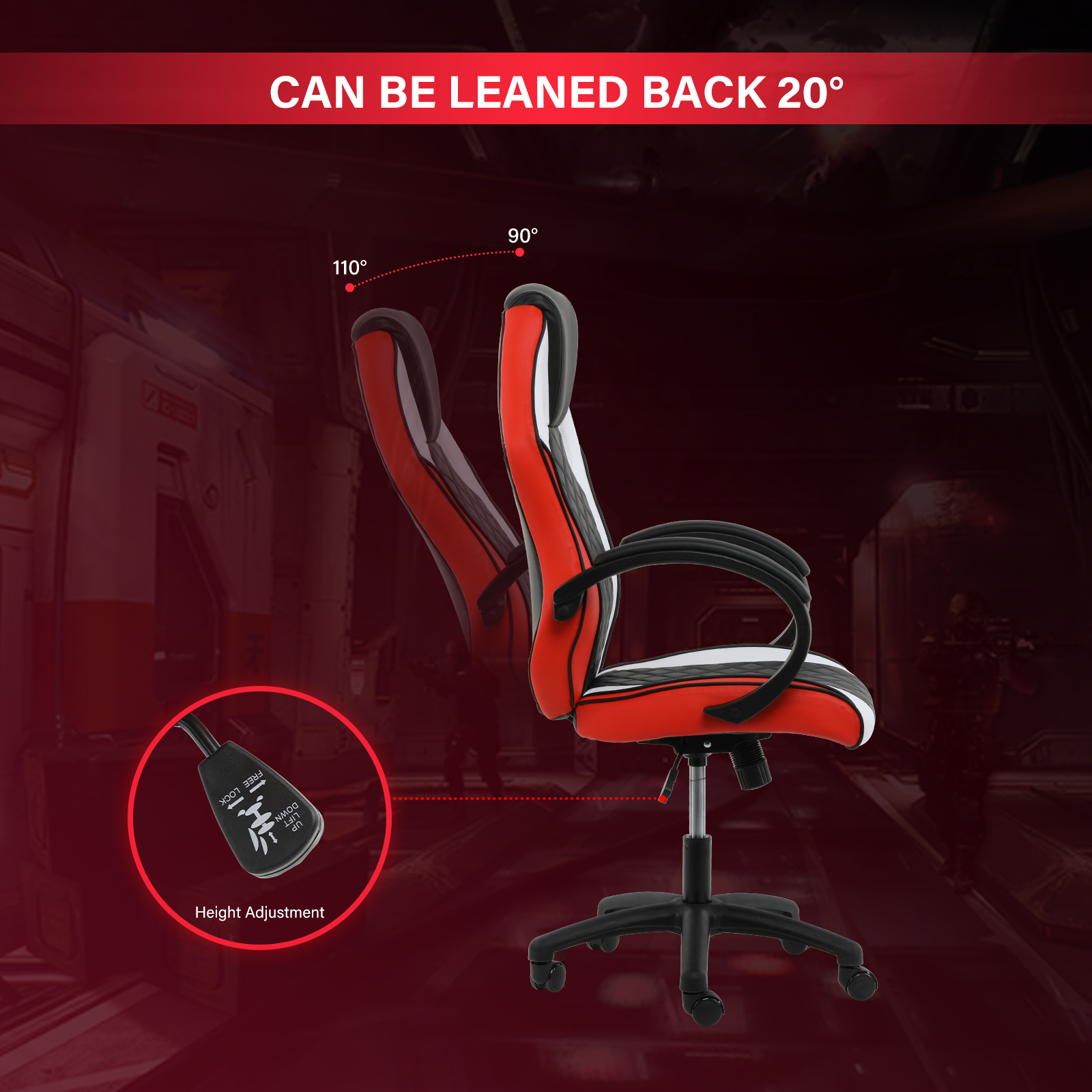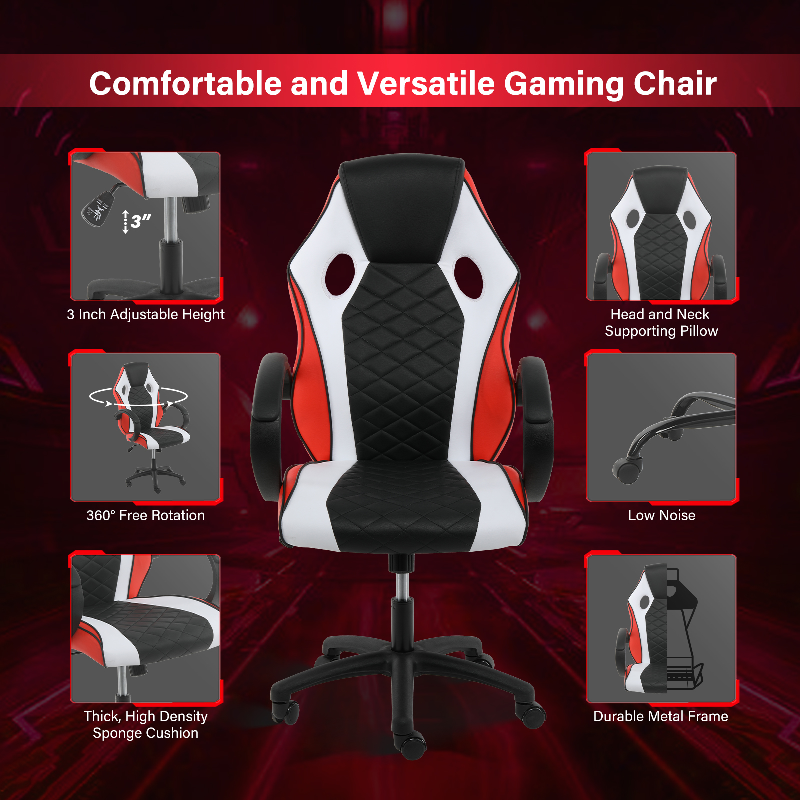 This gaming chair is multifunctional. The ergonomic computer chair with the high-density cushion seat, the high backrest and the wide armrests will become your favorite. Every single part of this chair can be adjusted to your height and body.[Racing Style] This gaming chair is wrapped in black, red and white leatherette and carbon-fiber in a sleek, race-inspired shape, providing immersive gaming experience.[Comfort Design] Ergonomic design helps you maintain a neutral, balanced posture. Well-padded seat, lumbar & headrest cushions make gaming sessions more enjoyable[Fully Adjustable] Large angle adjuster provides perfect angle support from 90 to 120 degrees to suit all your needs. Gas lift cylinder allows height adjusting from 16 to 19 inches. Full 360 degrees of swivel rotation enable dynamic movement.[High Quality] The video game chair use high quality materials - durable metal frame, supportive molded foam, soft PU leather and smooth rolling casters. Offering great stability and mobility for a capacity of up to 440 lbs.[Low Noise] Our gaming chair have smooth roller wheels which doesn’t require the mat, it moves smoothly over the carpet and the tile as well. They will not cause damage to the floor and will not make noise during use.