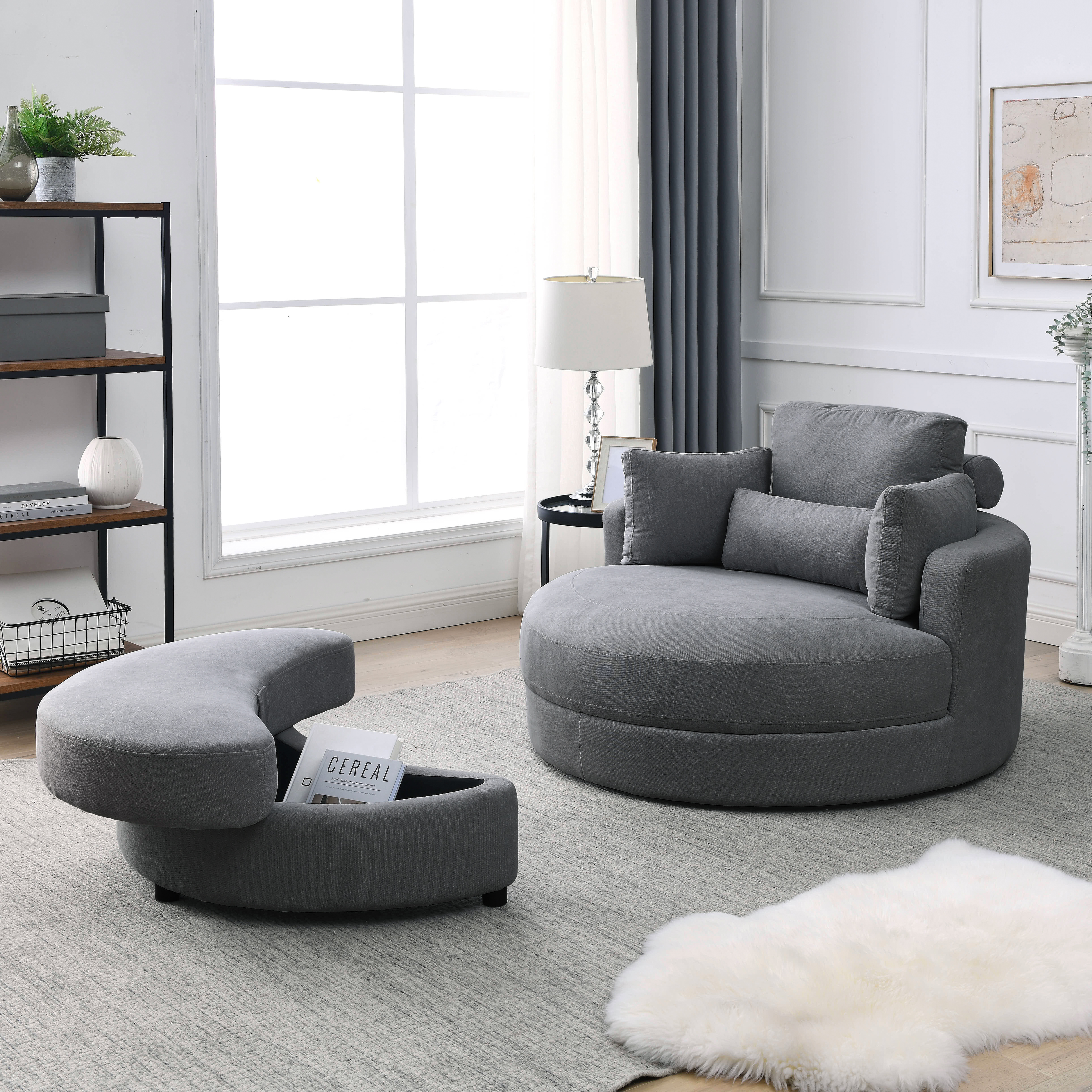 [Video] Welike Swivel Accent Barrel Modern Grey Sofa Lounge Club Big Round Chair with Storage Ottoman Linen Fabric for Living Room Hotel with Pillows(Same as W83434389)