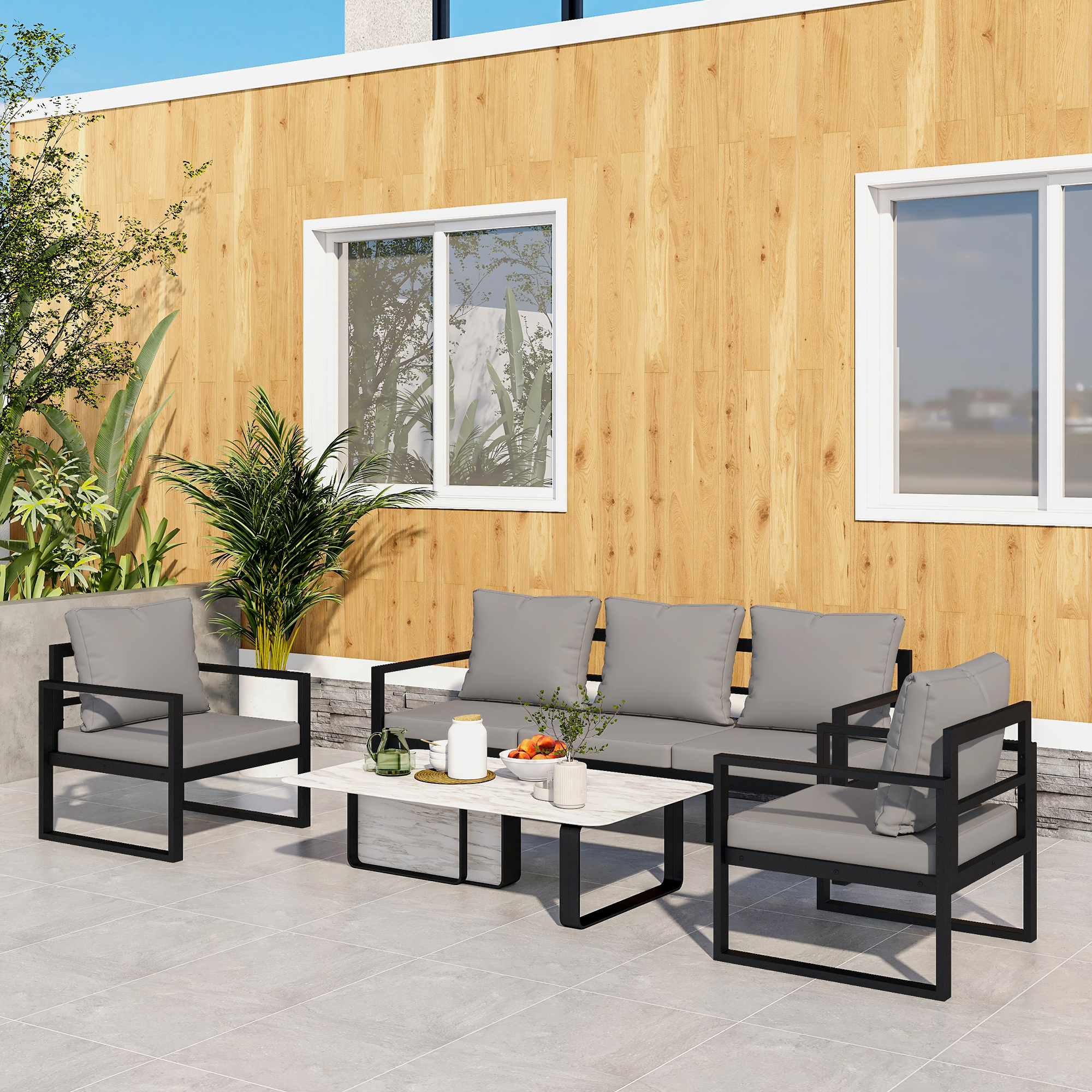 Outdoor Patio Furniture Sets, Conversation Set Modern Black Metal Sectional Sofa with Grey Cushion