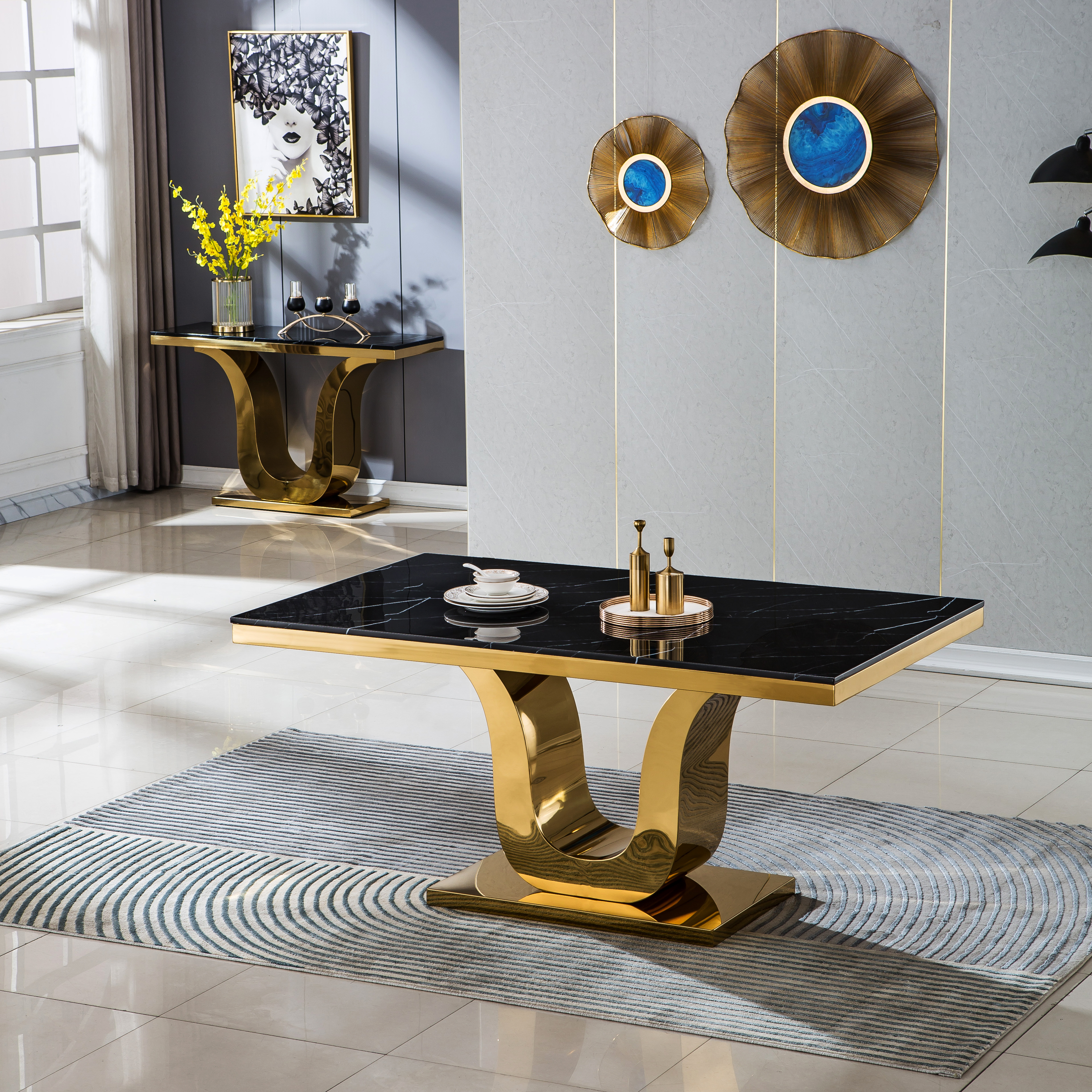 63"Modern artificial stone black curved golden metal leg dining table -6 people