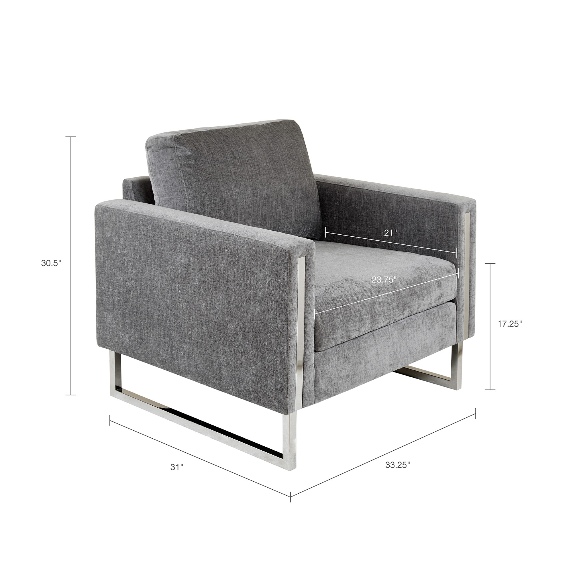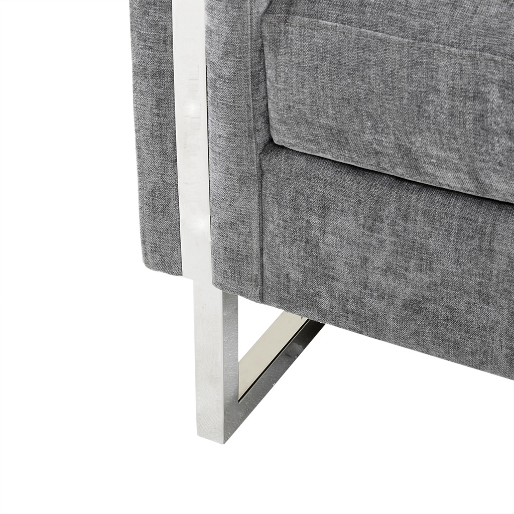 Long Descriptions | Give your space a lavish update with the INK+IVY Madden Accent Chair. Featuring high track arms and thick removable cushions, this accent chair is upholstered in a soft grey fabric that creates a luxurious seating experience. The chrome plated frame and legs provide exceptional support, while also adding a touch of elegance. Strikingly beautiful, this accent chair is sure to make a statement in any room of your home. Leg assembly required. |