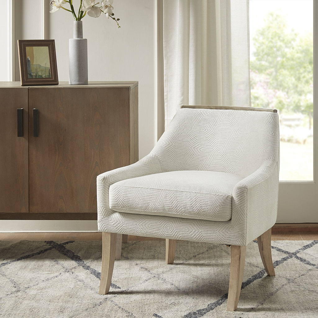 Long Descriptions | Complete your home decor with the chic style of the Madison Park MiaRose Accent Chair. This accent chair is upholstered in a geometric jacquard fabric that creates a stunning transitional look with a soft hand-feel. The low back and recessed arms provide an elegant silhouette, while the exposed wood at the top complements the design. Solid wood legs match the exposed wood on the back and provide a sturdy base. Add this accent chair to your living room decor and elevate the look of your space. Leg assembly required and tools are included. |