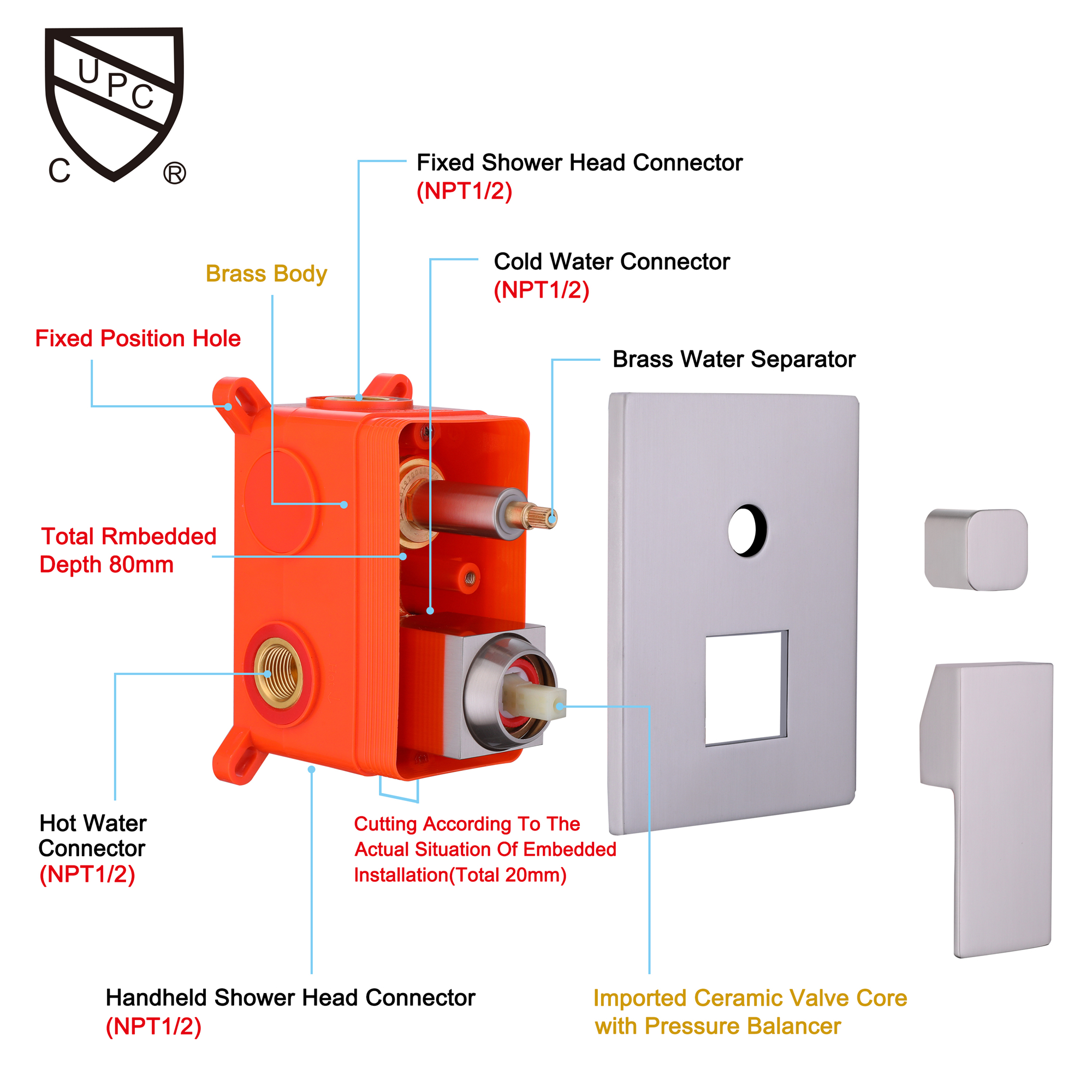 This shower system features a 10" by 10" oversized spray area with a nozzles rainfall showerhead, full covering your body, feels like the whole sky is raining down on you. The bathroom faucet uses brass material for environmental health, make sure that your domestic water, away from Lead poisoning, and protect the health of your family.