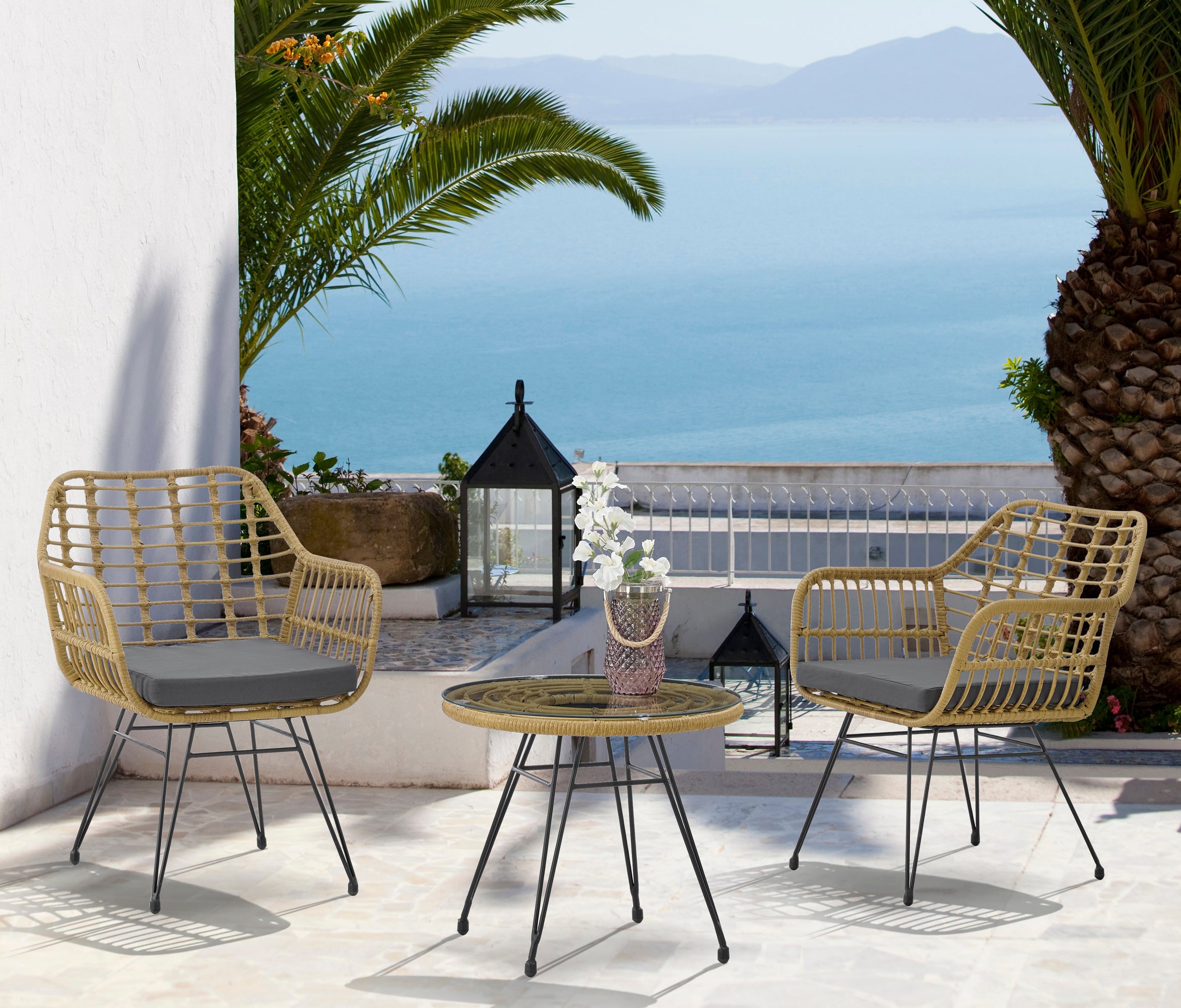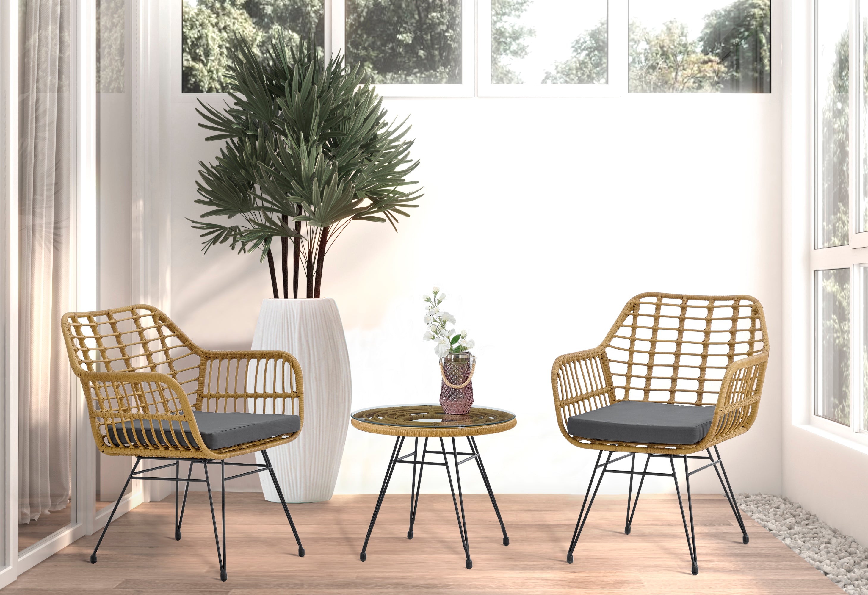 | Frame Material | PE rattan, metal steel frame, tempered glass |