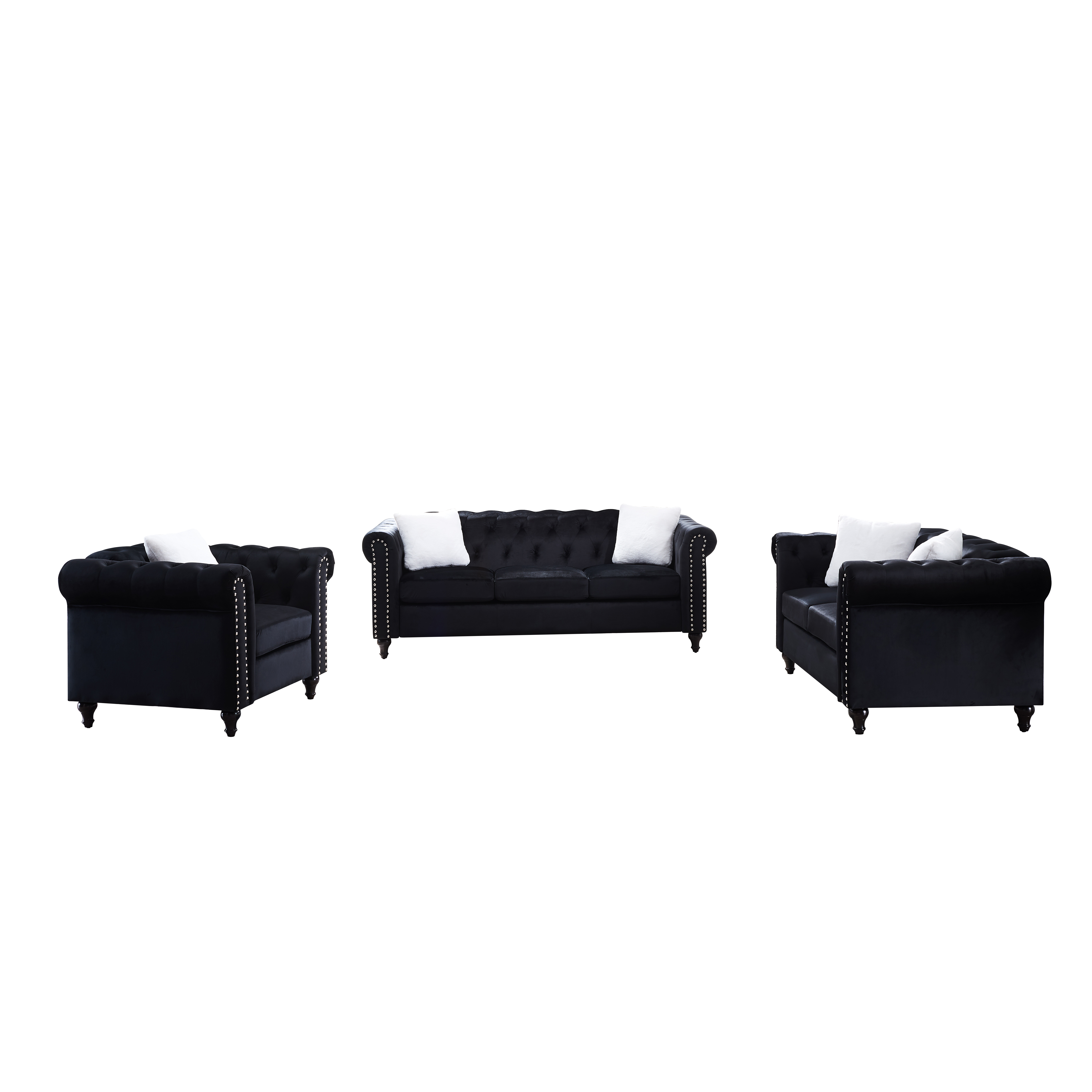Complete 3-piece sofa set includes 1 three seater sofa, 1 loveseat and 1 sofa chair perfect for filling living rooms and seating guests with ample space.
