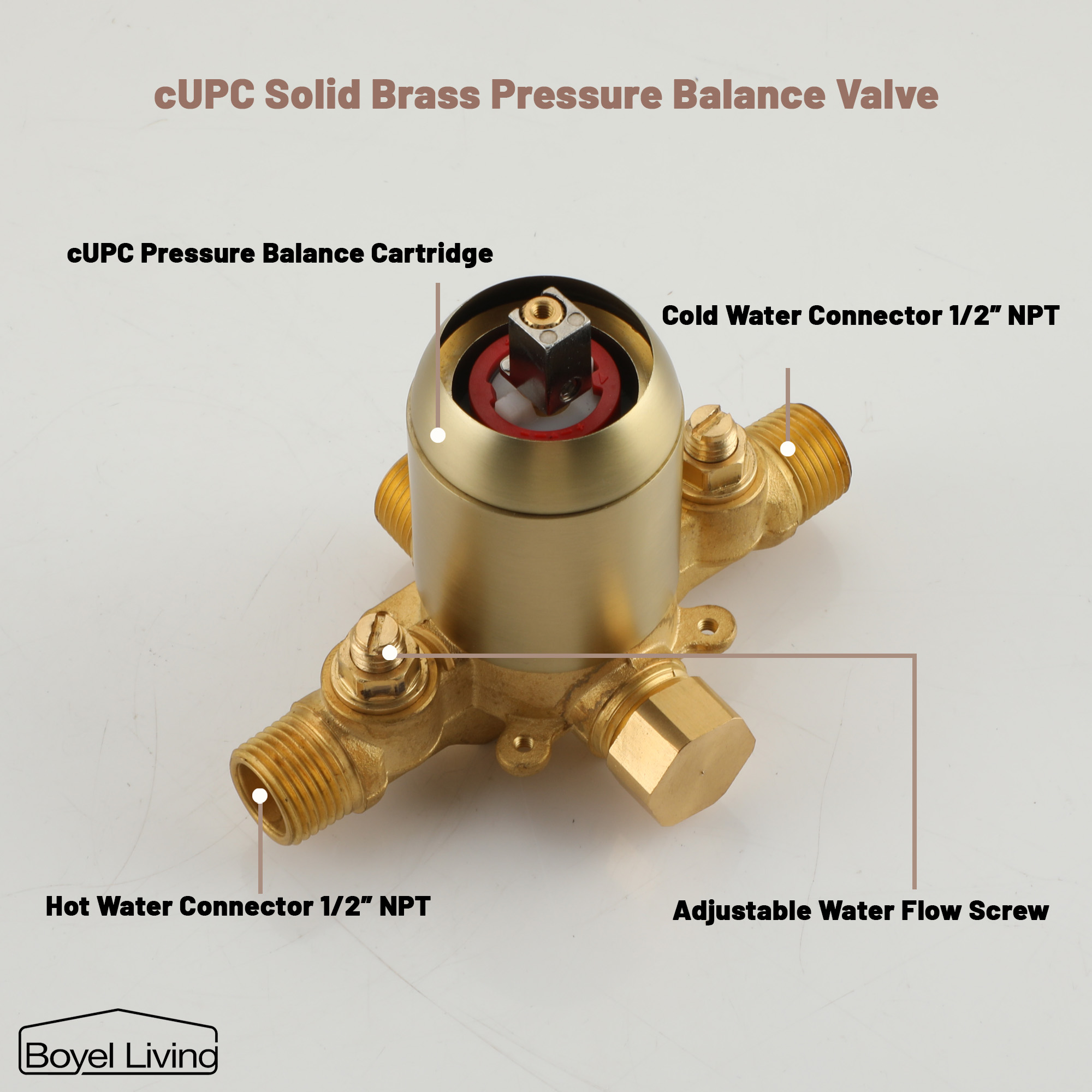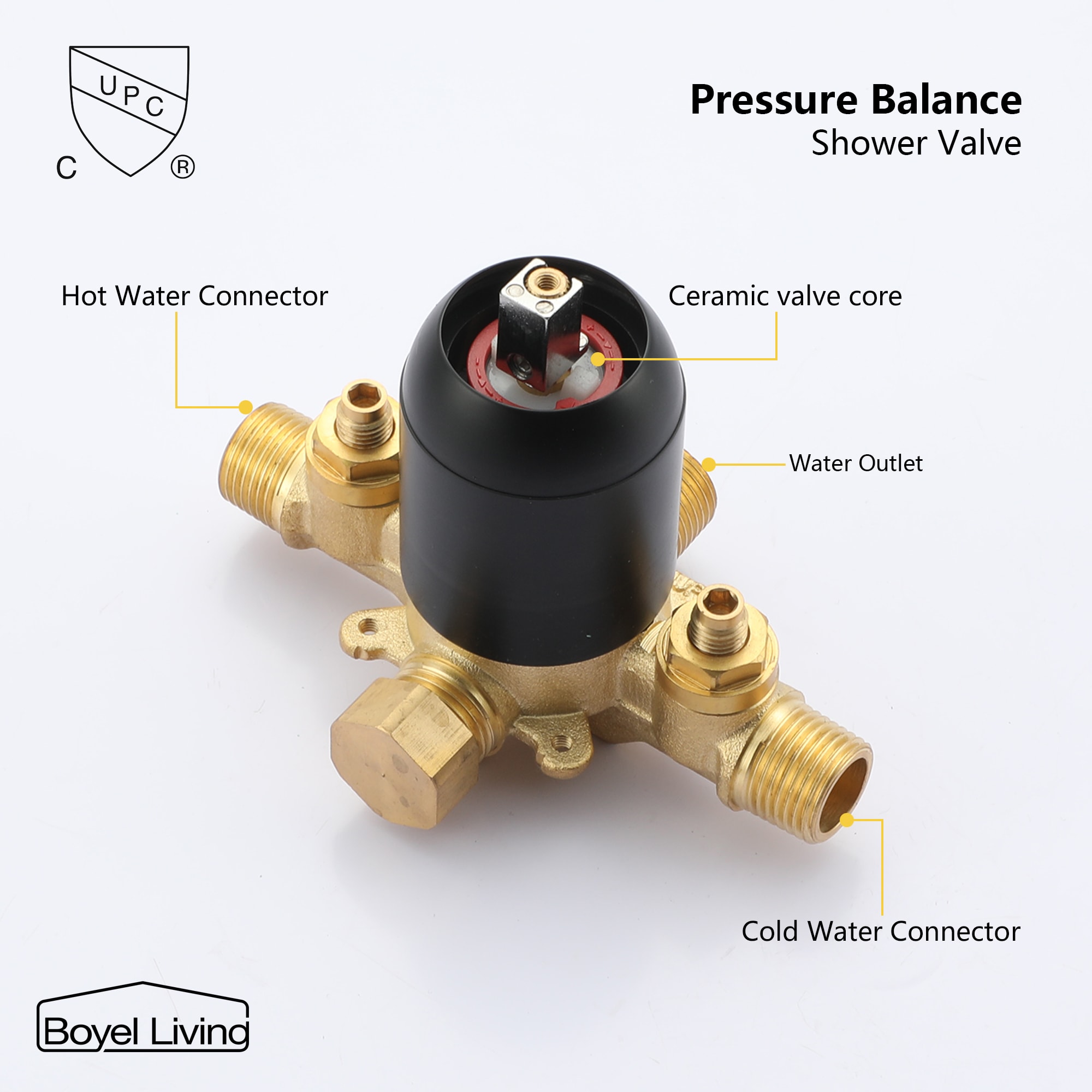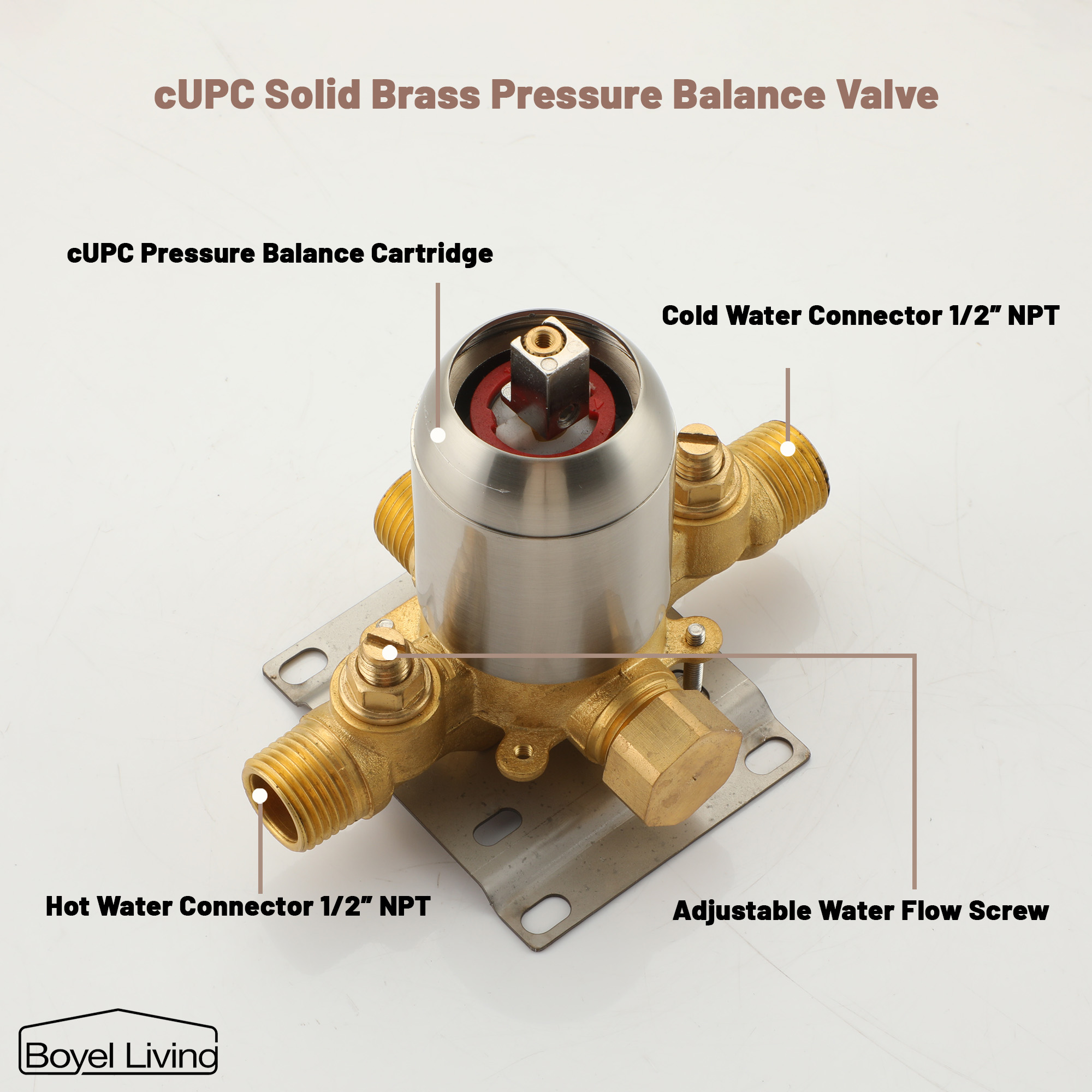 - Invigorating 3-function hand shower with 59" double-interlocking stainless steel hose balancing the pressure of both hot and cold water.