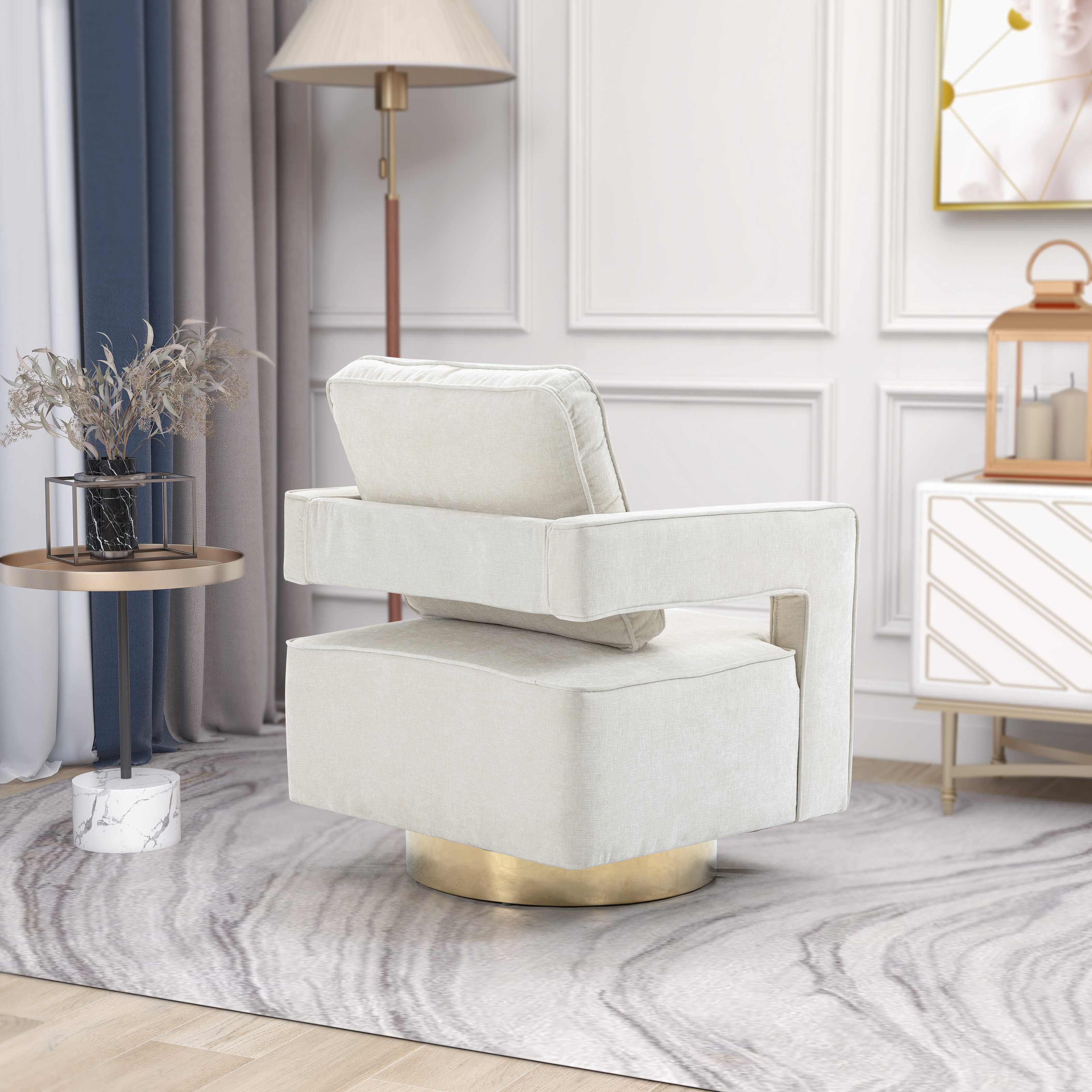 Comfortable Seat Cushion:This modern chair can be rotated 360° and has great flexibility in the house. The seat cushion of the chair is filled with a distinctive sponge, which is not only beautiful in appearance, but also more comfortable to ride.✔Excellent design of the chair:The seat is very wide and its easy to clean, the armrests of the chair also allow your arms to relax. The Accent chair with gold base which is more modern and luxurious.✔High quality fabric: The fabric of the chair adopts the rare chenille fabric on the market, which is skin-friendly and soft! And very durable!✔Product style: The accent chair is a unique decor for various occasions which can lift up the aesthetic of the interior design. Also it is a perfect addition to the hotel lounge, bedroom, living room, office, and nursery room.