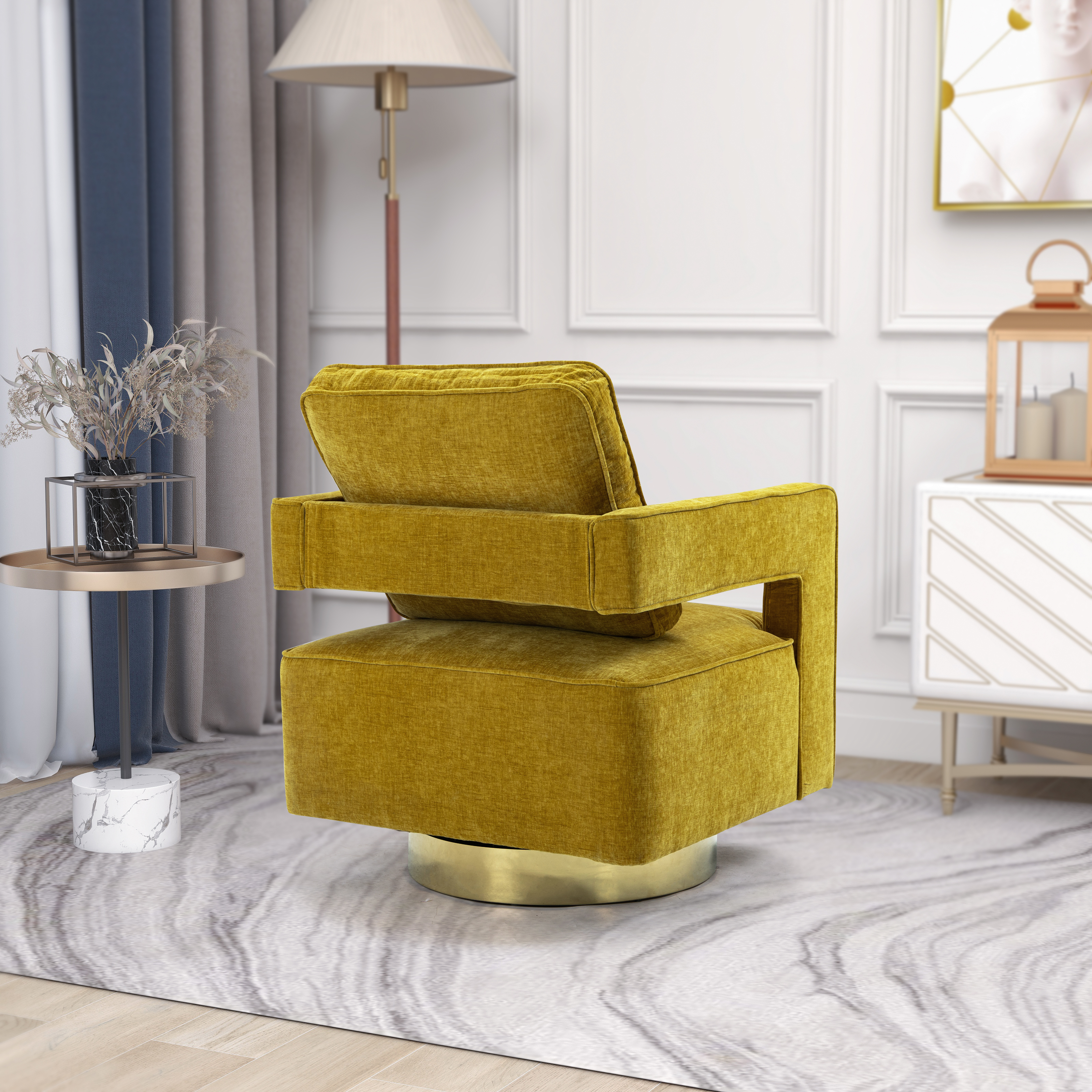 Comfortable Seat Cushion:This modern chair can be rotated 360° and has great flexibility in the house. The seat cushion of the chair is filled with a distinctive sponge, which is not only beautiful in appearance, but also more comfortable to ride.✔Excellent design of the chair:The seat is very wide and its easy to clean, the armrests of the chair also allow your arms to relax. The Accent chair with gold base which is more modern and luxurious.✔High quality fabric: The fabric of the chair adopts the rare chenille fabric on the market, which is skin-friendly and soft! And very durable!✔Product style: The accent chair is a unique decor for various occasions which can lift up the aesthetic of the interior design. Also it is a perfect addition to the hotel lounge, bedroom, living room, office, and nursery room.