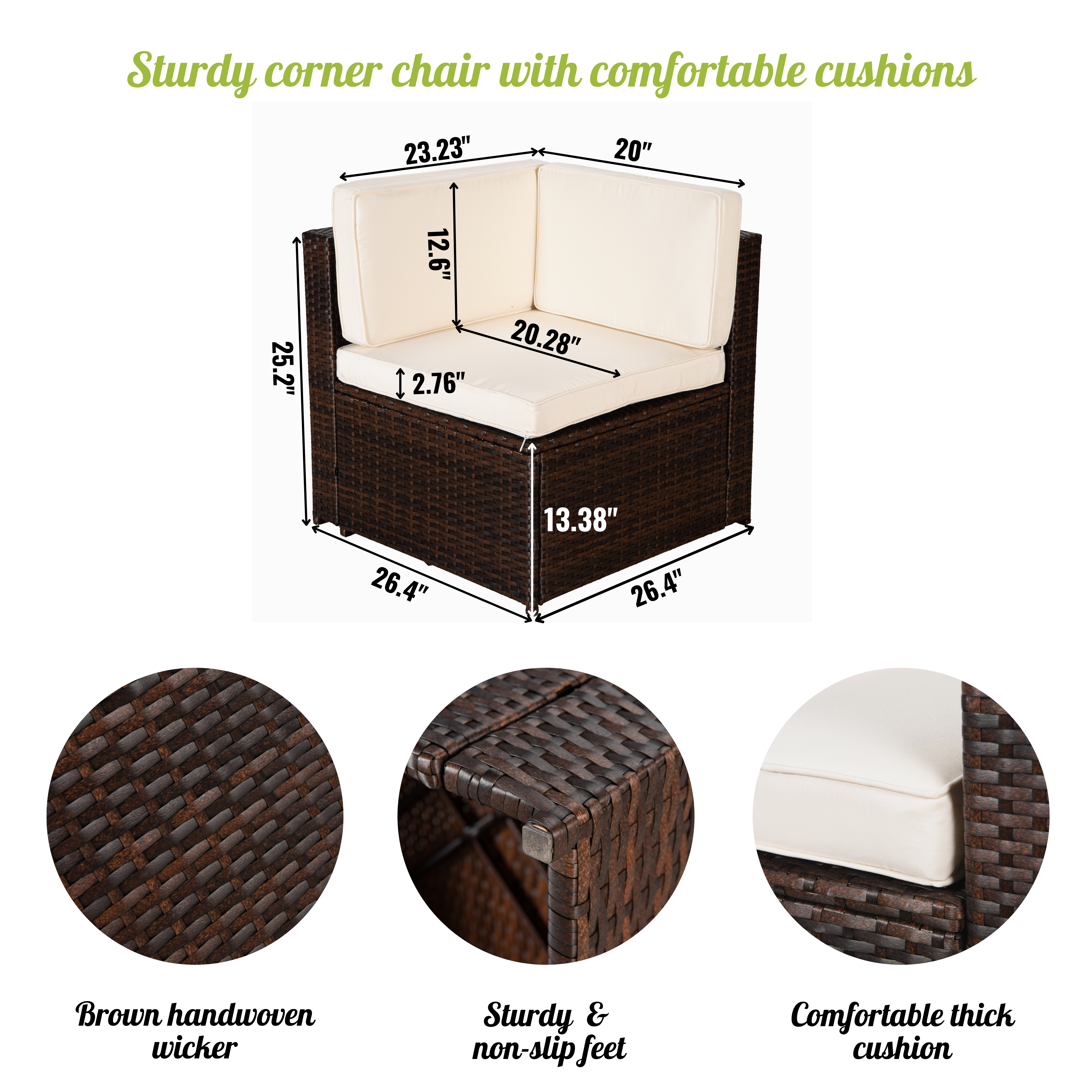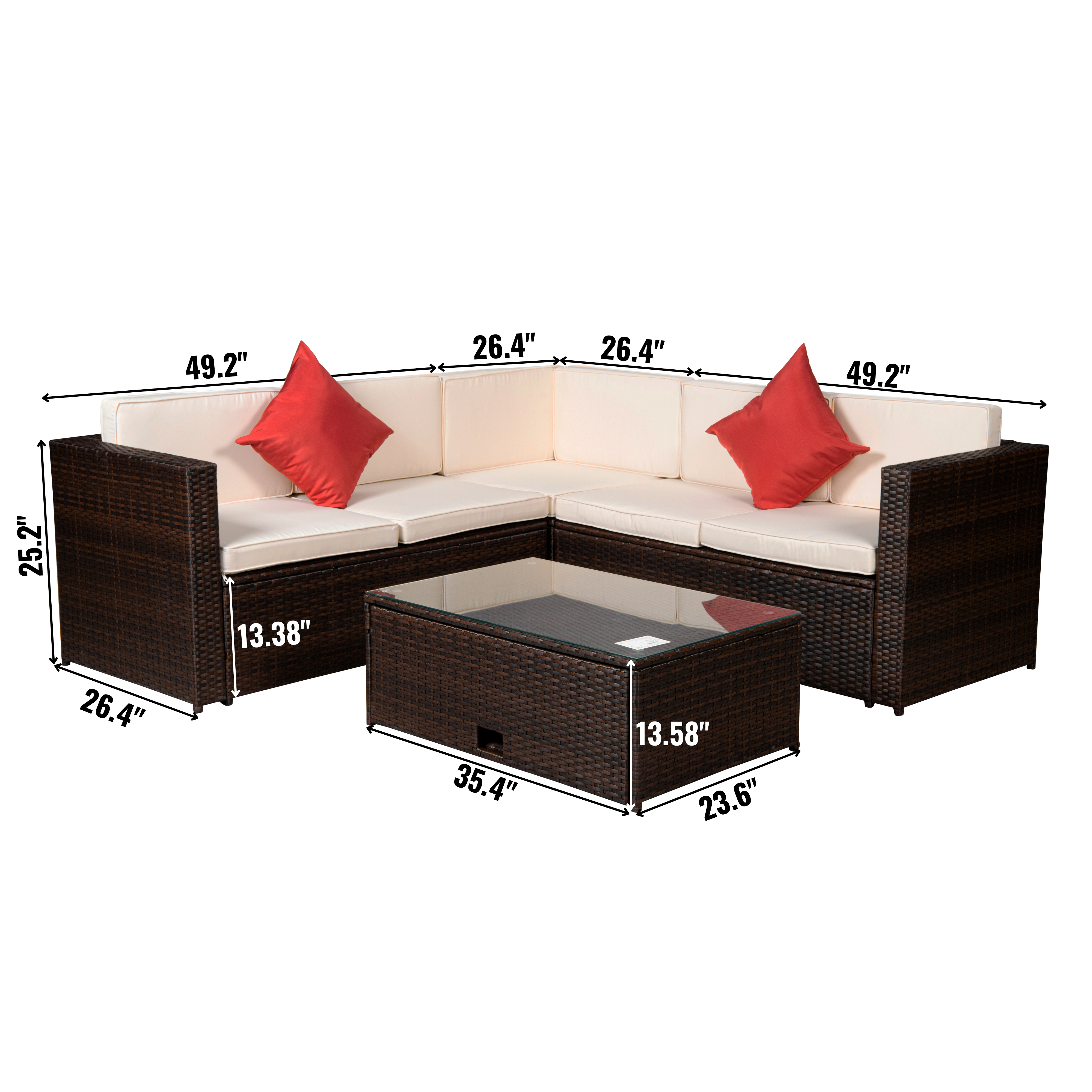 | Detail of each part | 2* Bench double seat: 49.2"L x 26.4"W x 25.2"H 1* Corner chair: 26.4"L x 26.4"W x 25.2"H 1* Table: 35.4"L x 23.6" W x 13.58"H 5* Seat cushion: 23.23"L x 23.23" W x 2.76"H 5* Long back cushion: 23.23"L x 12.6" W x 2.76"H 1* Short back cushion: 20.1"L x 12.6" W x 2.76"H 2* Pillows: 16.93"L x 16.93"W x 4" H |