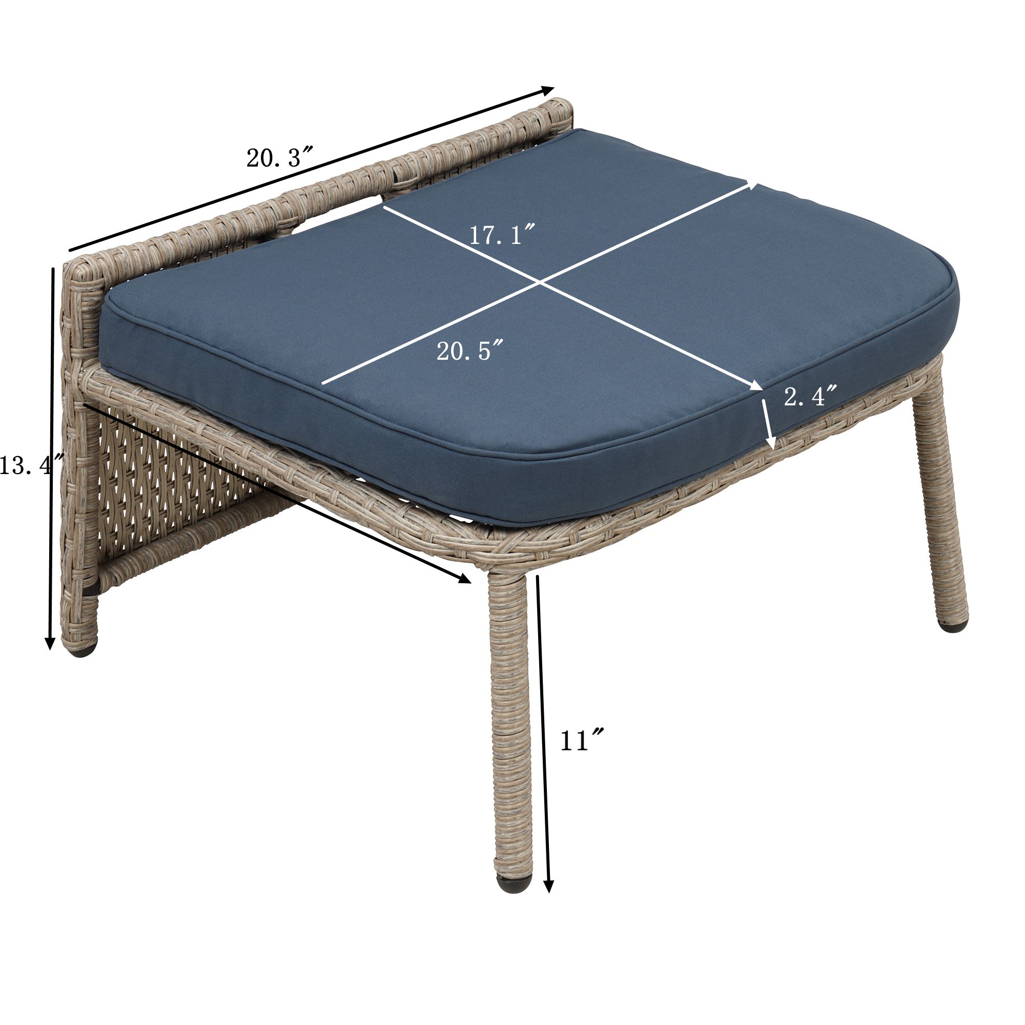 Overall Product Dimension | Single rattan chair:27.2 x 22.8 x 32.1 inches (L x W x H). Single stool: 20.3 x 17.1 x 13.4 inches (L x W x H). Coffee table: 17.9x 17.9x 20.5 inches (L x W x H) Seat cushion (chair): 20.5 x 19.9 x 2.4 inches(L x W x H). Back cushion: 21.7 x 15.7 x 6.9 inches(L x W x H). Seat cushion (stool): 20.5 x 17.1 x 2.4 inches(L x W x H) |