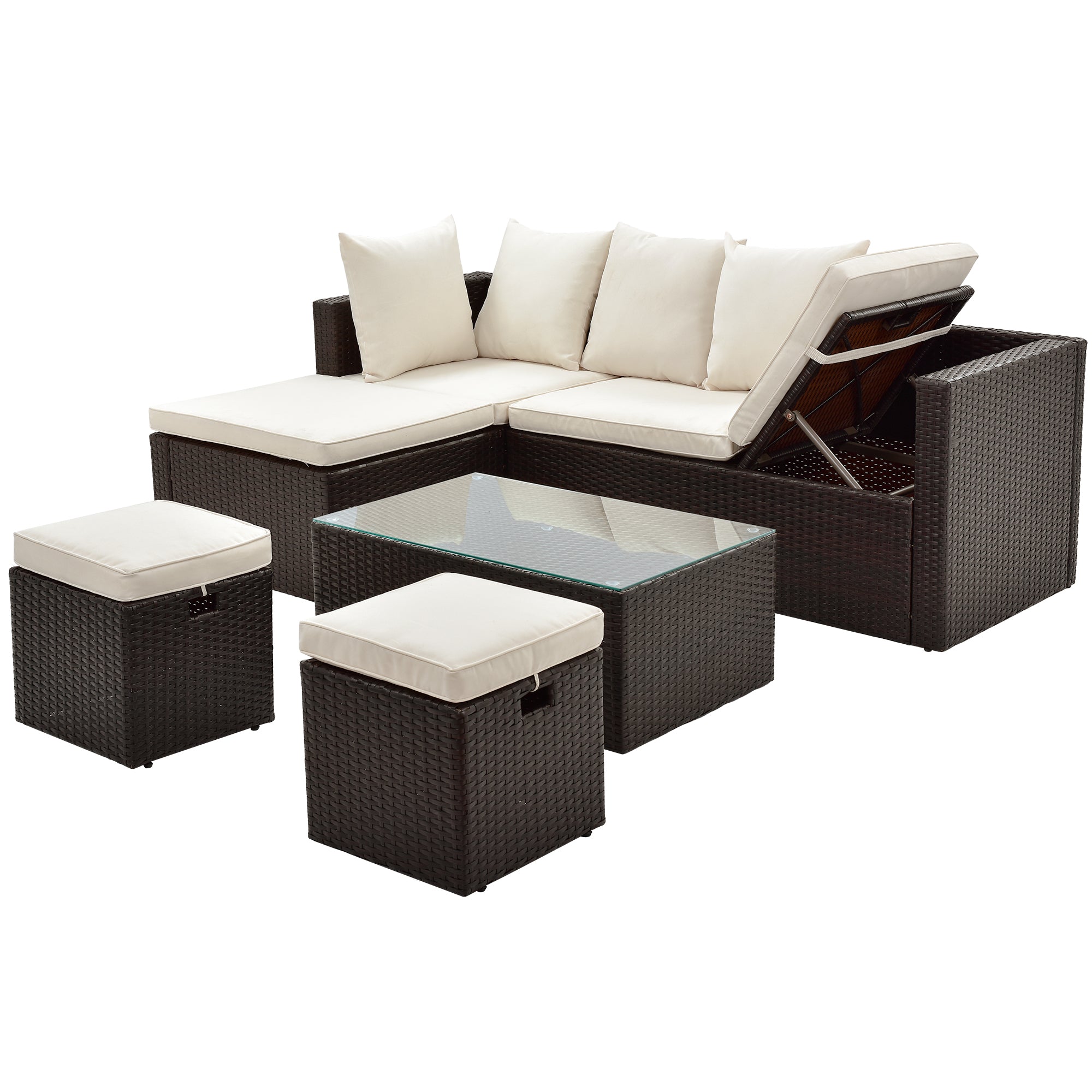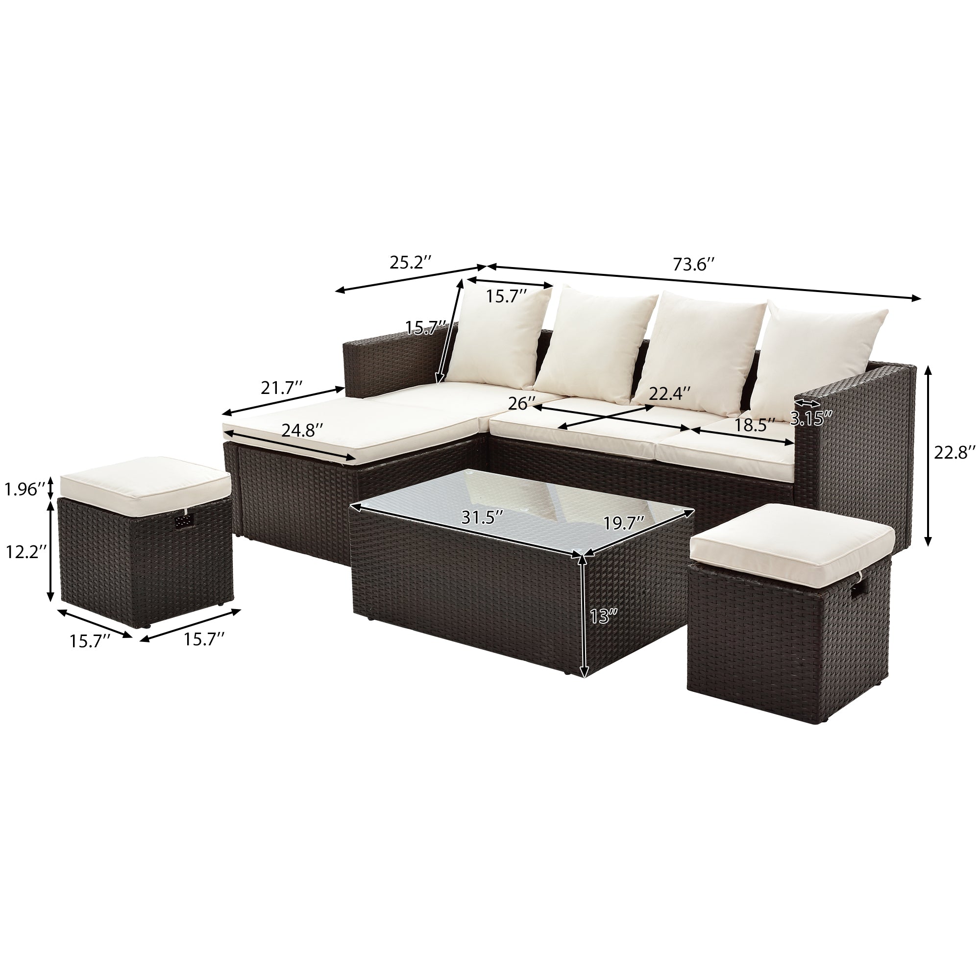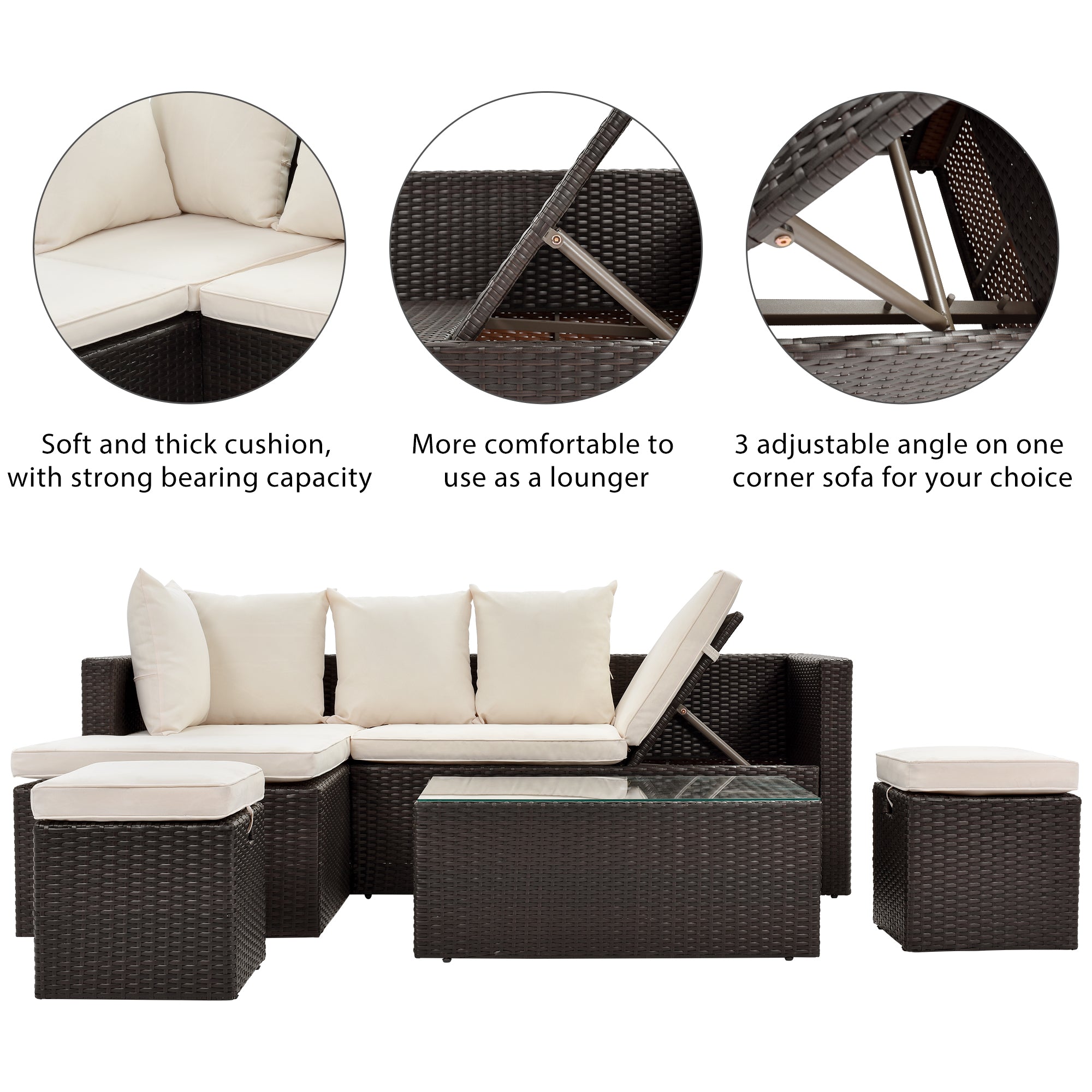 Pieces Set Include: Comes with 1 lounger corner sofa, 1 corner sofa, 1 coffee table with tempered glass top, 2 ottomans, providing relaxation for up to 6 persons.