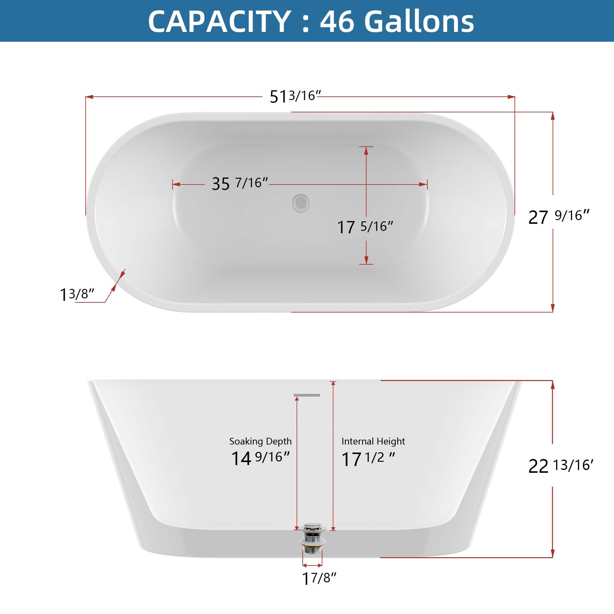 51 inch length and 14-9/16 inch soaking depth of this acrylic free standing tub allows for a deep soak but less space occupation. Streamlined form gently sloping ergonomic design white soaking tub following the natural curves of your body to provide exceptional comfort,full support your back and lumbar to enjoy a relaxing soak in our free standing tub.