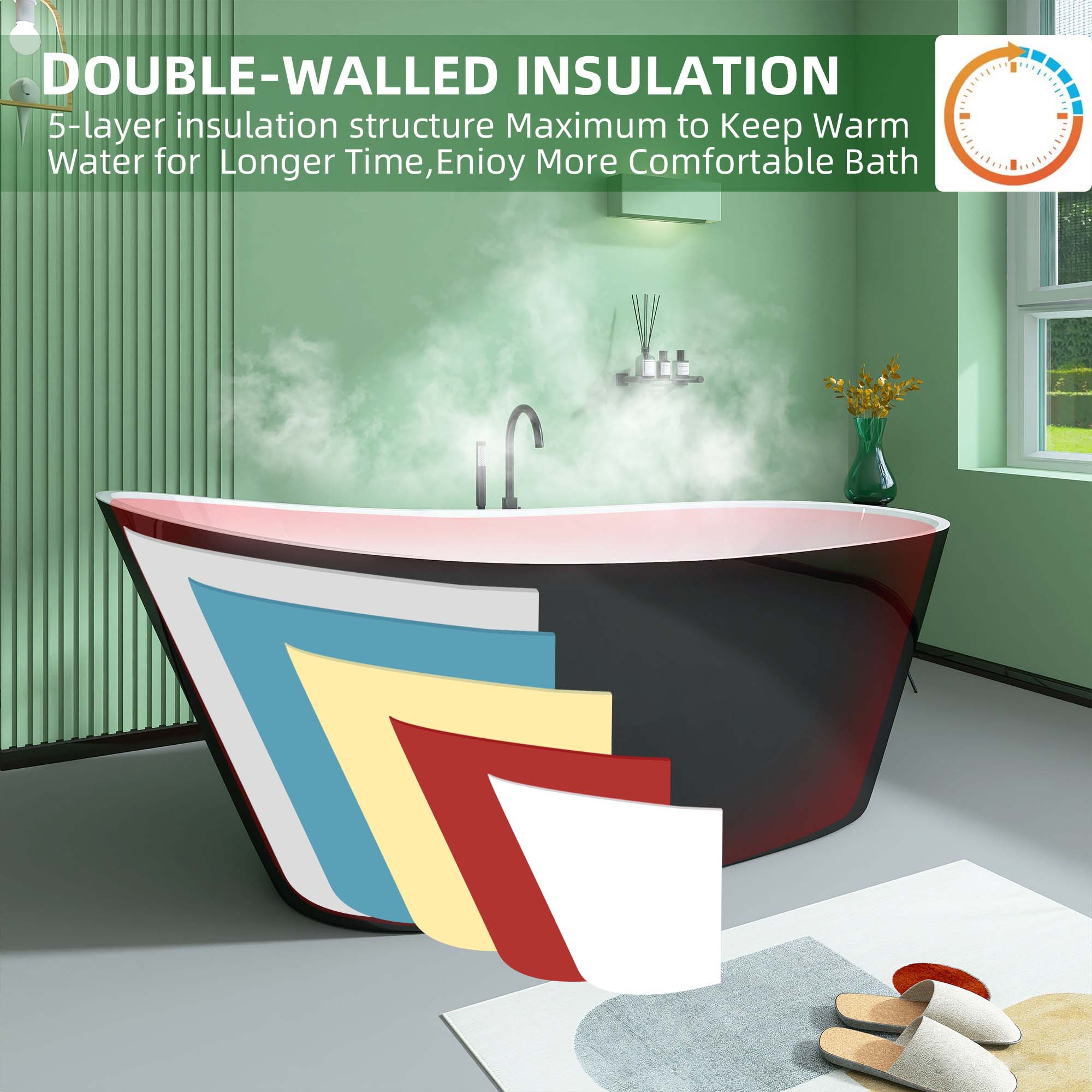 Premium acrylic freestanding bathtub reinforced with fiberglass for long-lasting durability. Double-walled freestanding tub black with multi-layer constriction brings maximum insulation for a longer time. Non-cracking, high glossy, and durable finish make this soaking tub easy to clean and maintain, and resistant to a wide range of household chemicals and cosmetic products.