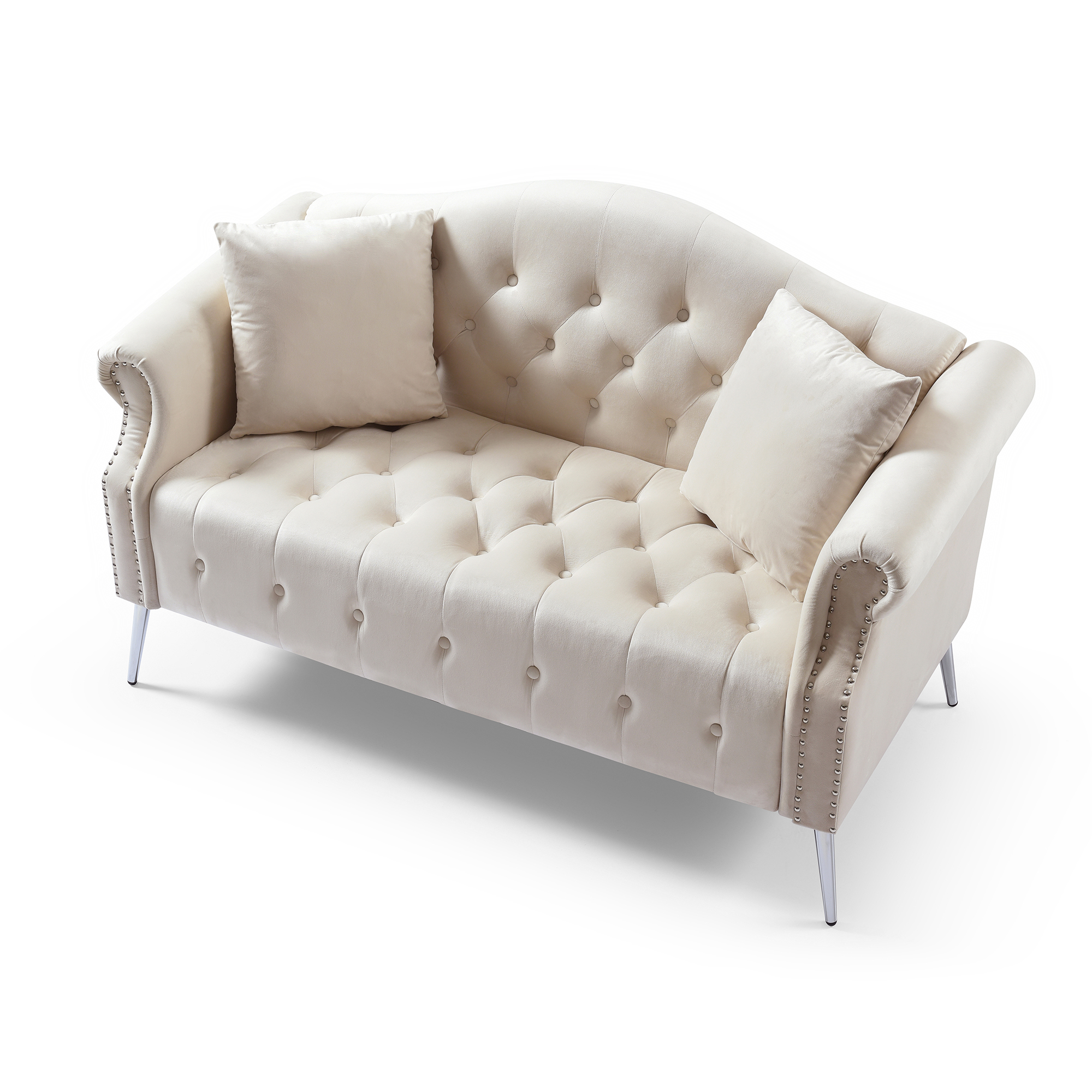 This chesterfield style living room loveseat features with soft velvet,button tufting,nail head trimming,elegantly curved backrest,rolled armrests and silver metal legs.Each nail head is individually applied for a neat and handcrafted touch.High-strength sinuous springs and high-density foam used on both seating and backrest provide long lasting comfort and support.KD design allows for easy delivery to any home or room.Minor assembly is required,just follow our instruction.Packed in two cartons,delivery maybe in different date.Simply spot clean with a damp cloth.