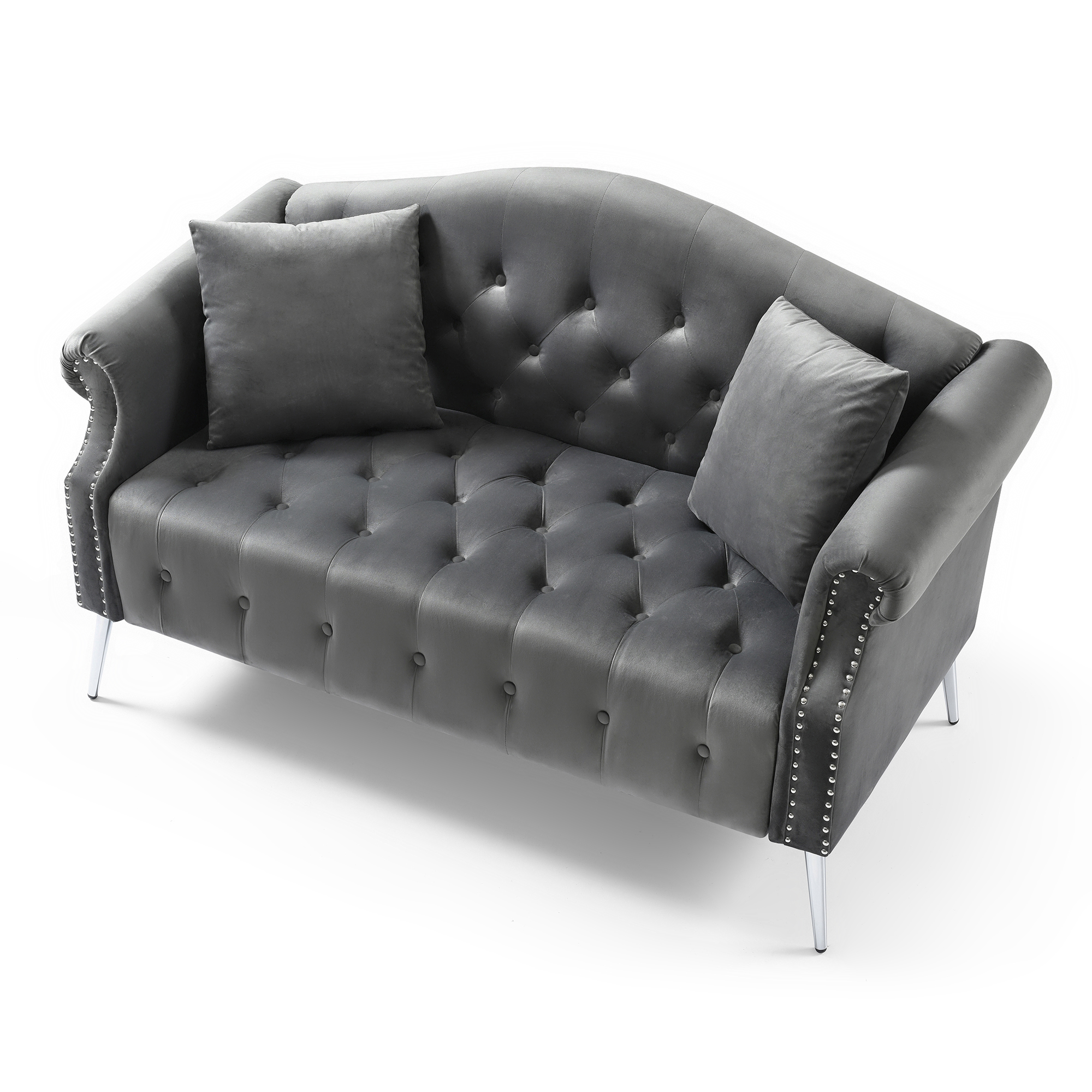 59.4" Width Classic Chesterfield Velvet Loveseat Contemporary Upholstered Button Tufted Nailhead Trimming Curved Backrest Rolled Arms with Silver Metal Legs Living Room Set,2 Pillows Included,Grey