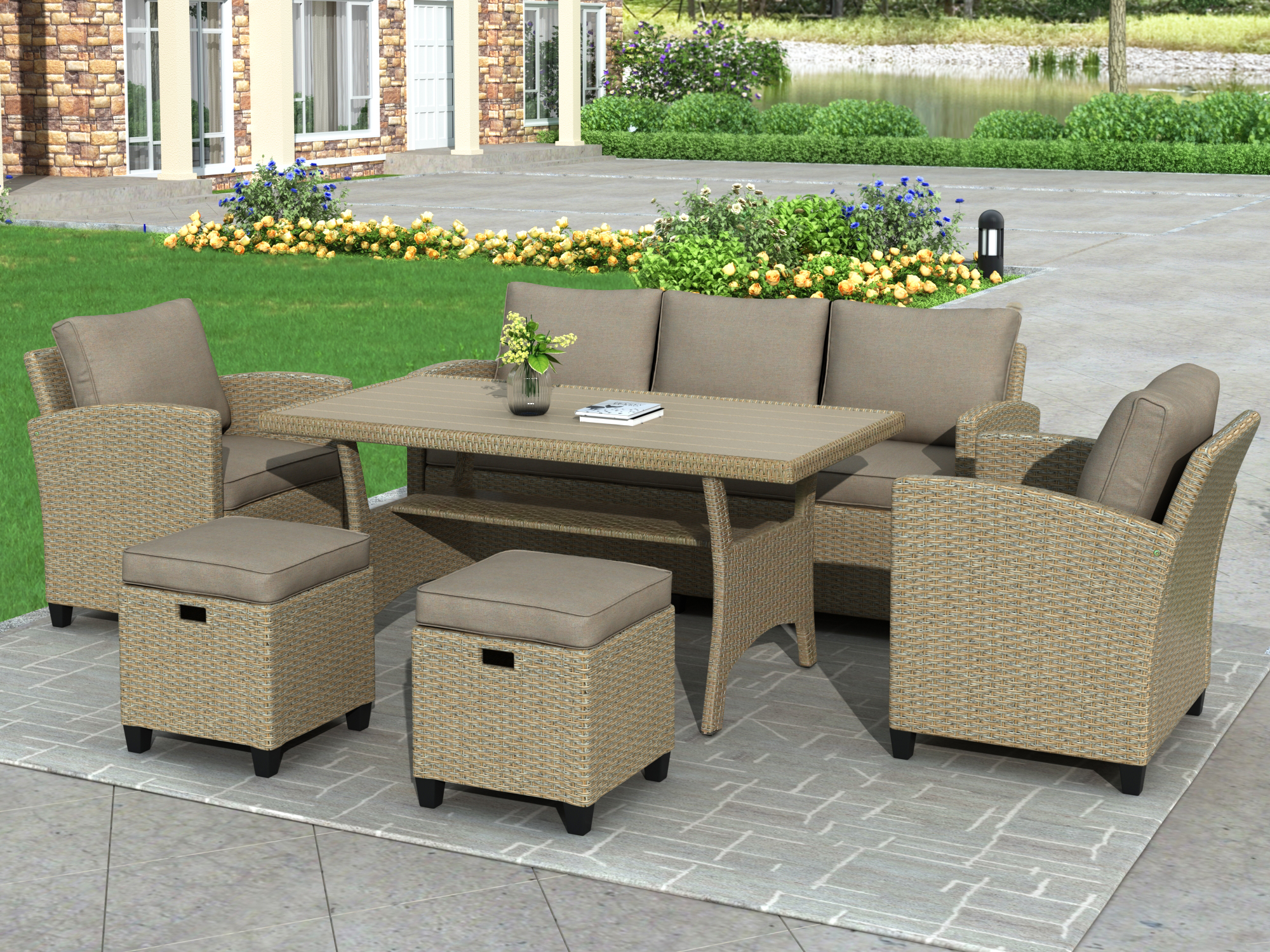 【Beautiful Patio Furniture Set】With the understated, elegant brown cushions and exquisitely wrapped rattan, this set will add a subtle touch of class to any space, instantly transforming your backyard or pool area into your go-to for relaxation and fun, with an aesthetic that will never go out of style.