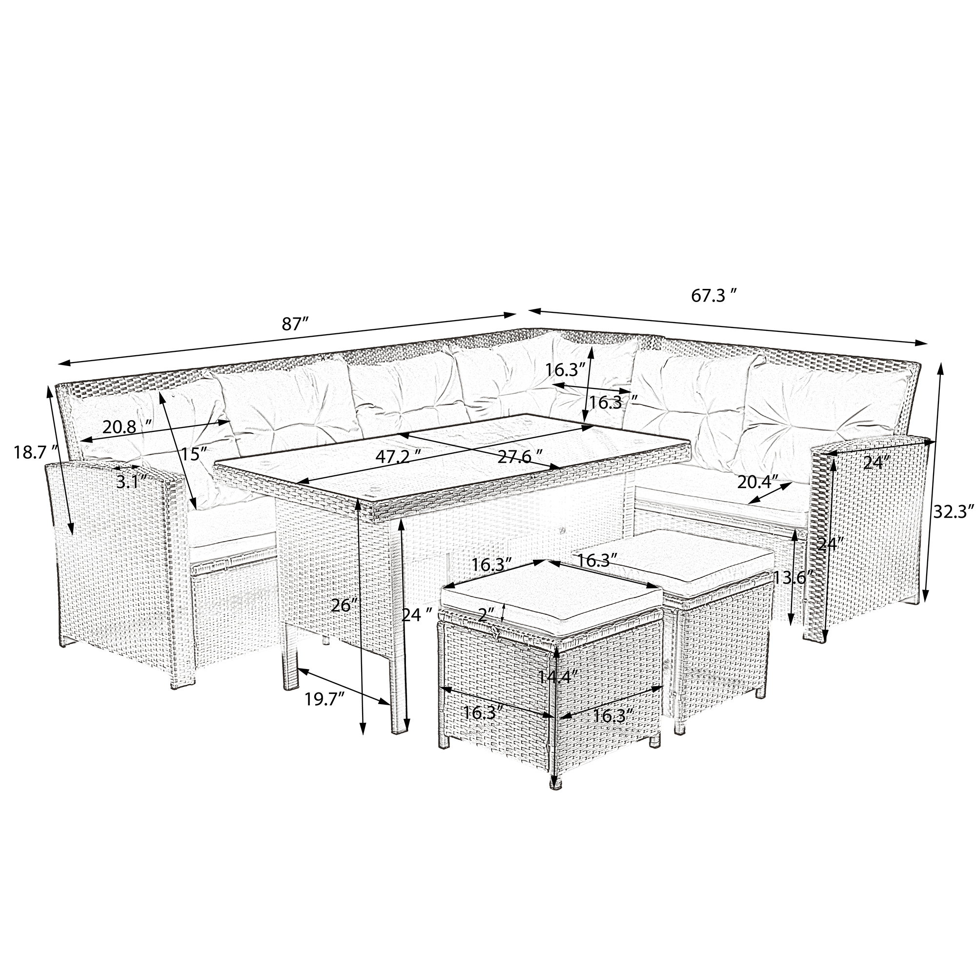 Overall Product Dimension | Sectional sofa: 87 x 20.4 x 32.3 inches (L x W x H) Tempered glass table: 47.2 x 27.6 x 26 inches (L x W x H) Ottoman: 16.3 x 16.3 x 14.4 (L x W x H) Seat cushion thickness: 2 inches Back cushion thickness: 3.9 inches |