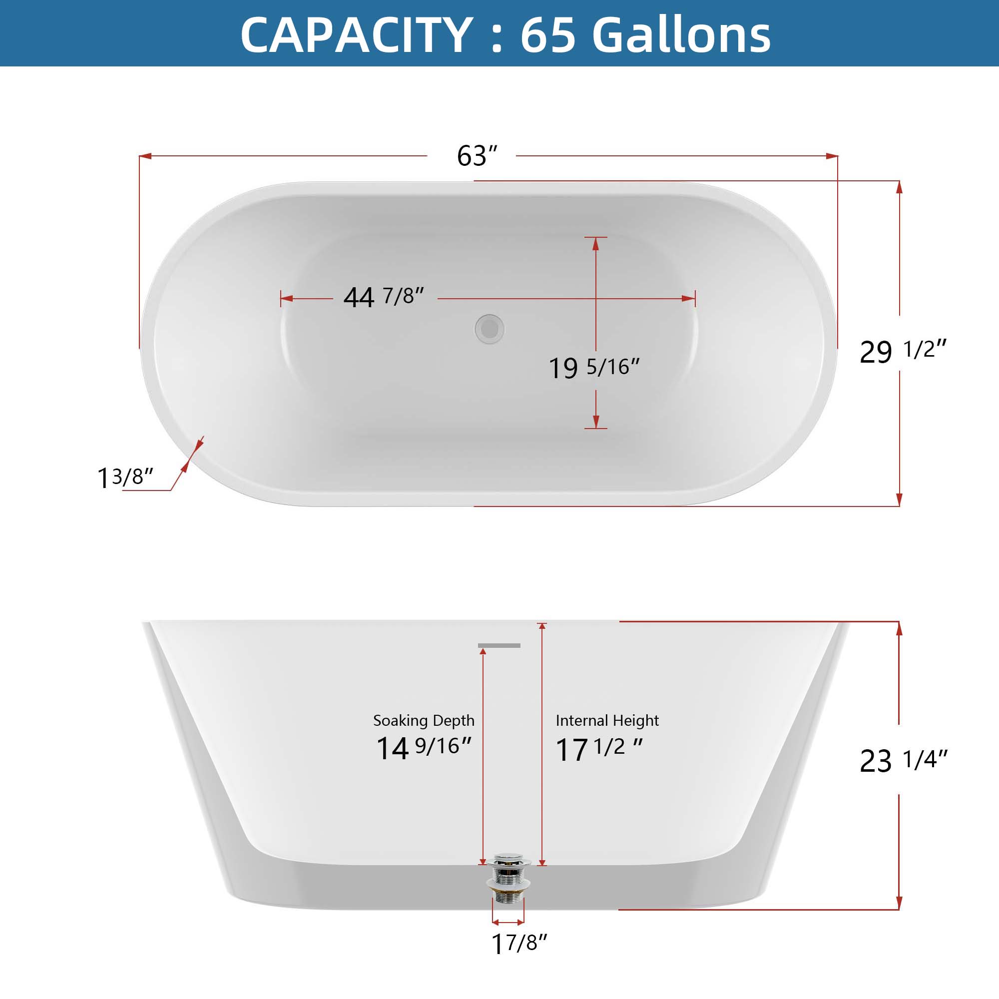 The 63-inch length and 14-9/16 inch soaking depth of this acrylic free-standing tub allow for a deep soak but less space occupation. Streamlined form gently sloping ergonomic design white soaking tub following the natural curves of your body to provide exceptional comfort, and full support to your back and lumbar to enjoy a relaxing soak in our free-standing tub.