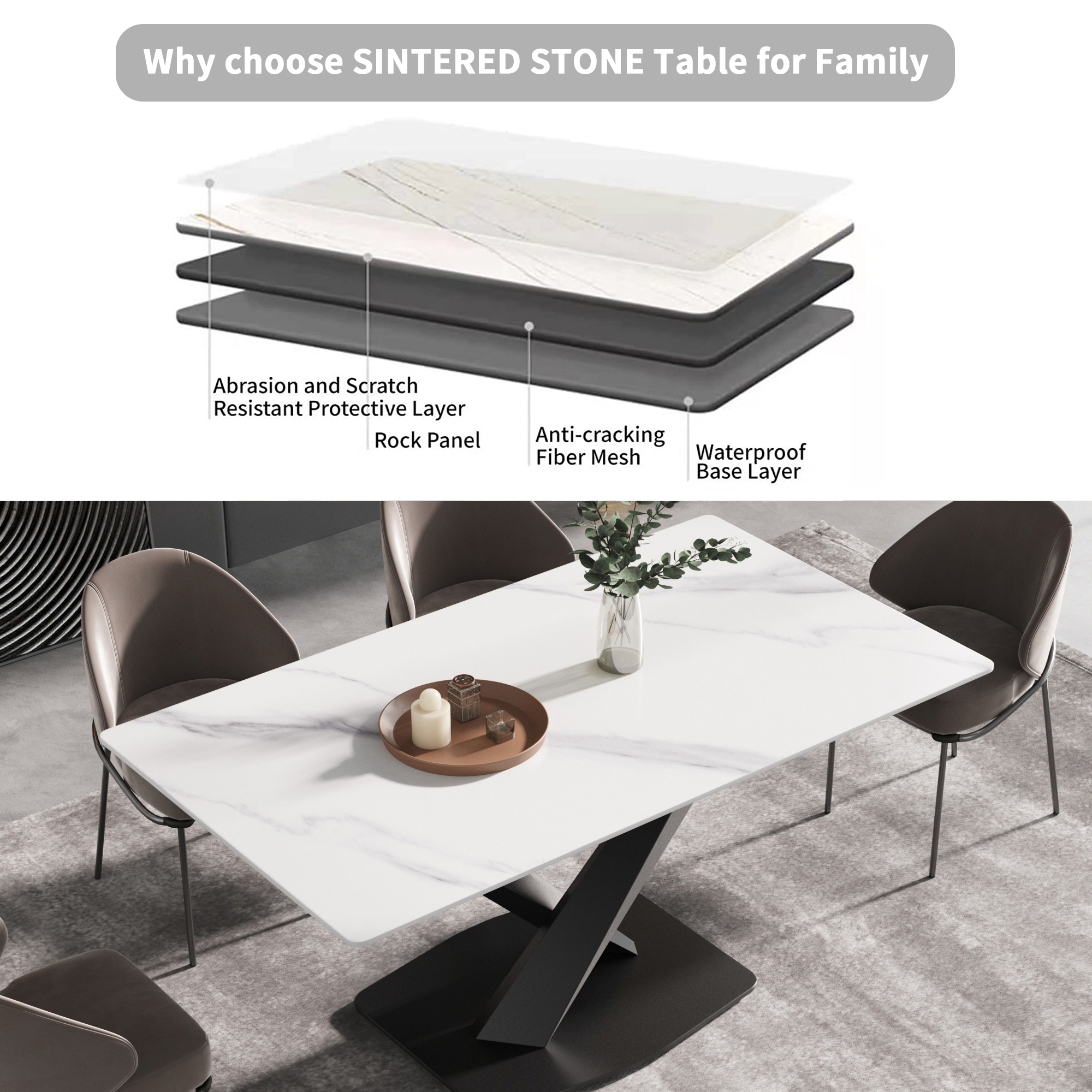 [Strong dining table panel & easy to clean] The table top is one of the strongest surfaces. The 12mm thick desktop is made of sintered stone, which is heated and pressed into a blade shape, providing you with a desktop that can be used for many years. This material can prevent burns, stains and scratches, and has the characteristics of heat resistance, fire resistance and antifouling.