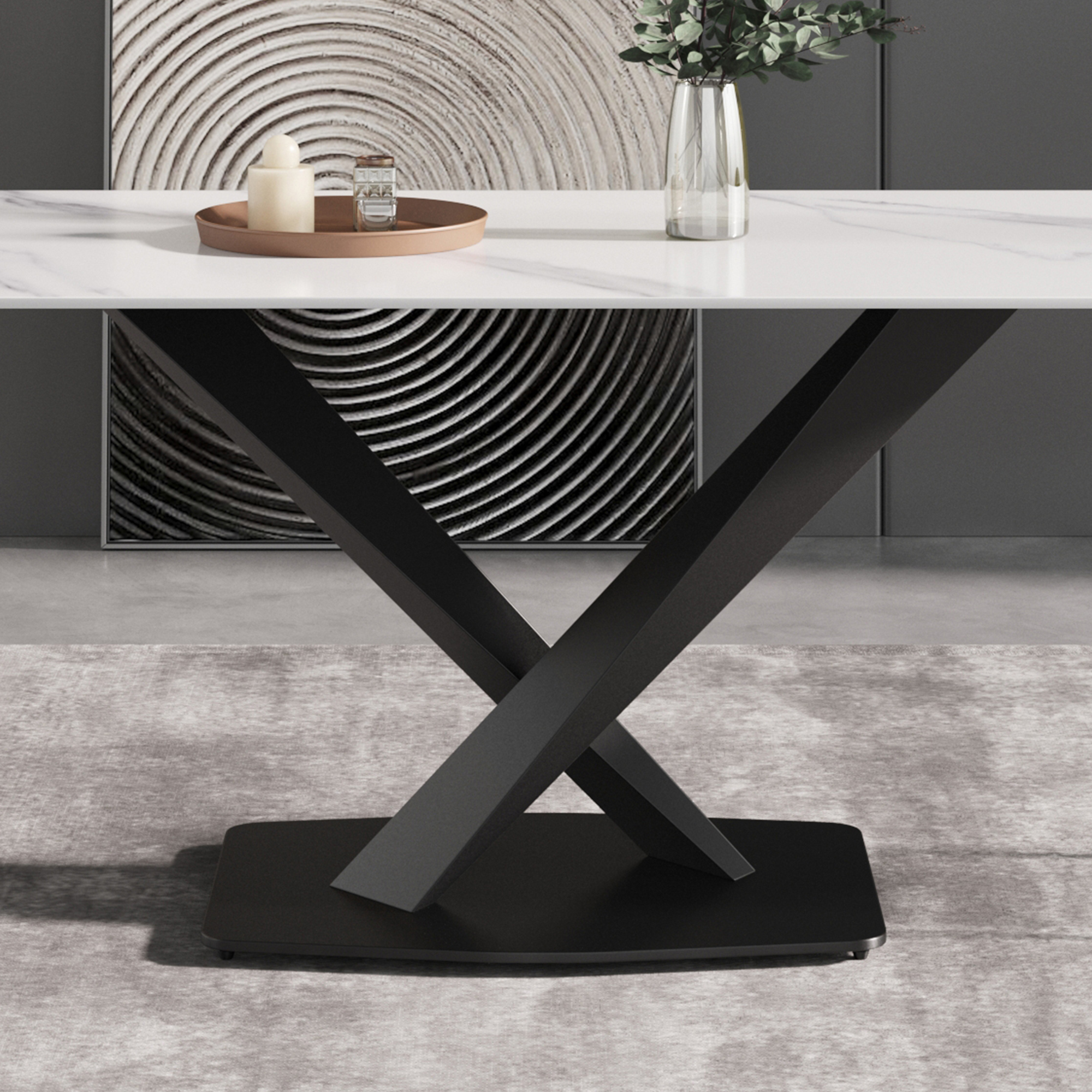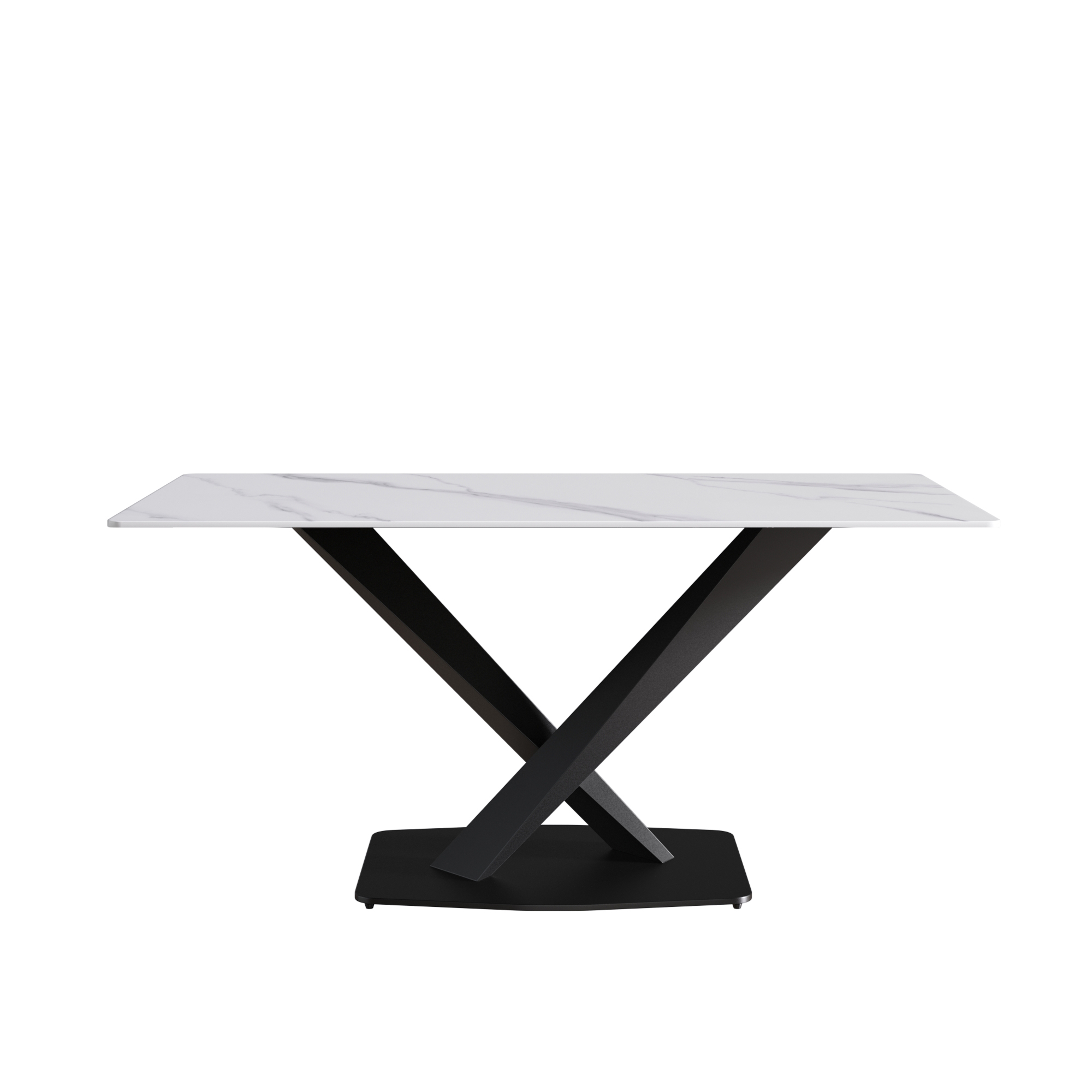 63-inch modern artificial stone white straight edge black metal X-leg dining table -6 people