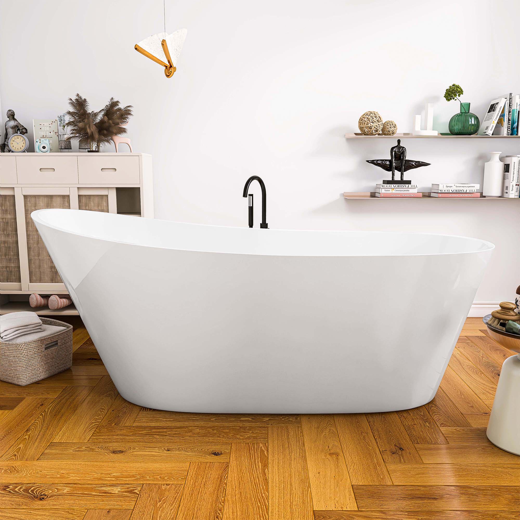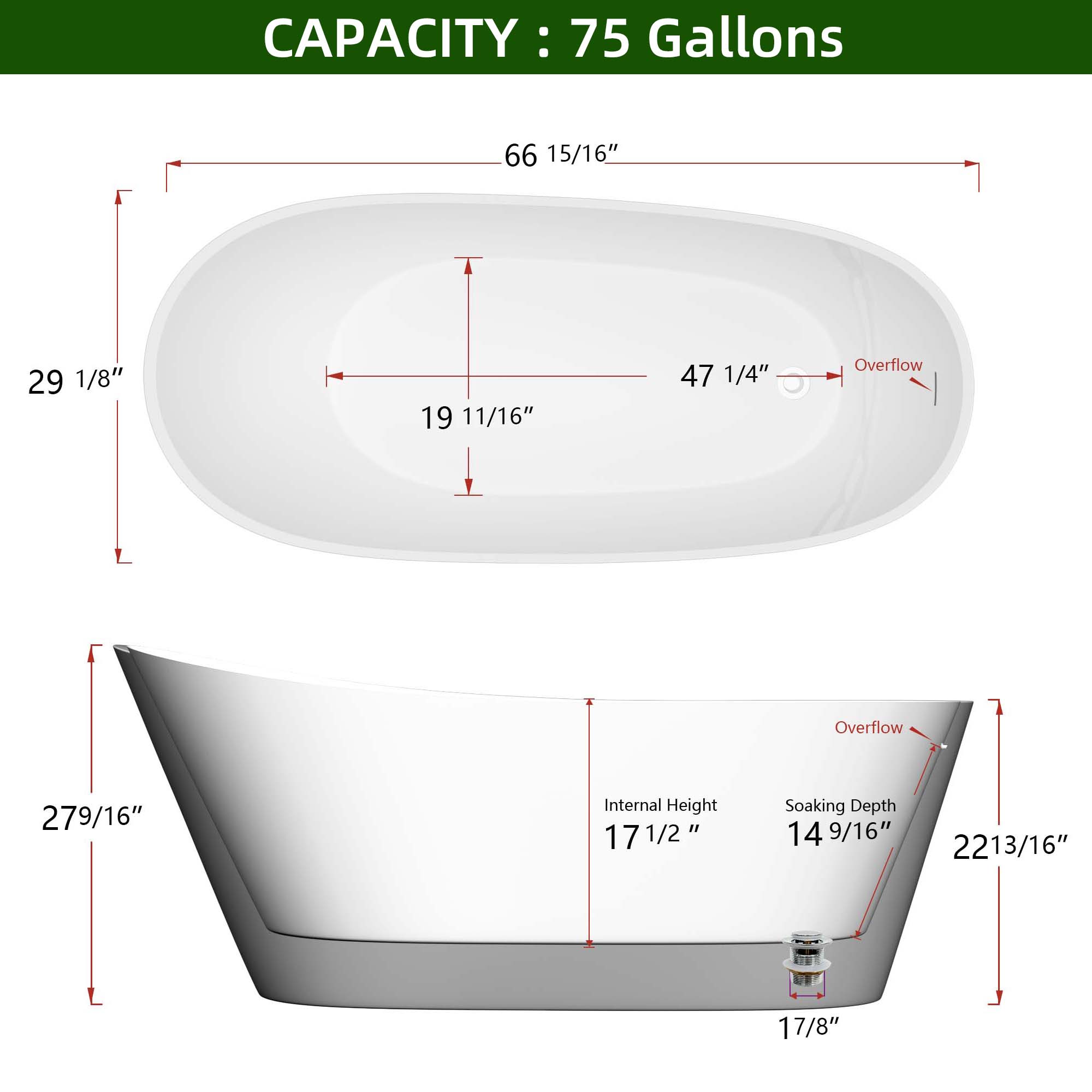 The 67-inch length and 14-9/16 inch soaking depth of this acrylic free standing tub allow for a deep soak but less space occupation. Streamlined form gently sloping ergonomic design white soaking tub following the natural curves of your body to provide exceptional comfort, full support to your back and lumbar to enjoy a relaxing soak in our free-standing tub.