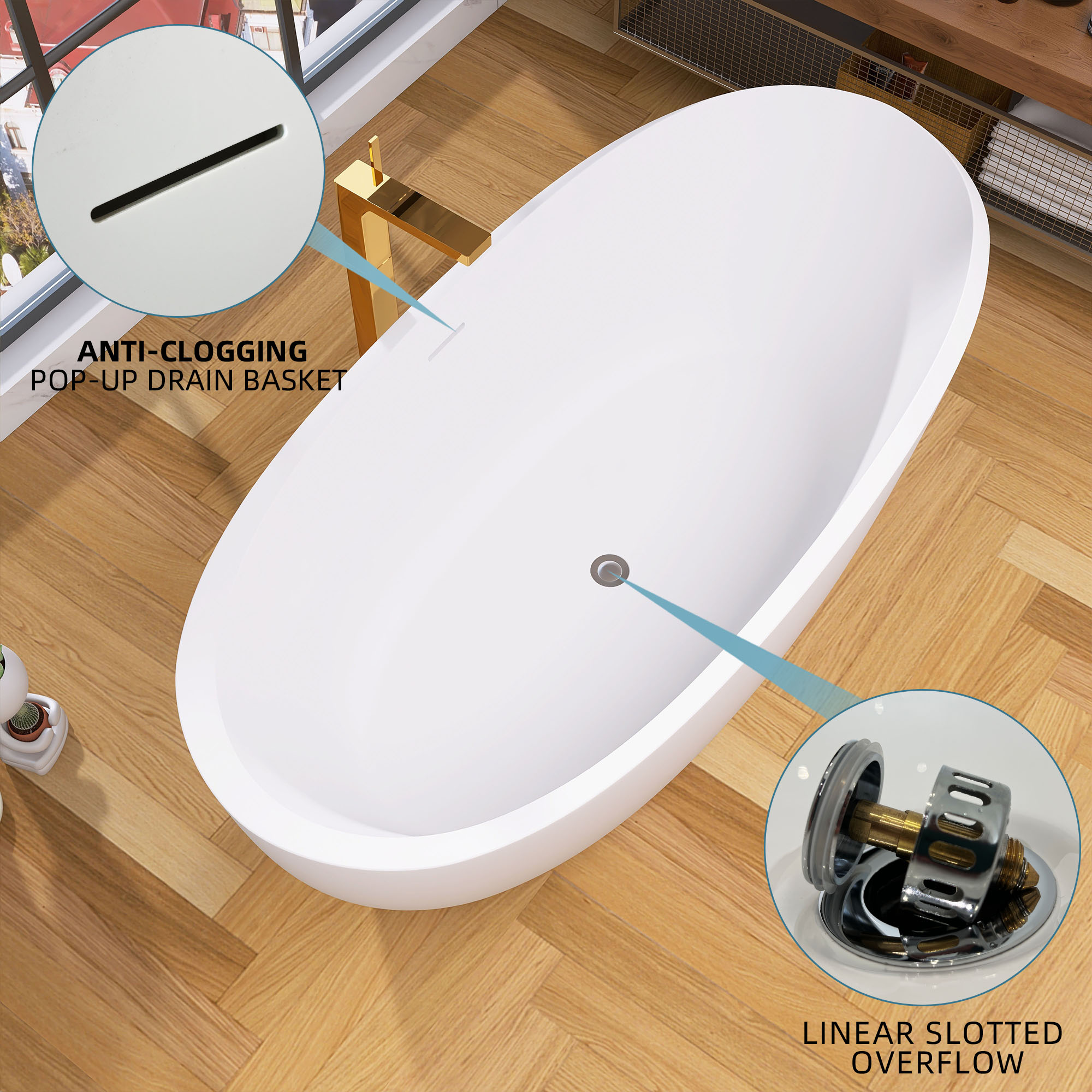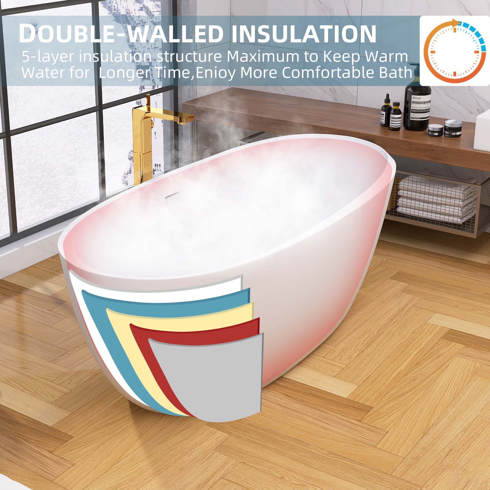 Premium acrylic freestanding bathtub reinforced with fiberglass for long-lasting durability.Double-walled freestanding tub white with multi-layer constriction brings maximum insulation for a longer time. Non-cracking, high glossy, and durable finish make this soaking tub easy to clean and maintain, and resistant to a wide range of household chemicals and cosmetic products.