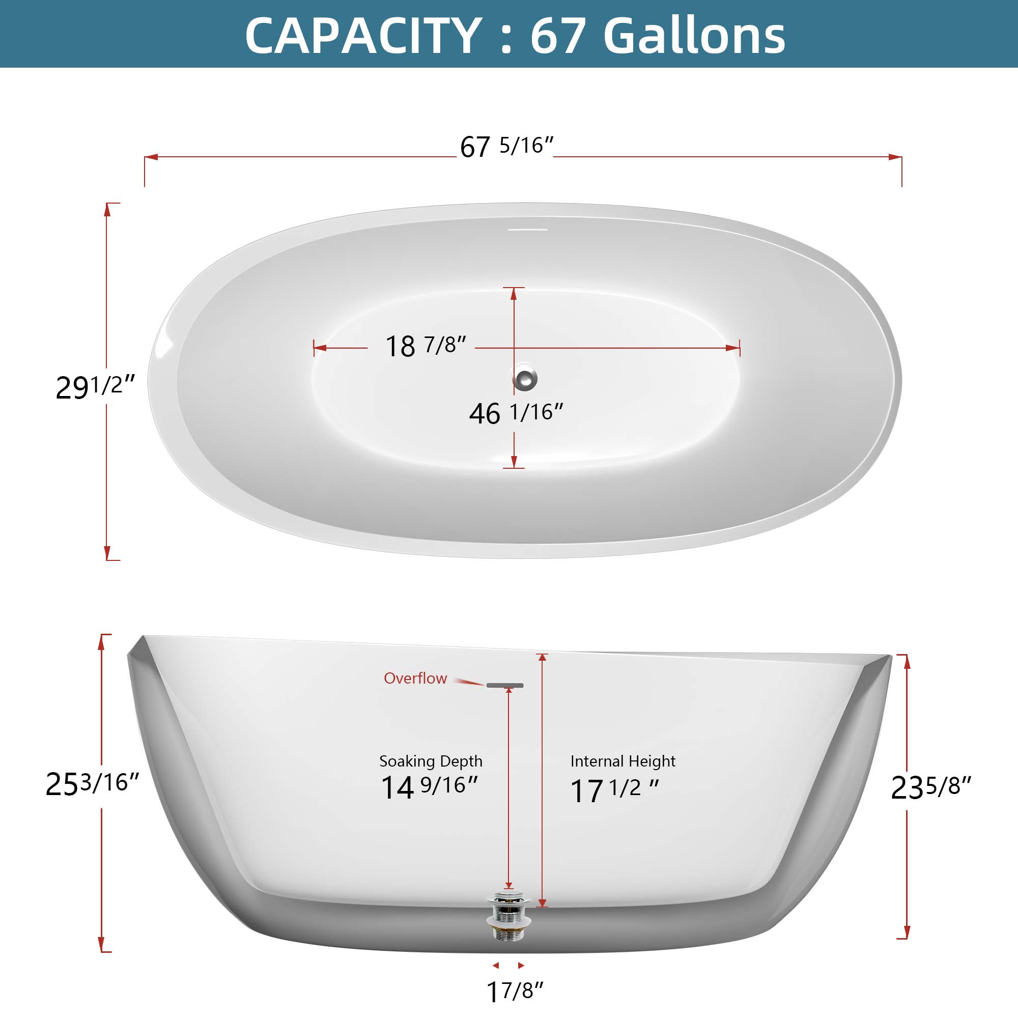 The 67-inch length and 14-9/16 inch soaking depth of this acrylic freestanding tub allow for a deep soak but less space occupation. Streamlined form gently sloping ergonomic design white soaking tub following the natural curves of your body to provide exceptional comfort, and full support to your back and lumbar to enjoy a relaxing soak in our free-standing tub.