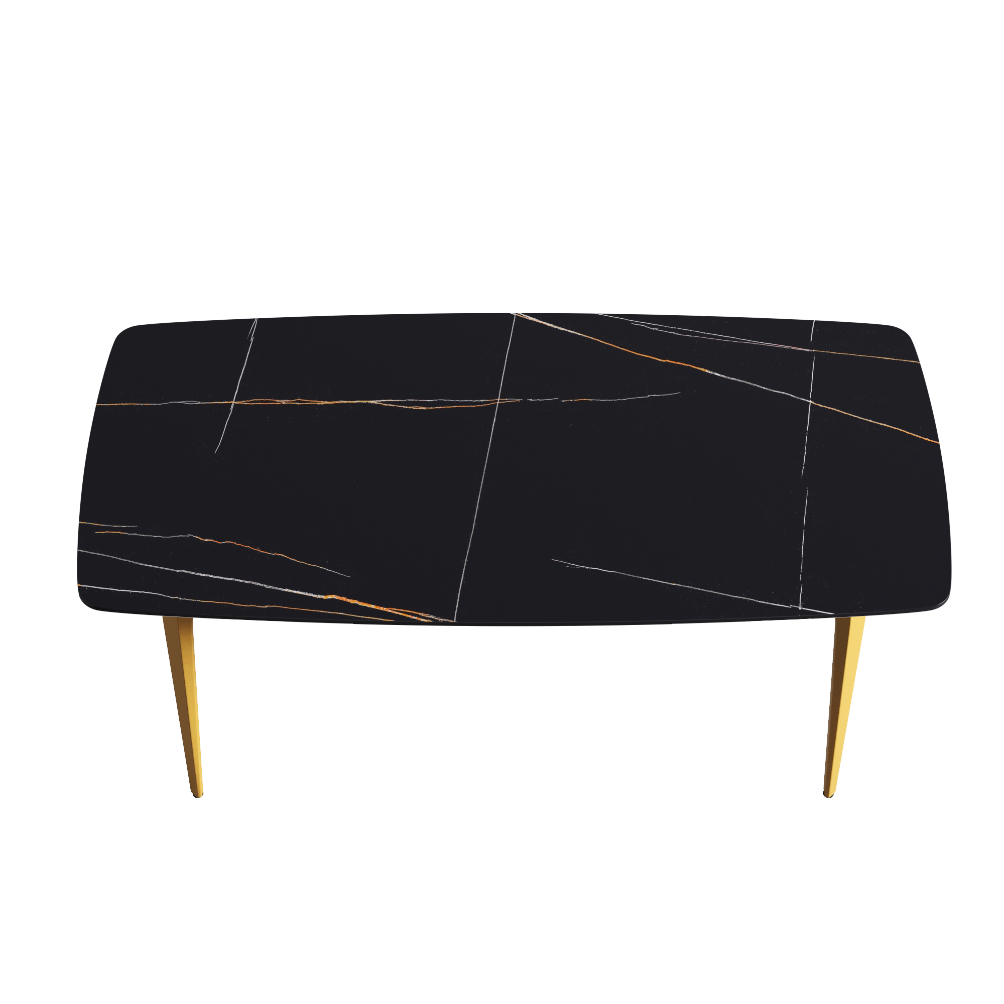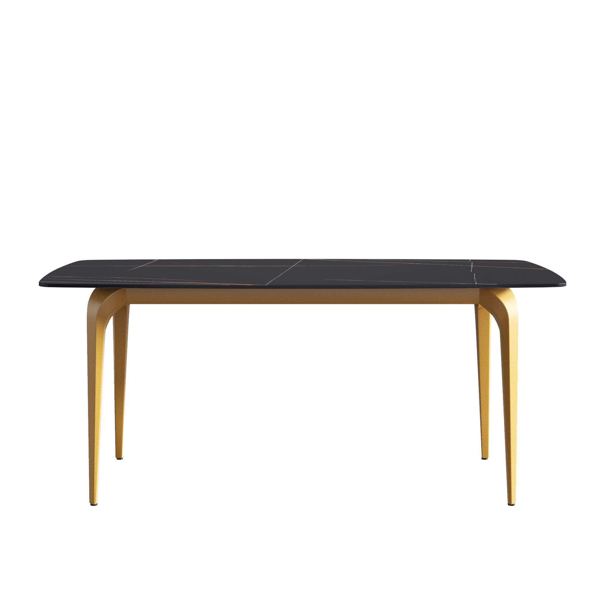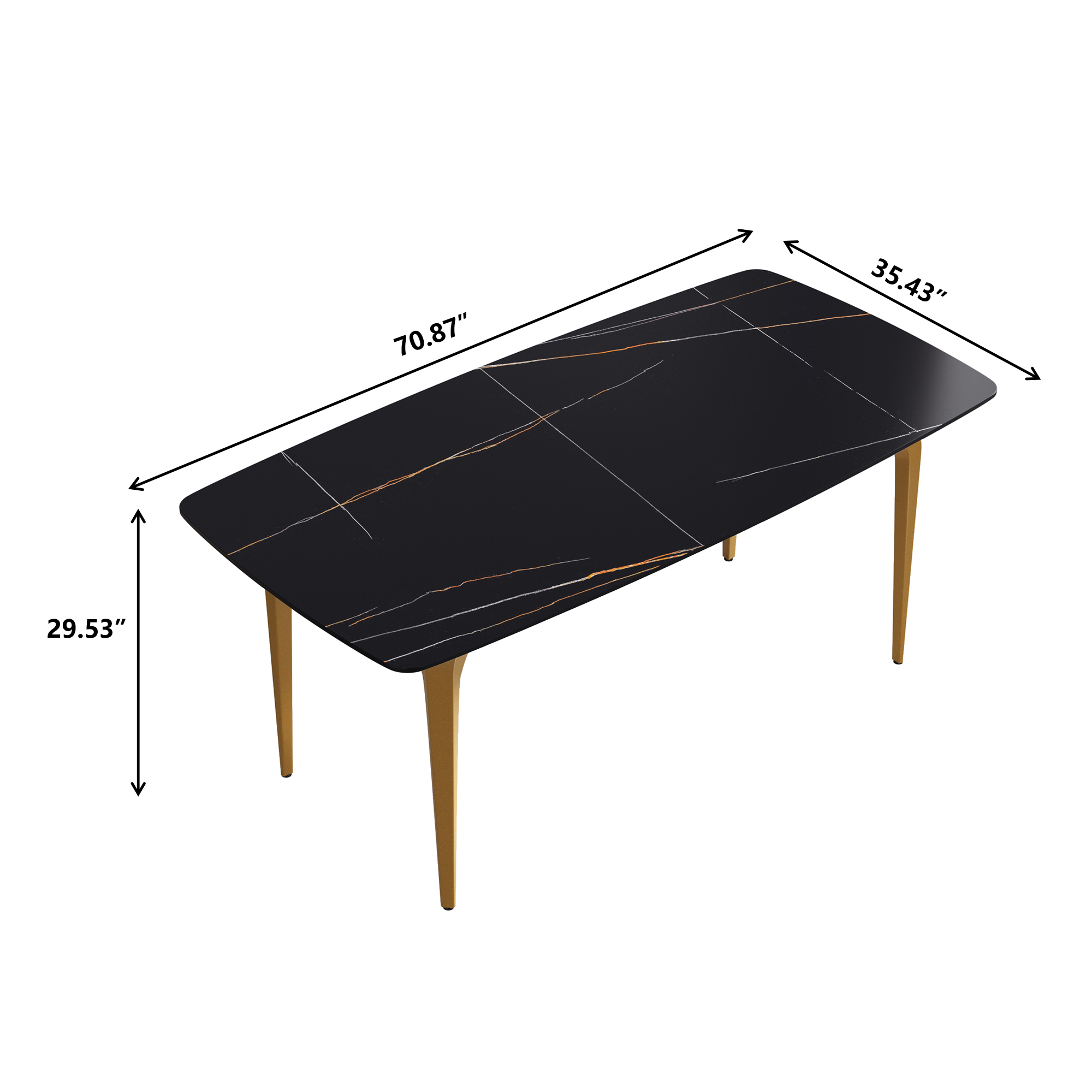 This modern and simple dining table will become the core of your dining, because it is not only the place where you hold dinner and family dinner, but also adds beauty to your space. Undoubtedly, the most striking thing about this dining table is the contrast between the bright panel and the aesthetic texture on the table top. Candlesticks can be placed on the dining table in a large space to create a romantic atmosphere for loved ones and a beautiful environment for family dinners and food ~Product description:[Black simple appearance] This rectangular dining table is made of artificial stone, and it is made into a perfect dining table with exquisite craftsmanship. It is noble and beautiful.[Spacious dining space] This panel is 70.87 inches long and can accommodate up to 6-8 people, which can make the whole family have a pleasant meal.[Rugged dining table panel & easy to clean] Rugged tabletop is another selling point. The 12mm thick desktop is made of sintered stone, which is heated and pressed into a blade shape, providing you with a desktop that can be used for many years. This material can prevent burns, stains and scratches, and has the characteristics of heat resistance, fire resistance and antifouling.[Stable base] This dining table is designed with four legs, and each leg has a contact surface, which has high stability.Product advantages:[Anti-fouling & easy cleaning] Extremely low water permeability can make oil or liquid impermeable, and the desktop can be kept clean only by wiping.[Fire resistance and high temperature resistance] When in direct contact with high-temperature objects or flames, it will not deform, crack or emit gas or odor.[Using natural materials] Natural materials do not release harmful substances, and are 100% recyclable. No radiation, direct contact with food.[High hardness] The 12mm thick panel has high hardness, leaving no trace whether it is knocked or cut with a knife.Warm tip:During the processing of natural materials, there will be subtle changes in color tone, surface texture and texture, and there will be subtle differences with pictures, which is a normal phenomenon. Natural changes are not regarded as product defects.