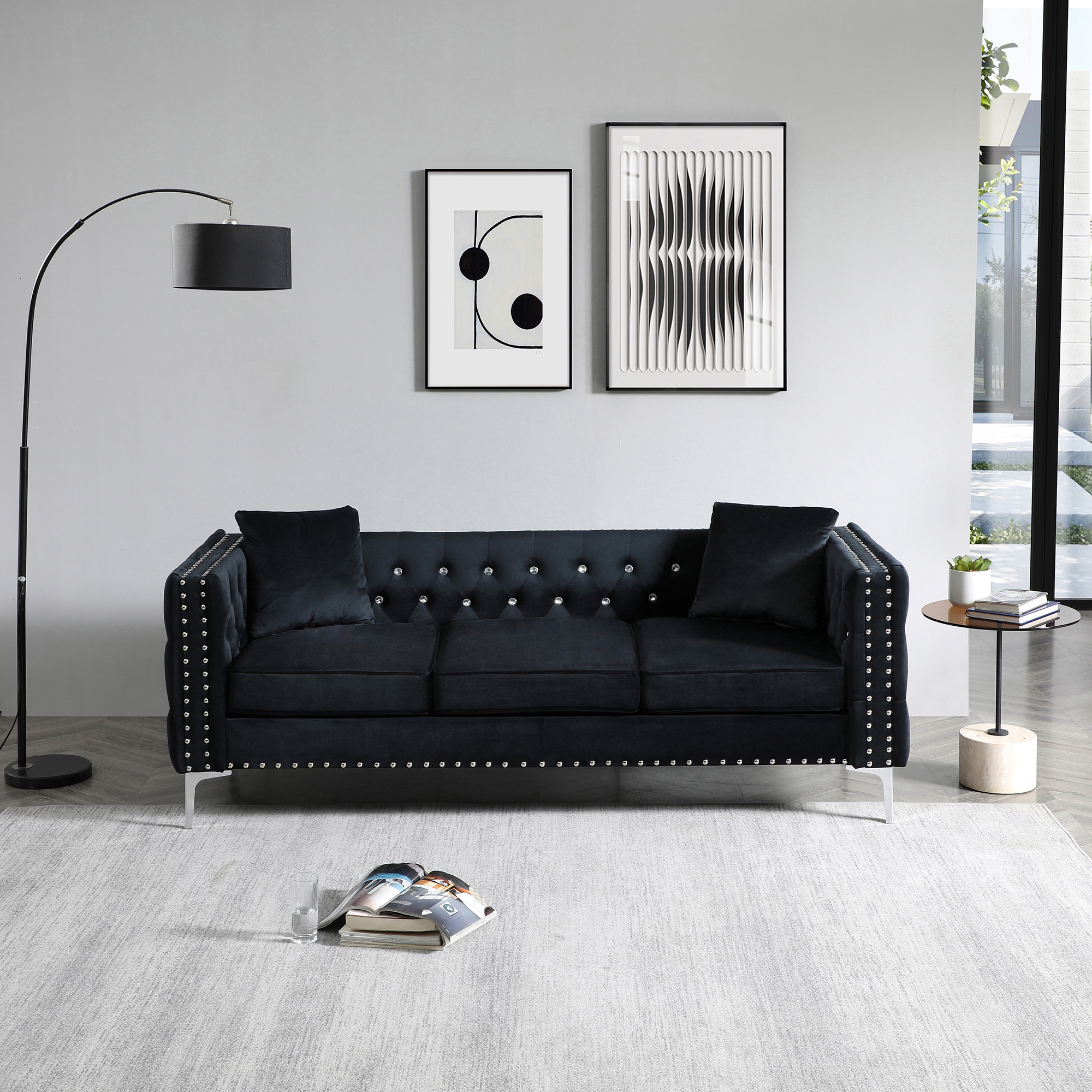 82.3' Width Modern Velvet Sofa Jeweled Buttons Tufted Square Arm Couch Black,2 Pillows Included