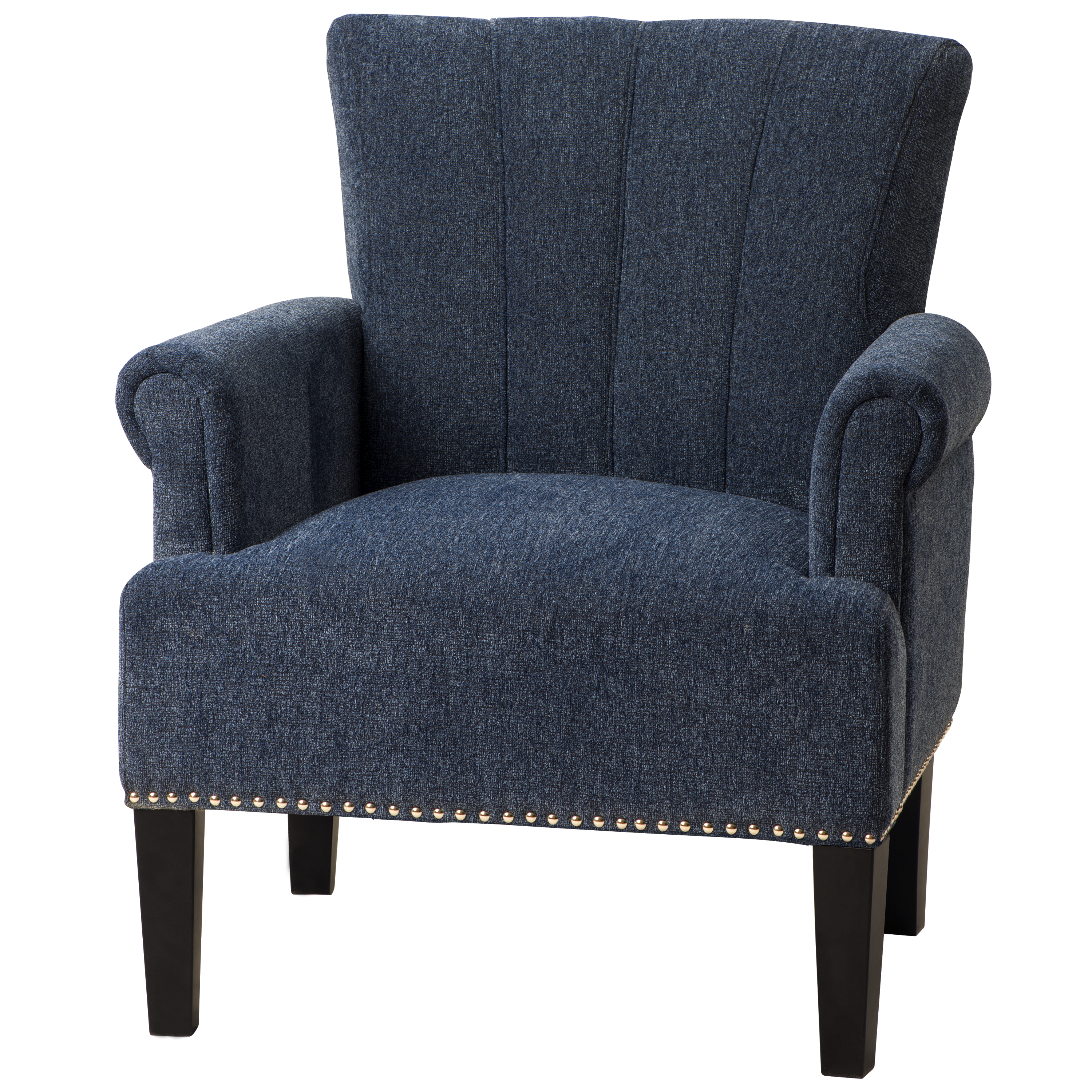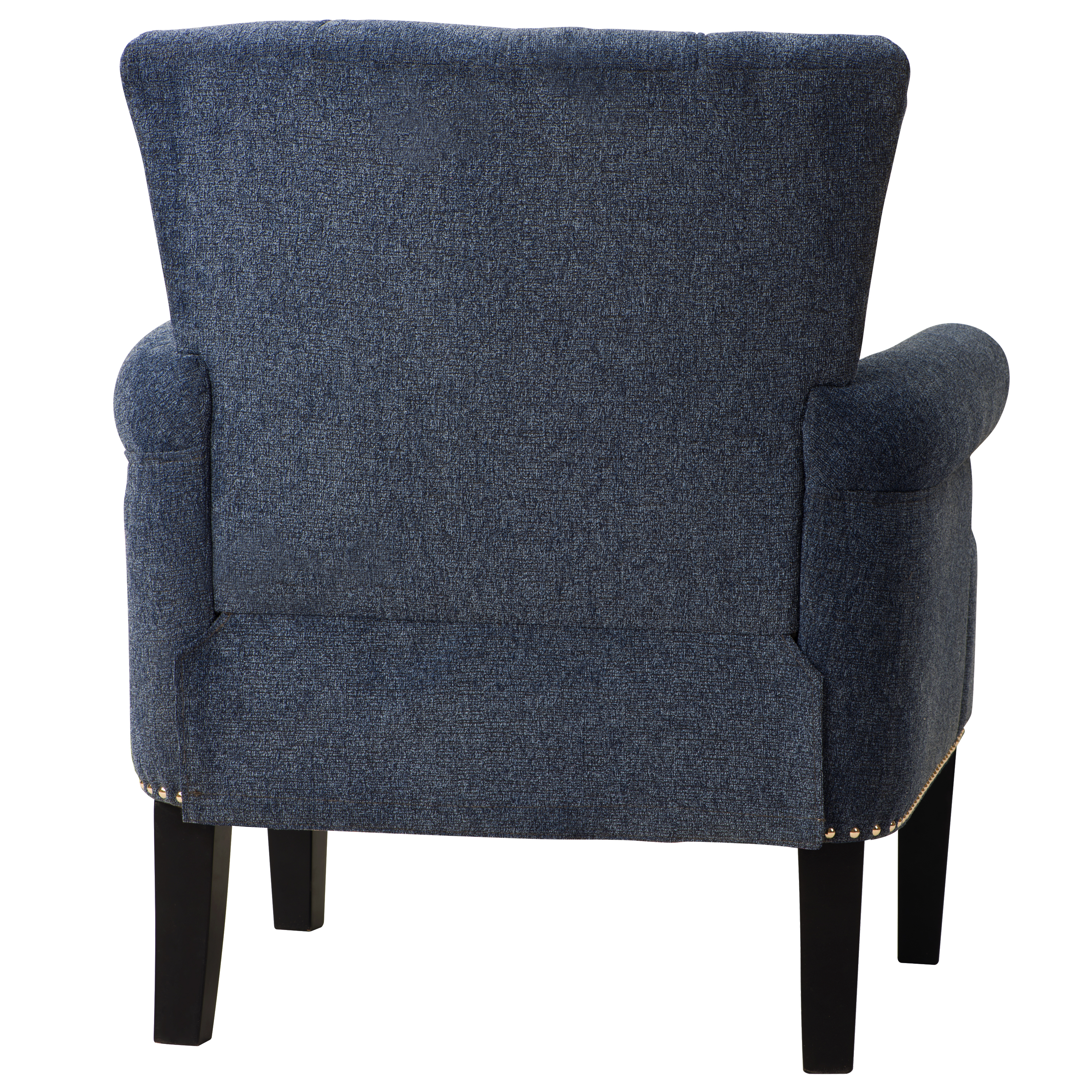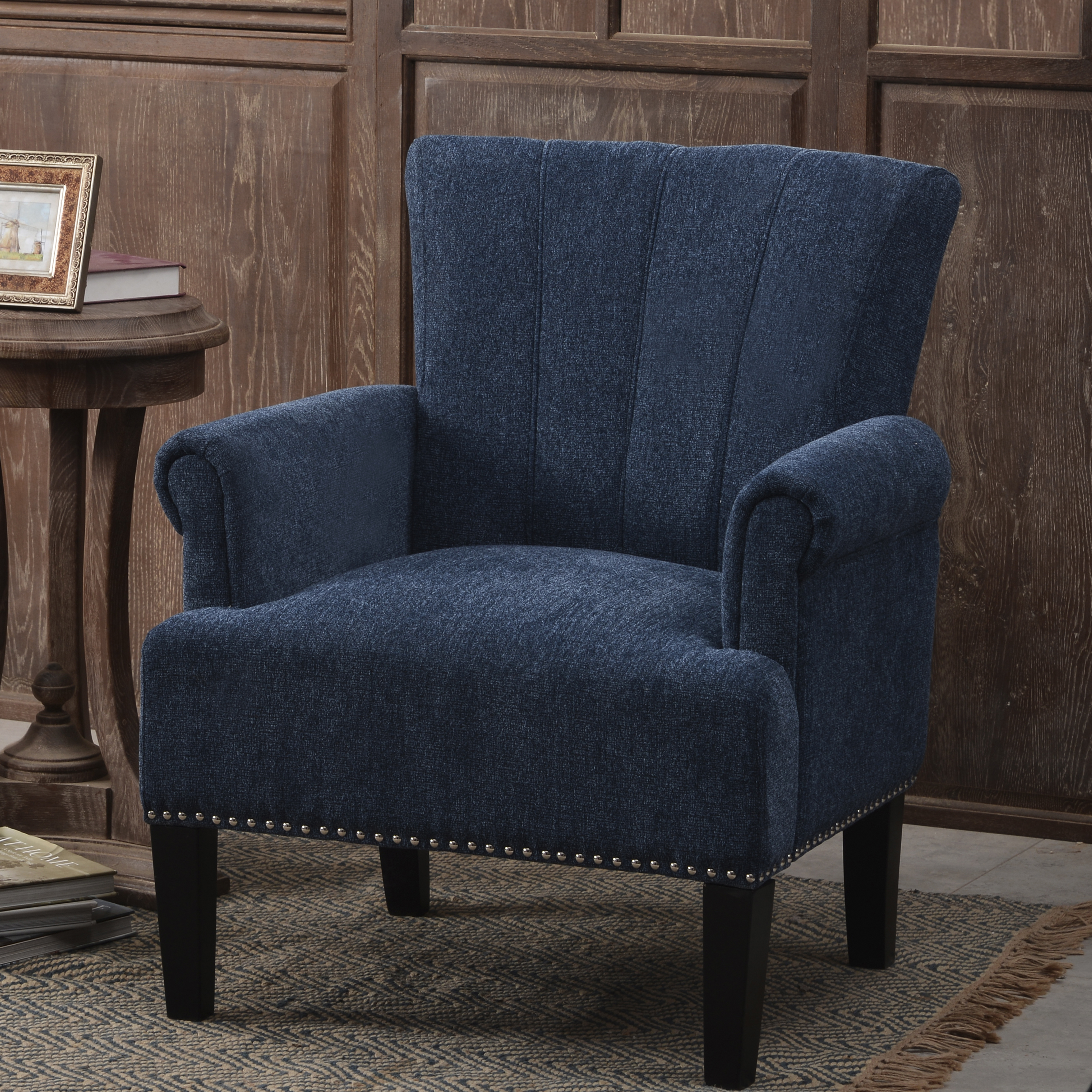 · The chair founded top a solid and engineered wood frame, with tapered, square legs down below. It features a squared back with channel tufting and rolled arms for a traditional appeal.