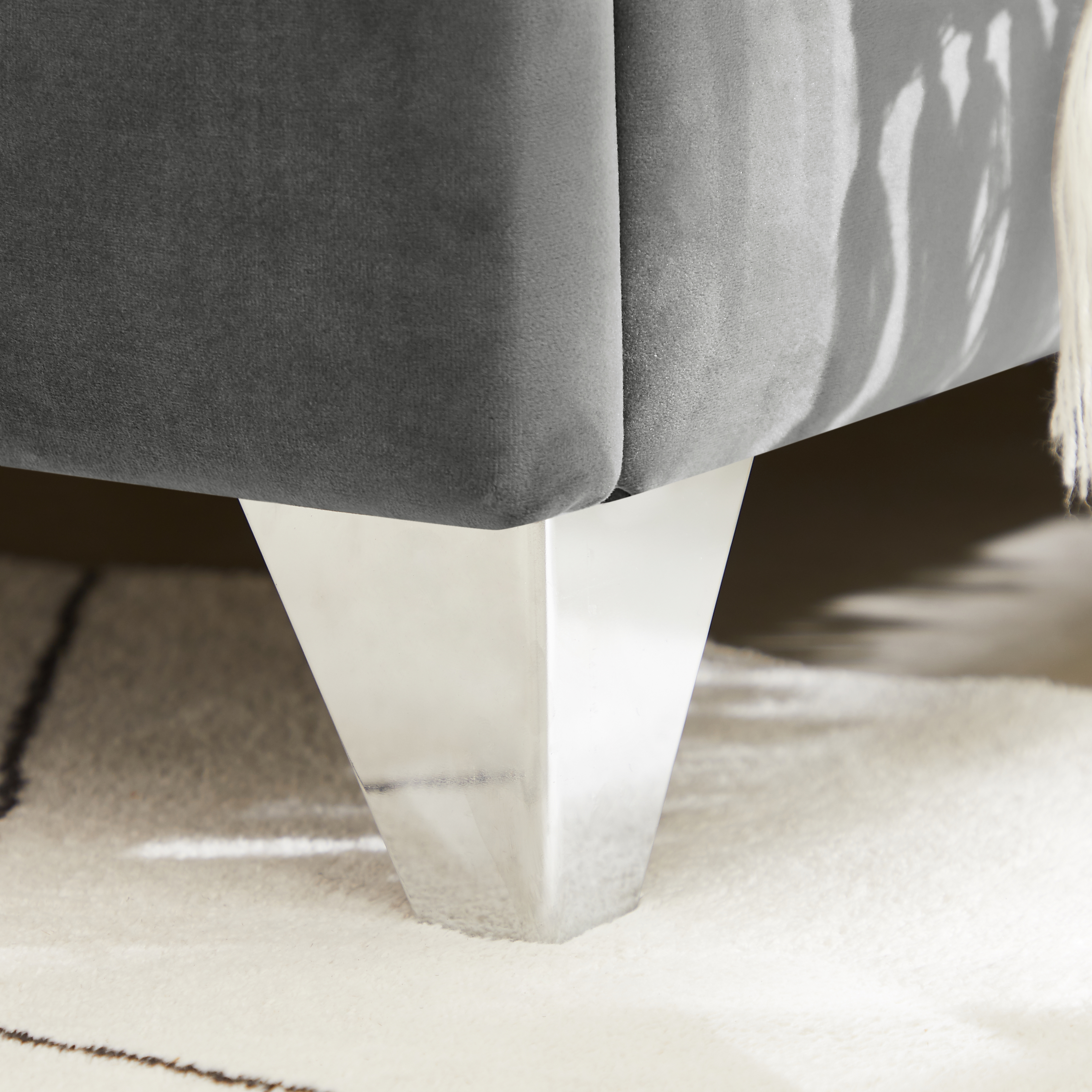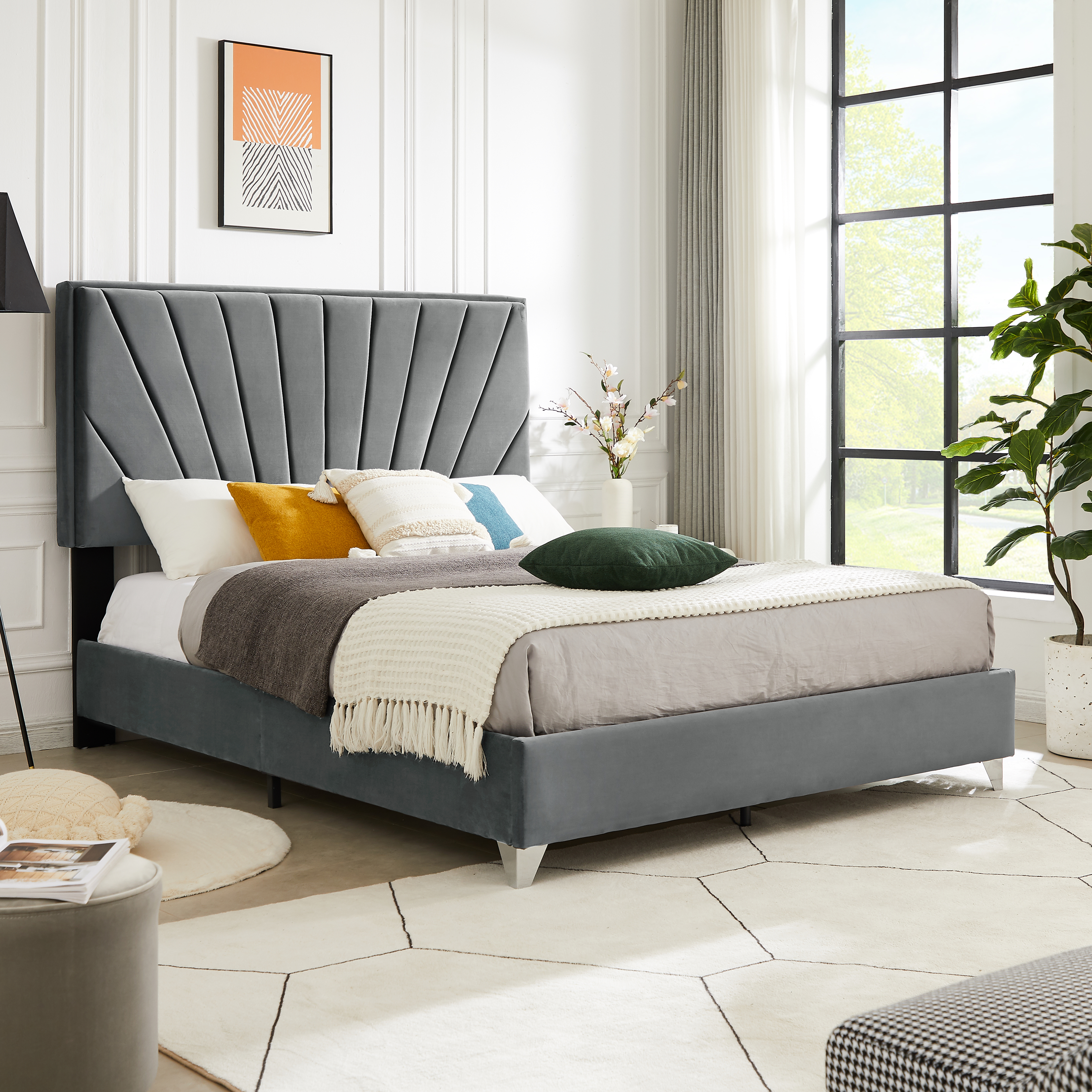 This beautiful Upholstered Platform Bed features an upholstered headboard that adds a contemporary chic look to your bedroom and is filled with thick foam to add extra comfort. Sturdy wood frame construction and a wooden slat system add extra stability and safety.