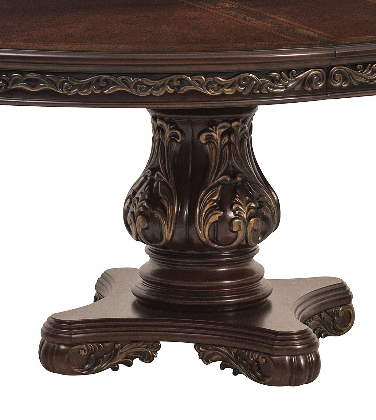 Features:-•Made of cherry and walnut veneer, wood and engineered wood•Cherry finish with gold tipping•Separate extension leaf•Table extends by pulling both ends and dropping in leaf•Seats capacity 6Product Description:-Walking into the dining room that is occupied by this Collection will immediately invoke your love of the traditional aesthetic. Stately from every angle, sophisticated design elements blend to create this beautiful dining table. Burl inset flanks the book-match veneered cherry-finished tabletop. The oval topped single pedestal allows you the flexibility to fit the scale of your dining room. The cherry finish is highlighted by gold tipping that accentuates the traditional feel of the dining table.Product Dimensions:-Overall Dimension: 60" x 60" - 76" x 30.75"HApron to floor: 27"Length of leaf: 16" x 1Listing Includes :- One Round/Oval Dining Table Only.Chairs: NOT INCLUDEDSimple Assembly Required.Shipment Service:Shipping Service Include Curb Side Delivery With Free Lift Gate Service.NOTE : No Inside Home Delivery.Shipment will take around 8-14 Business days