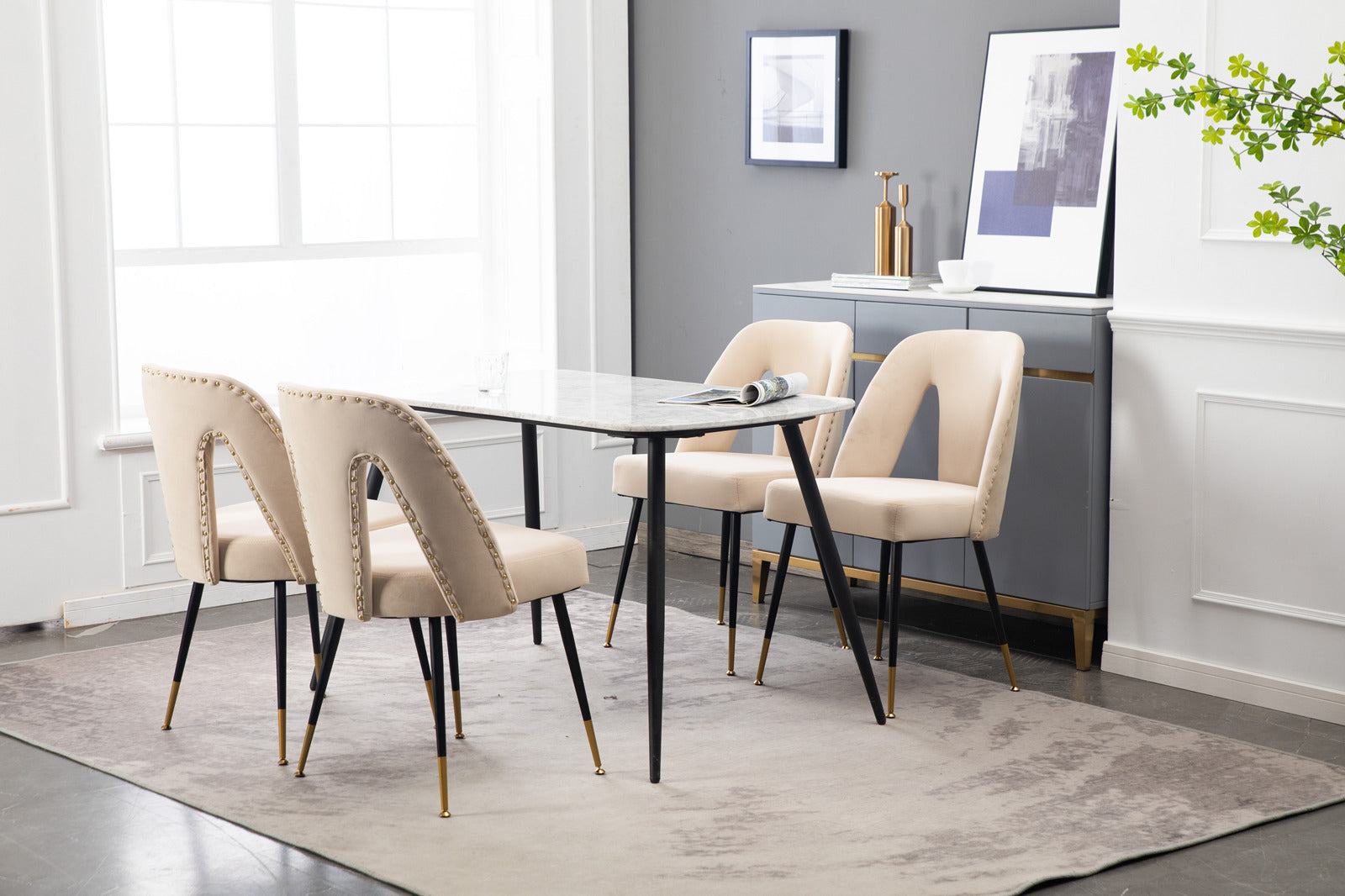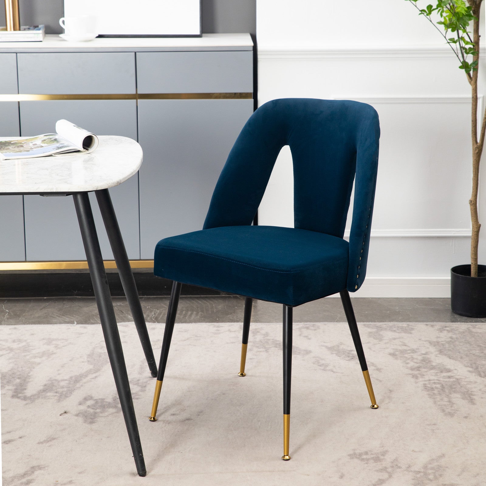 Contemporary Velvet Upholstered Dining Chair with Nail-heads and Gold Tipped Black Metal Legs(Blue/ Beige)