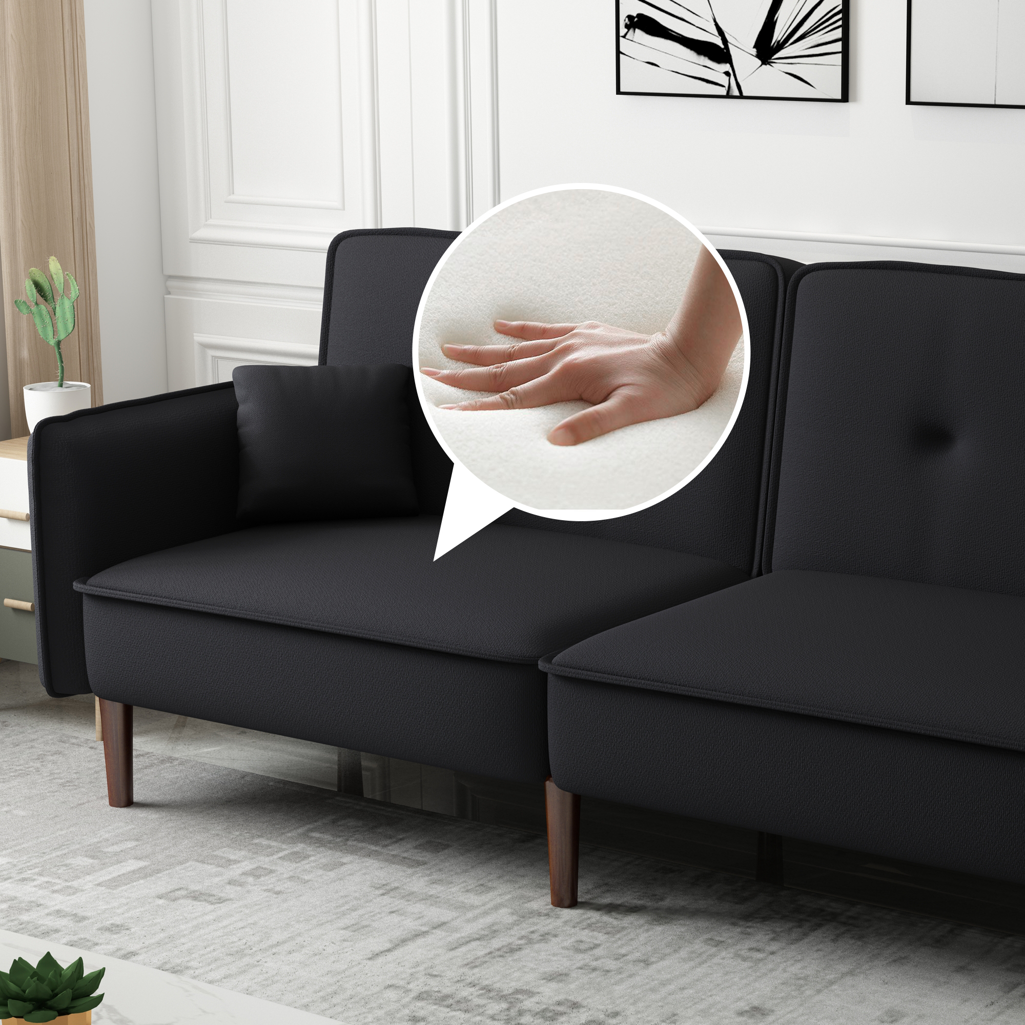 Convertible Sofa Bed with Wood Legs in Cotton Linen Fabric(Black)