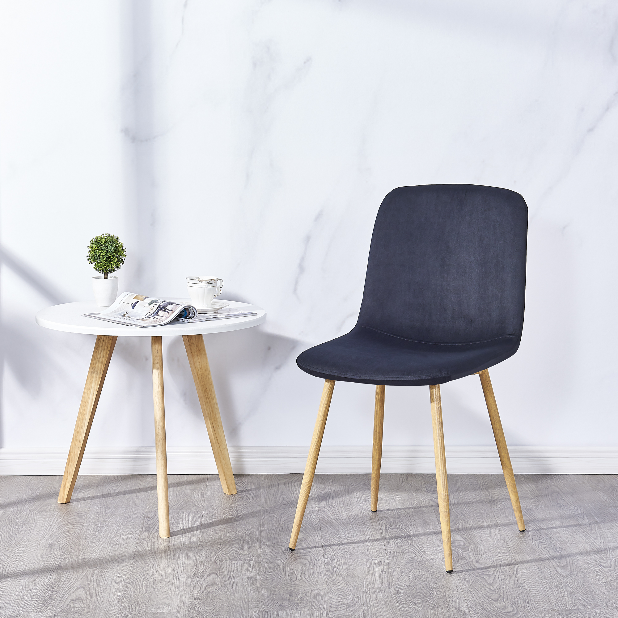 Modern style, leading the trend of fashion and comfort.New technology, metal tube with transfer wood color.(It is steel tube legs, not wood legs)The interior of the fabric is made of sponge, which is breathable and soft.Backrest and seat are made of wood,legs are made of iron tube, light and safe.Suitable for restaurants, cafes, taverns, offices, living rooms, reception rooms.Three colors, easy to pull off any style.Simple structure, easy installation.Product detailsType: dining chairChair backrest: Plywood + sponge + velvet; Leg: heat transfer printing tube.Color:BlackPacking: 1 PC/1 CARTONOverall packing dimension: 22.83 "x 18.9" x 20.47 "(L x W x H)