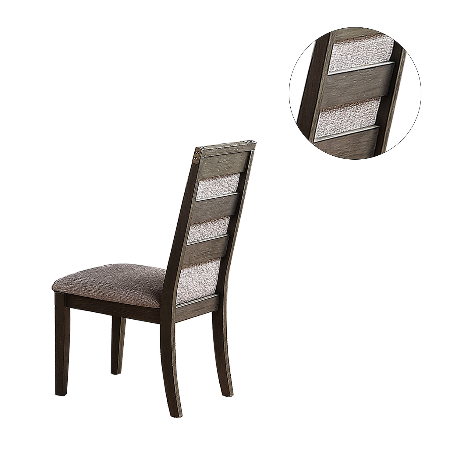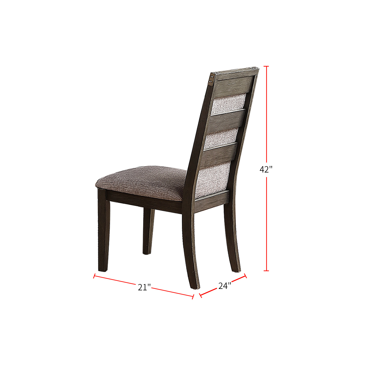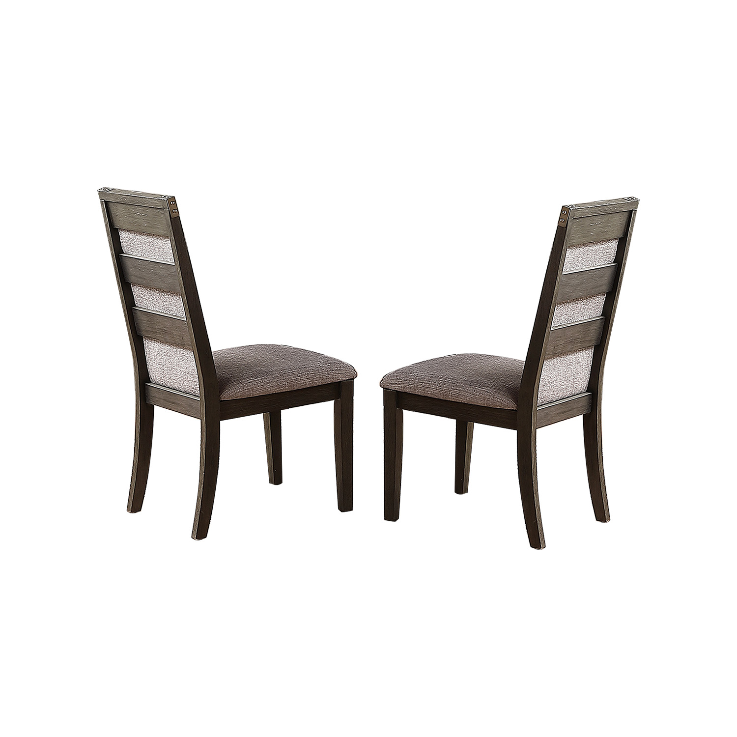 Enhance your home dining experience with these fabric dining chairs. Soft fabric over plush padding offers comfort while a high back provides support and encourages correct posture. With a weathered wood finish to the wood legs and grey upholstery, these chairs complement any dining table.