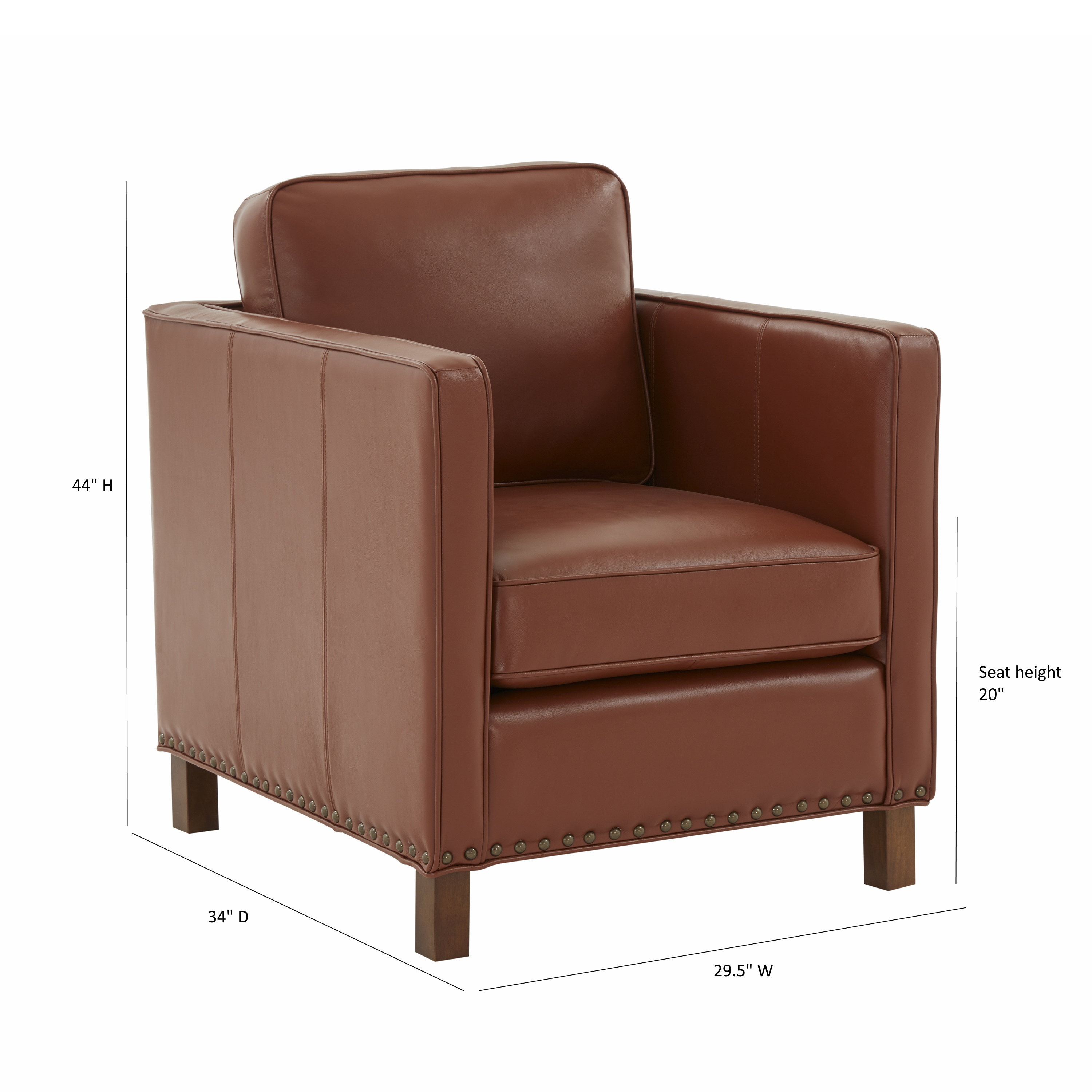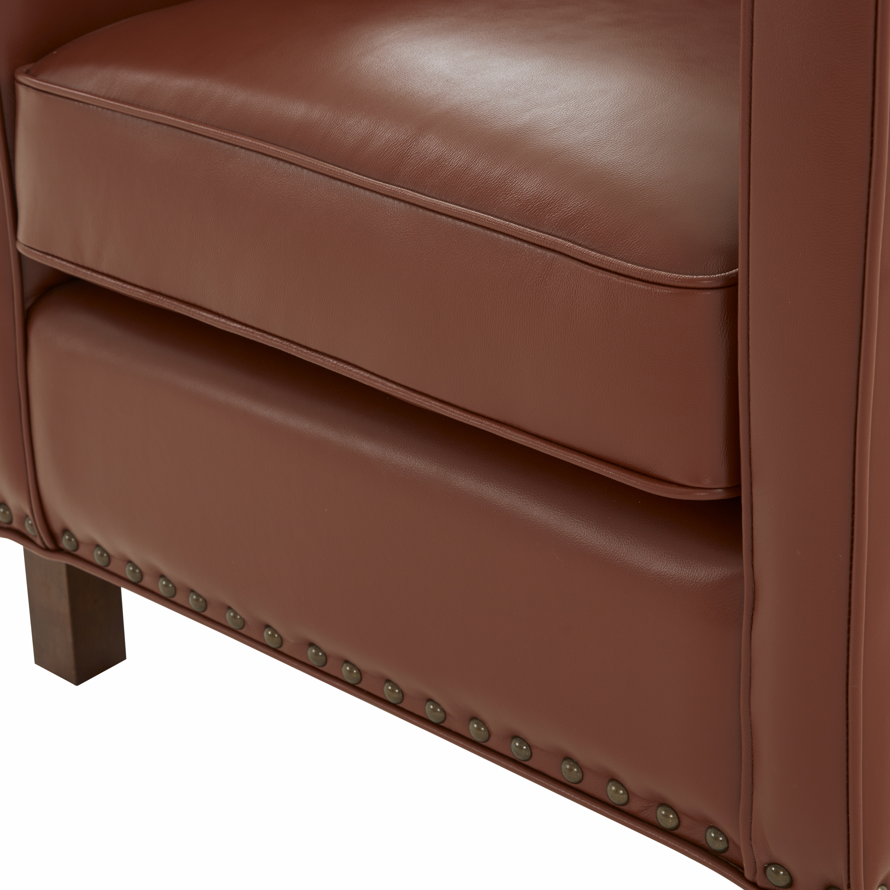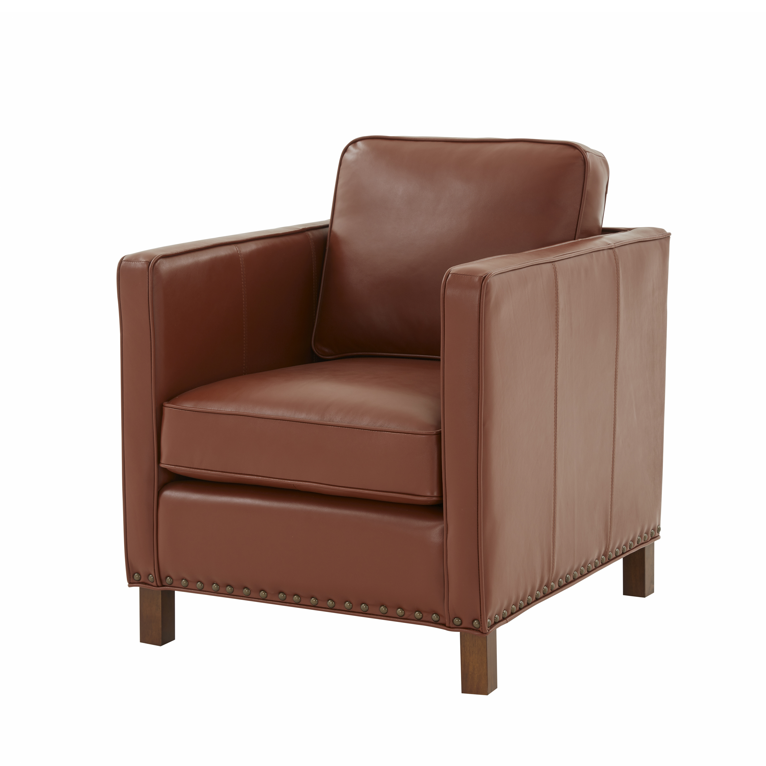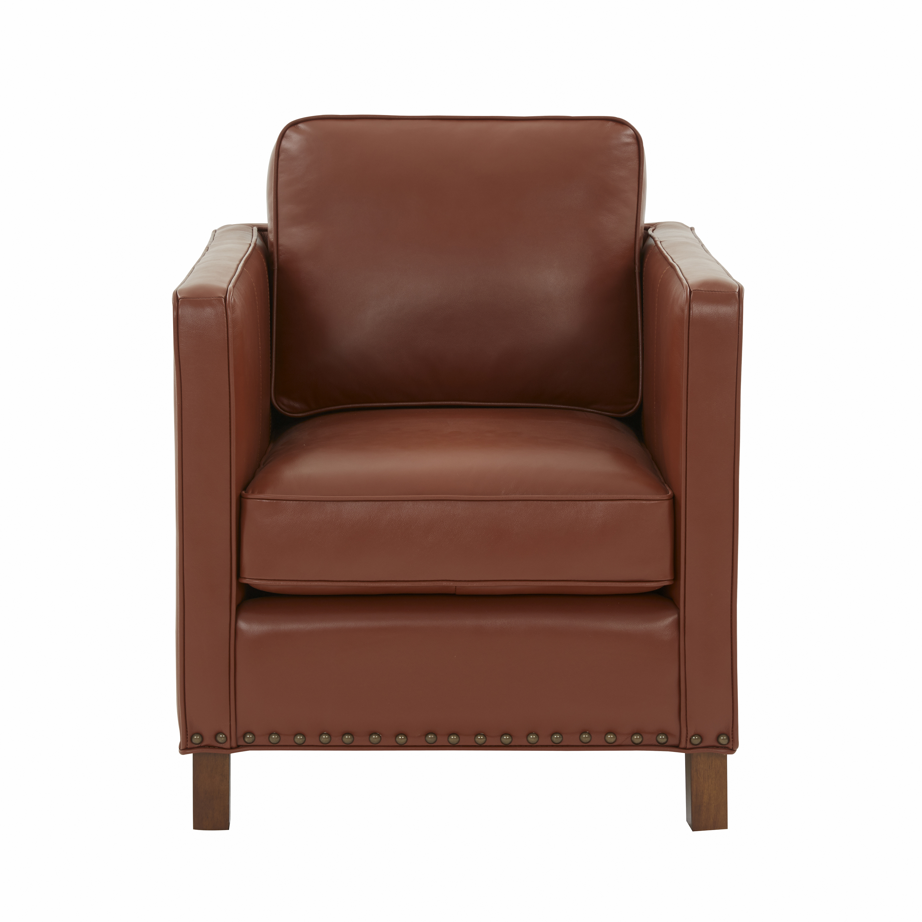 The Elizabeth club chair offers a contemporary take on a classic style and design. Upholstered in a beautiful caramel color top grain leather that is as soft as it is inviting. Accented by nail heads and welting, this comfortable accent chair will only get better with time as the leather ages.