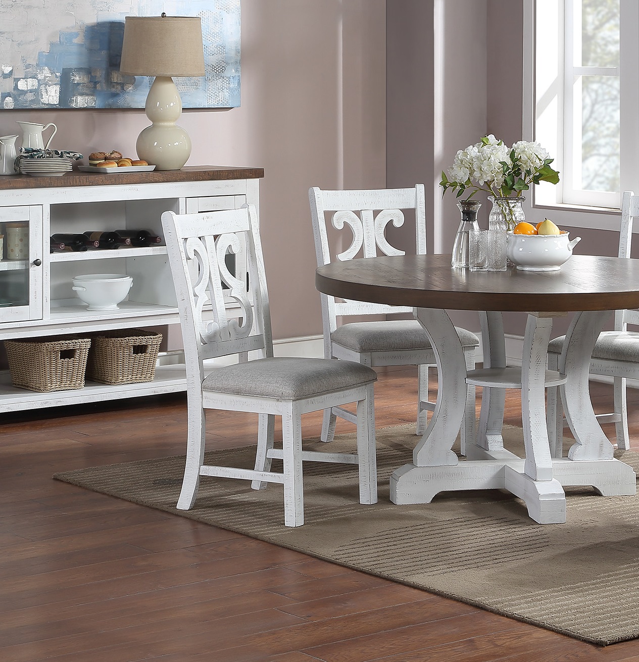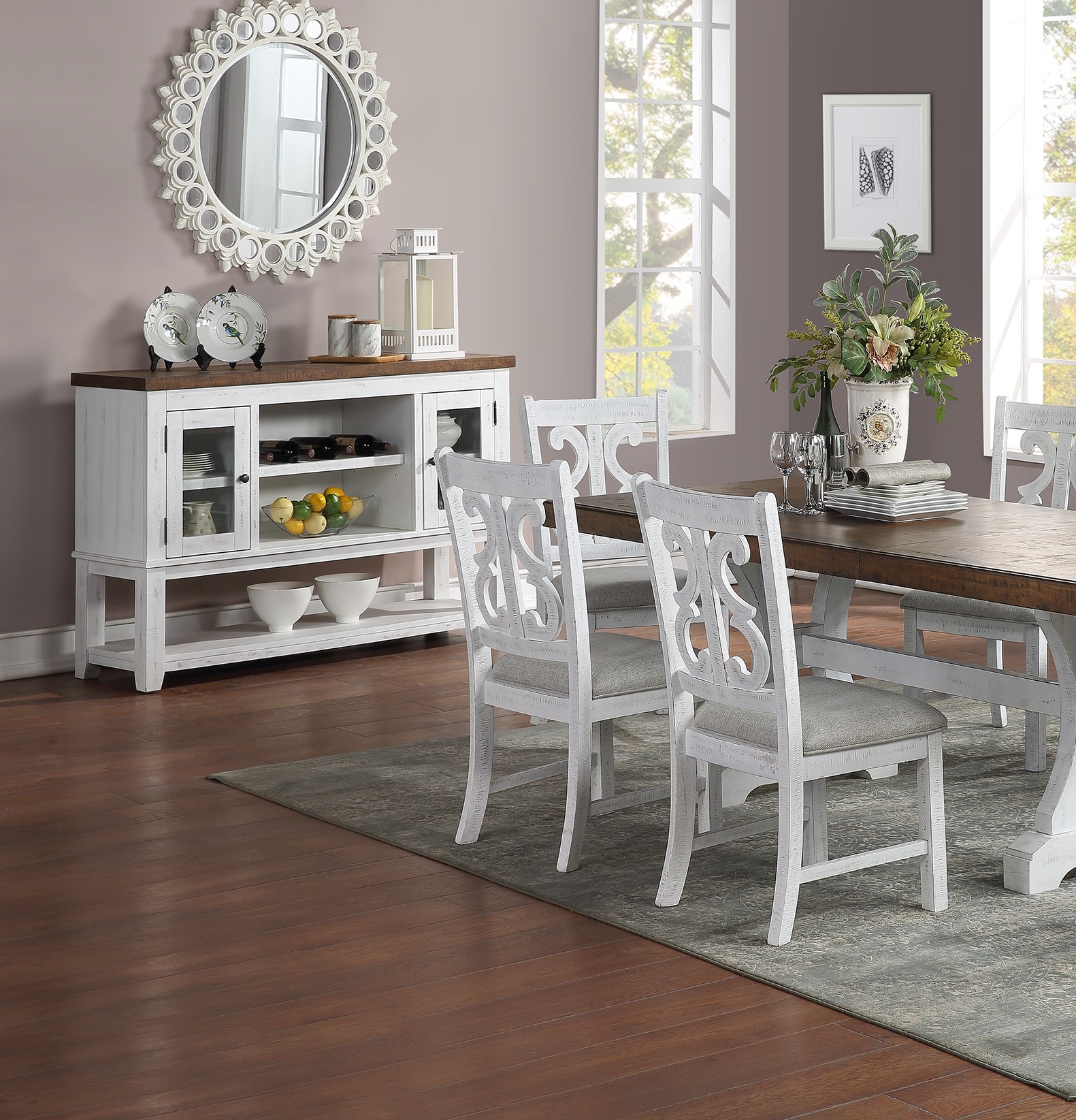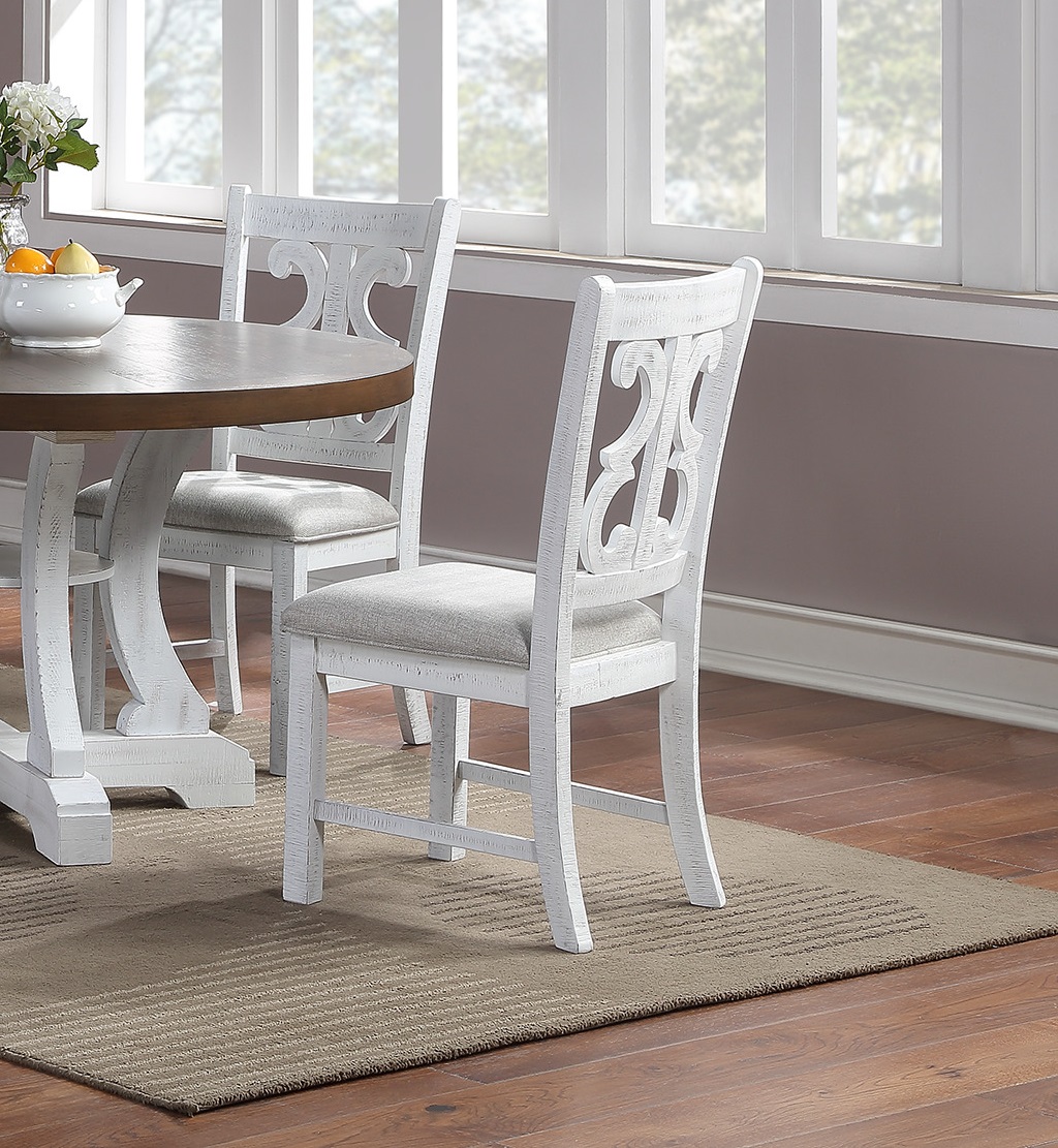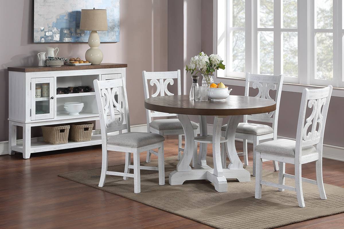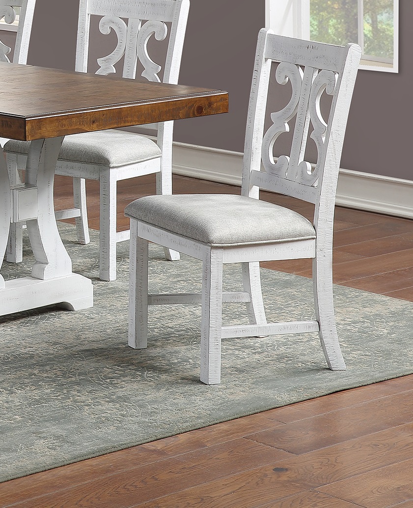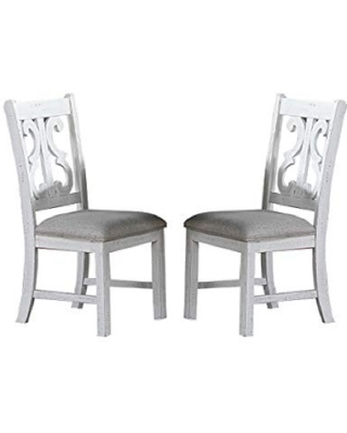 A formal dining set with distressed painted style that comes Set of chairs. This beautifully crafted wooden set, elevates your dining room decor with its modern yet classy design. The distress painted chairs upholstered with cushions, and it provides more comfort during a family gathering. The dining room server with multiple stoarge space, is built with luxury and function in mind, able to hold up silverware and even a lamp on the top shelf for your storage convenience. If you are planning to set up a classy space to host your friends and families, look no further.