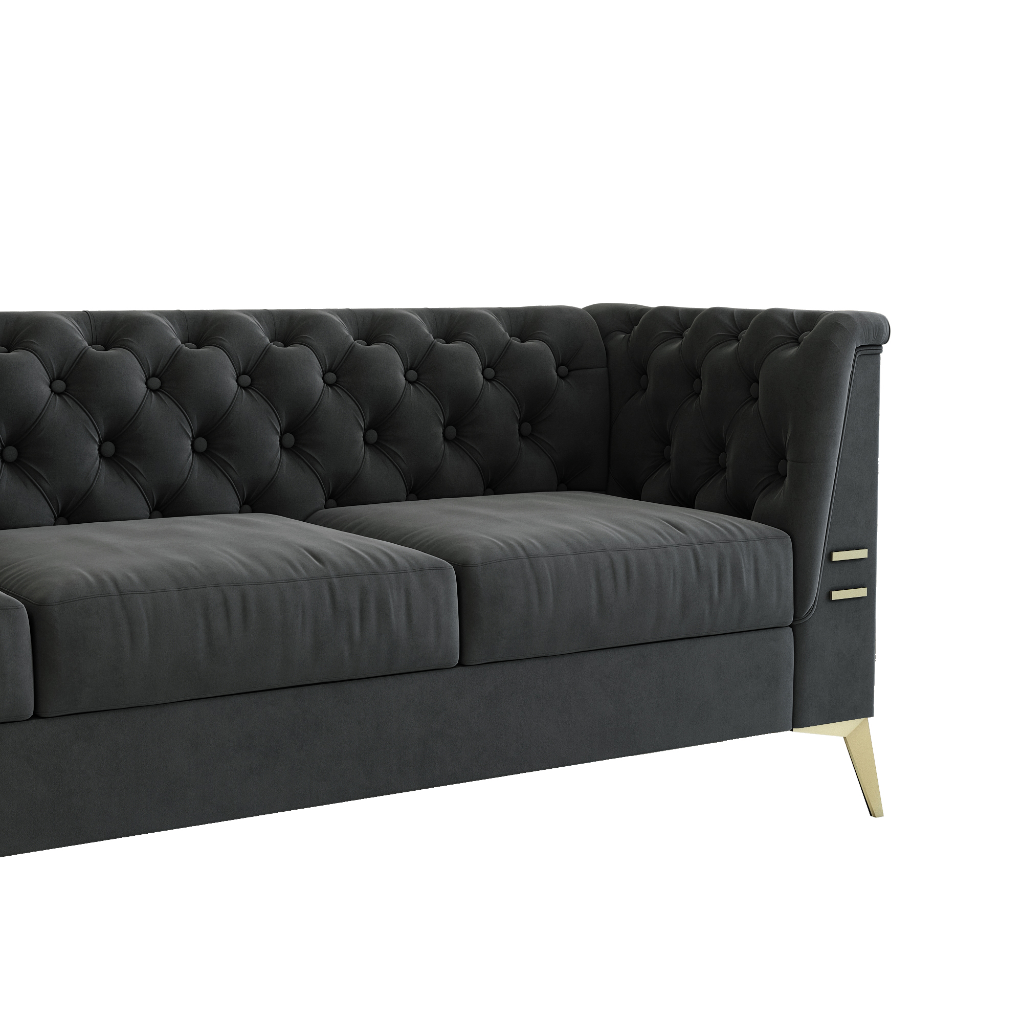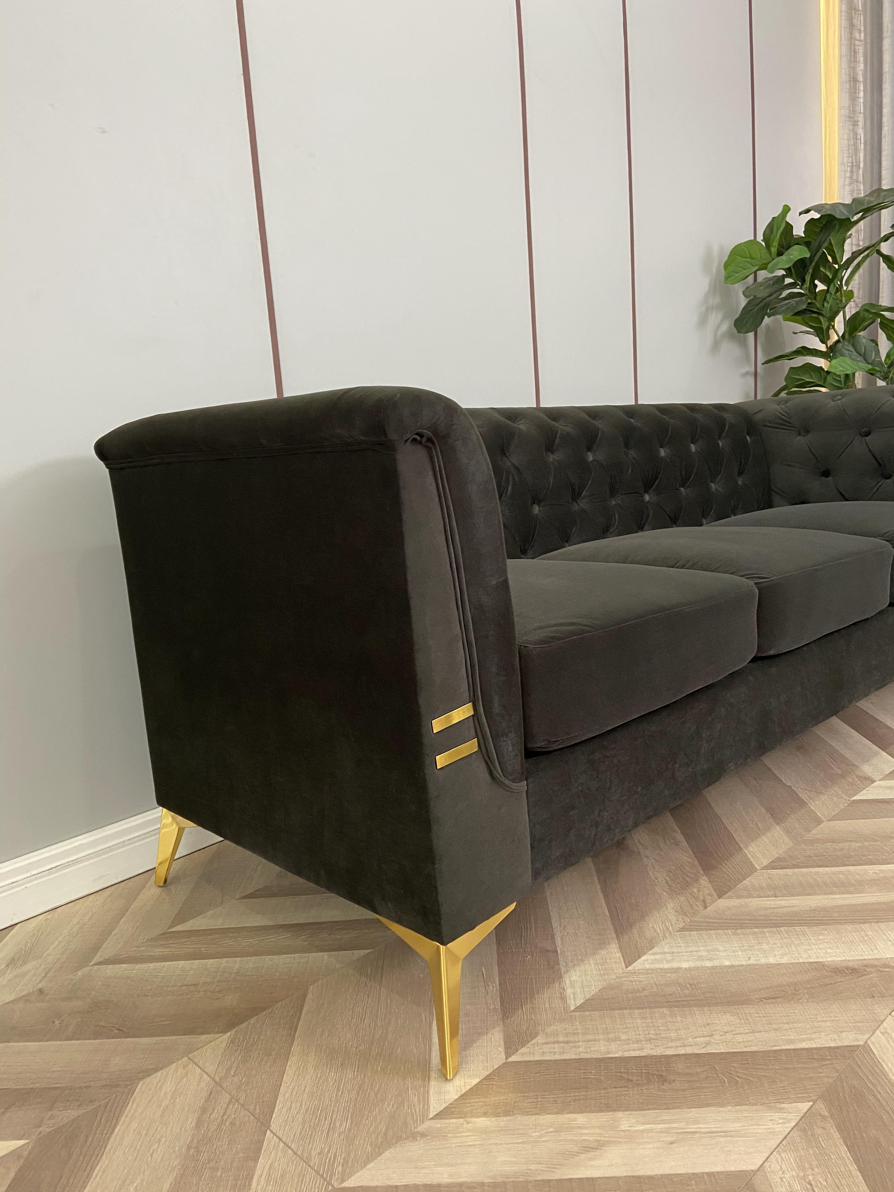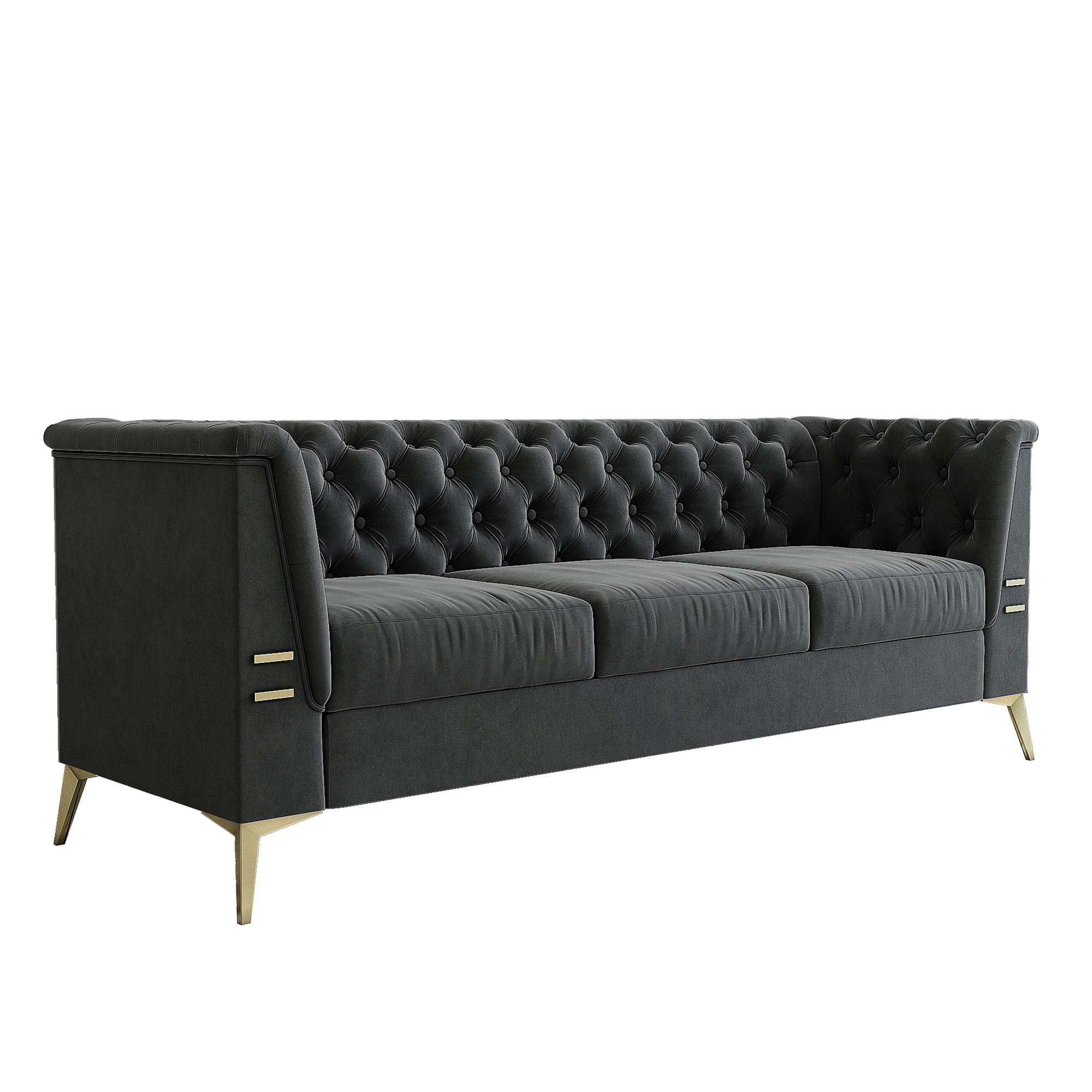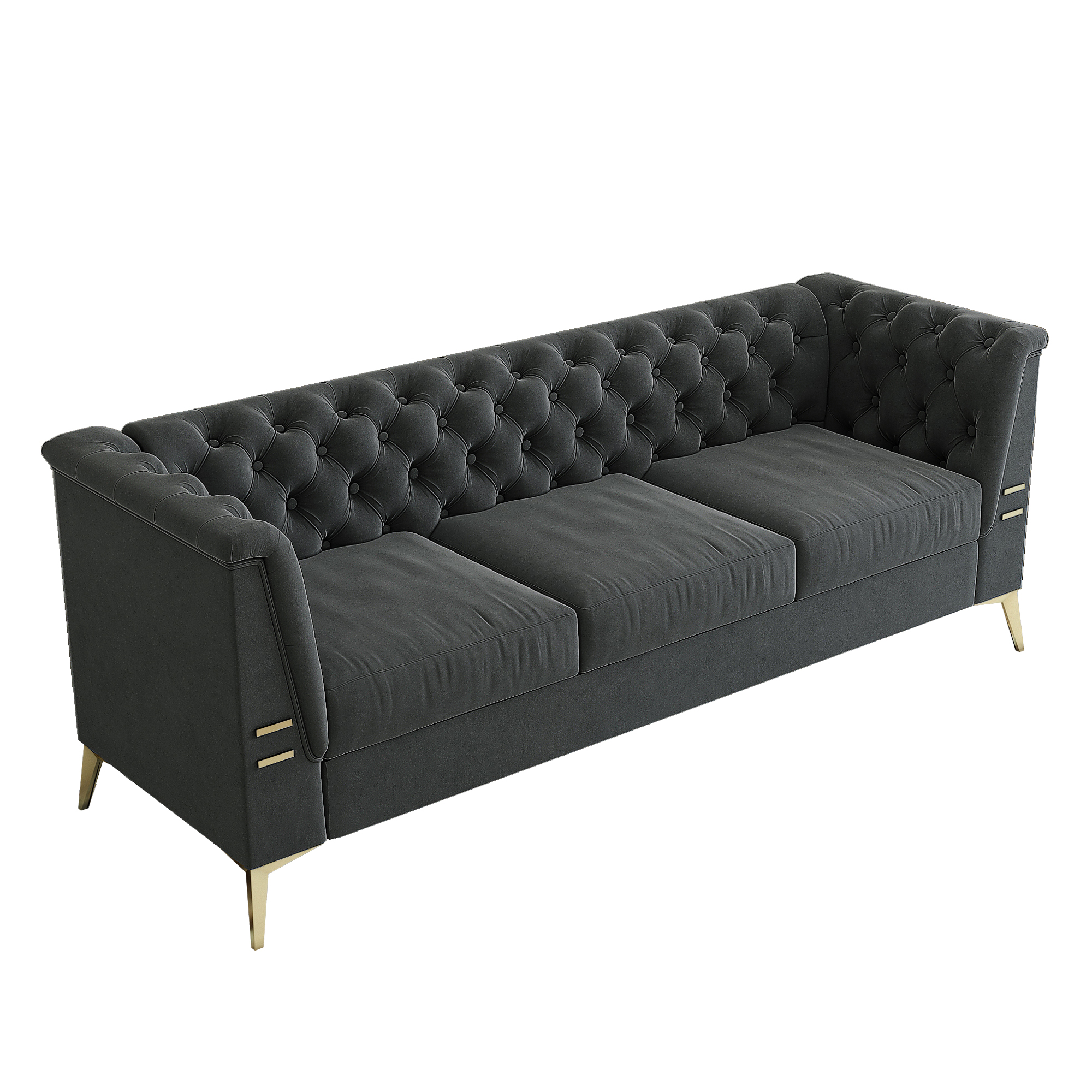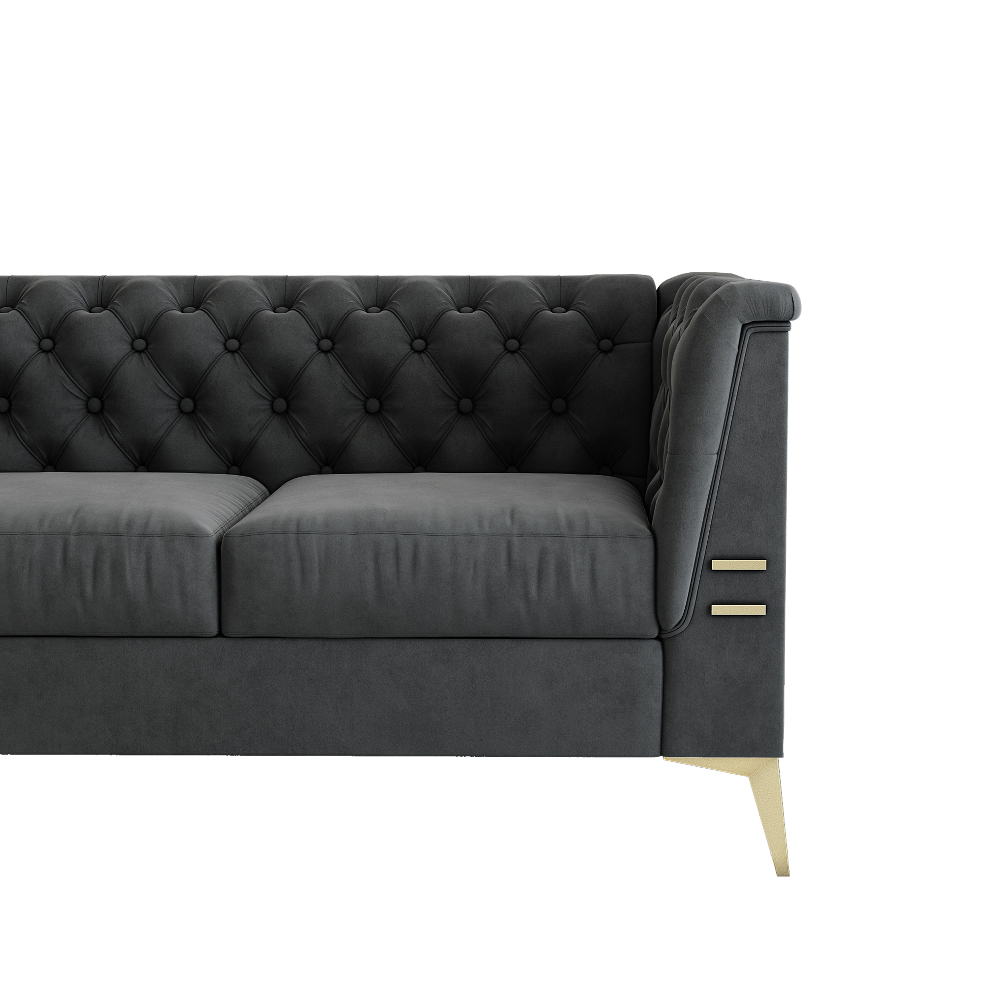 A marriage of comfort and contemporary allure, this eye-catching sofa is sure to lend style to your living room look. Founded atop four tapered feet, its clean-lined frame is crafted from kiln-dried hardwood and is covered in velvet upholstery. While a solid hue makes it a stylish stage for plush patterned pillows and faux fur blankets, it's equally elegant all on its thanks to square arms, tufted seat & back cushion.