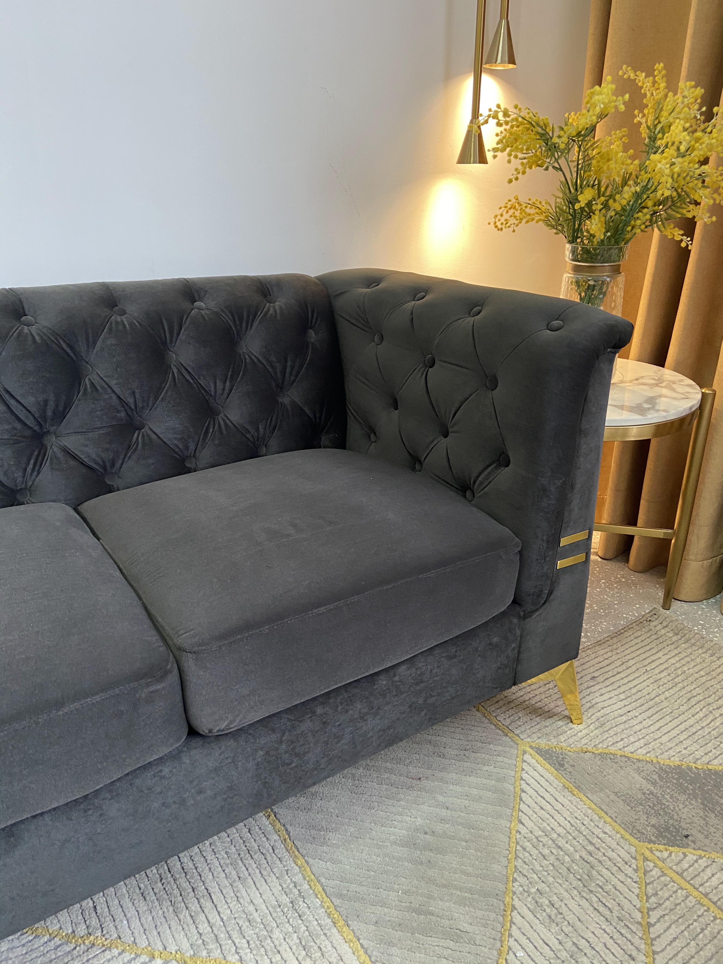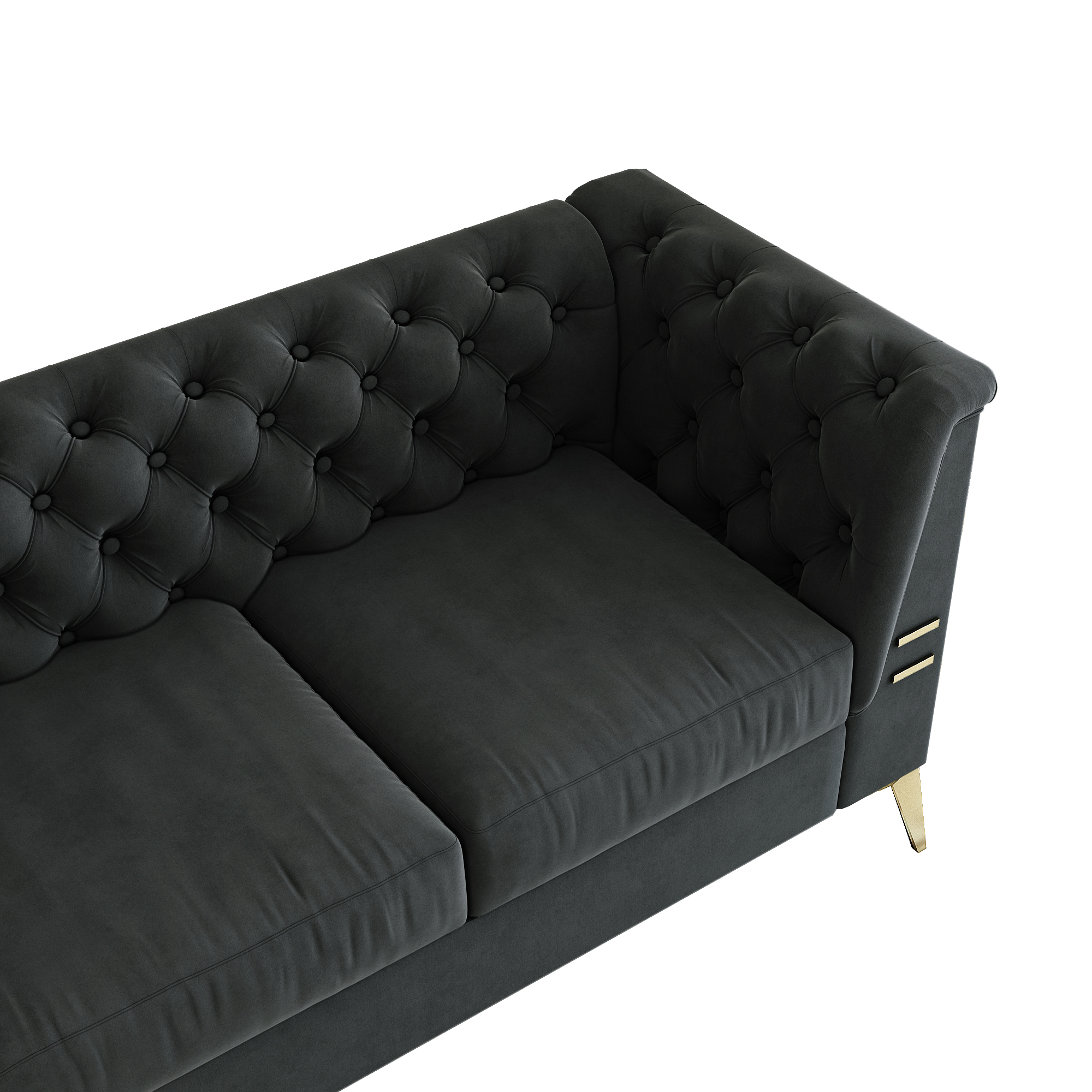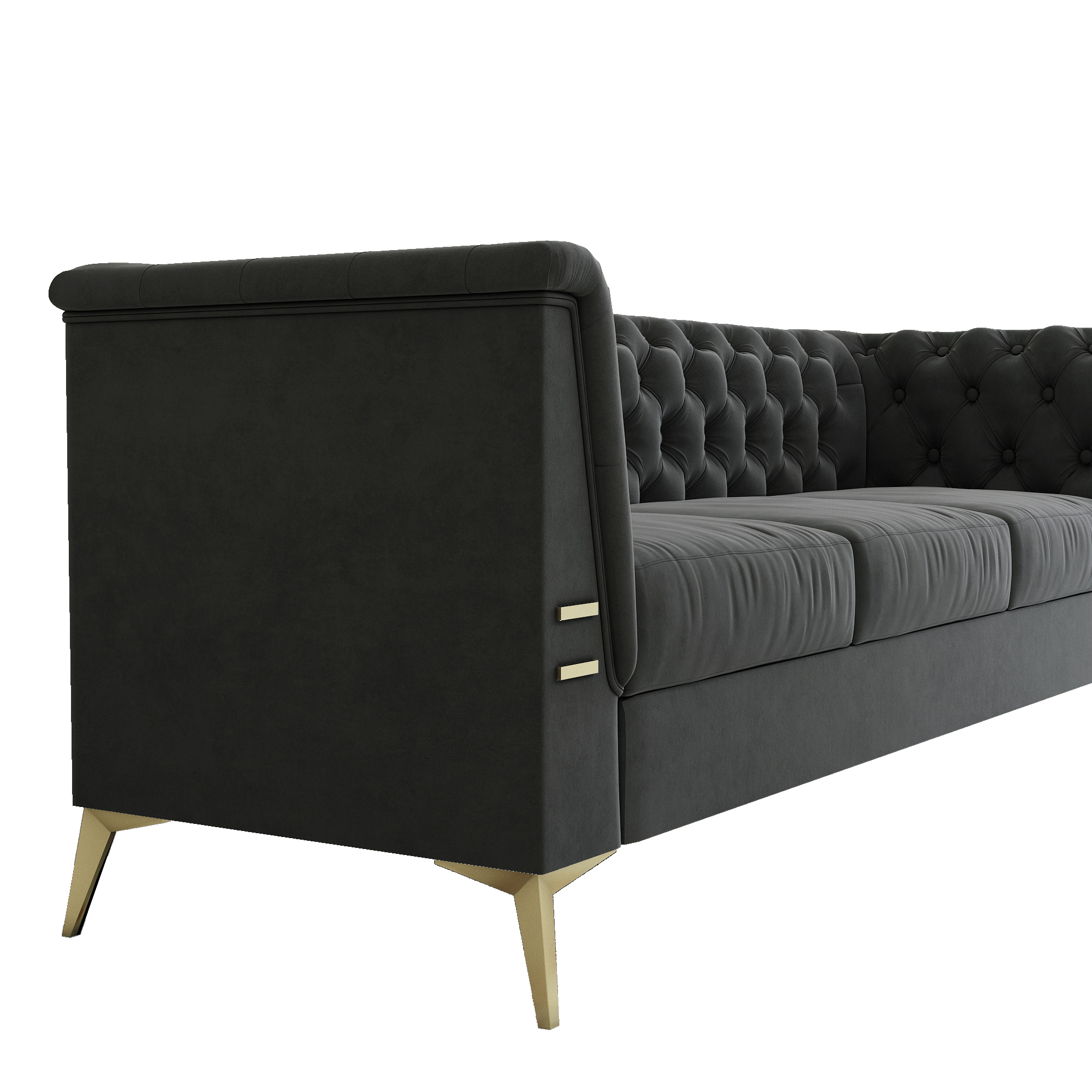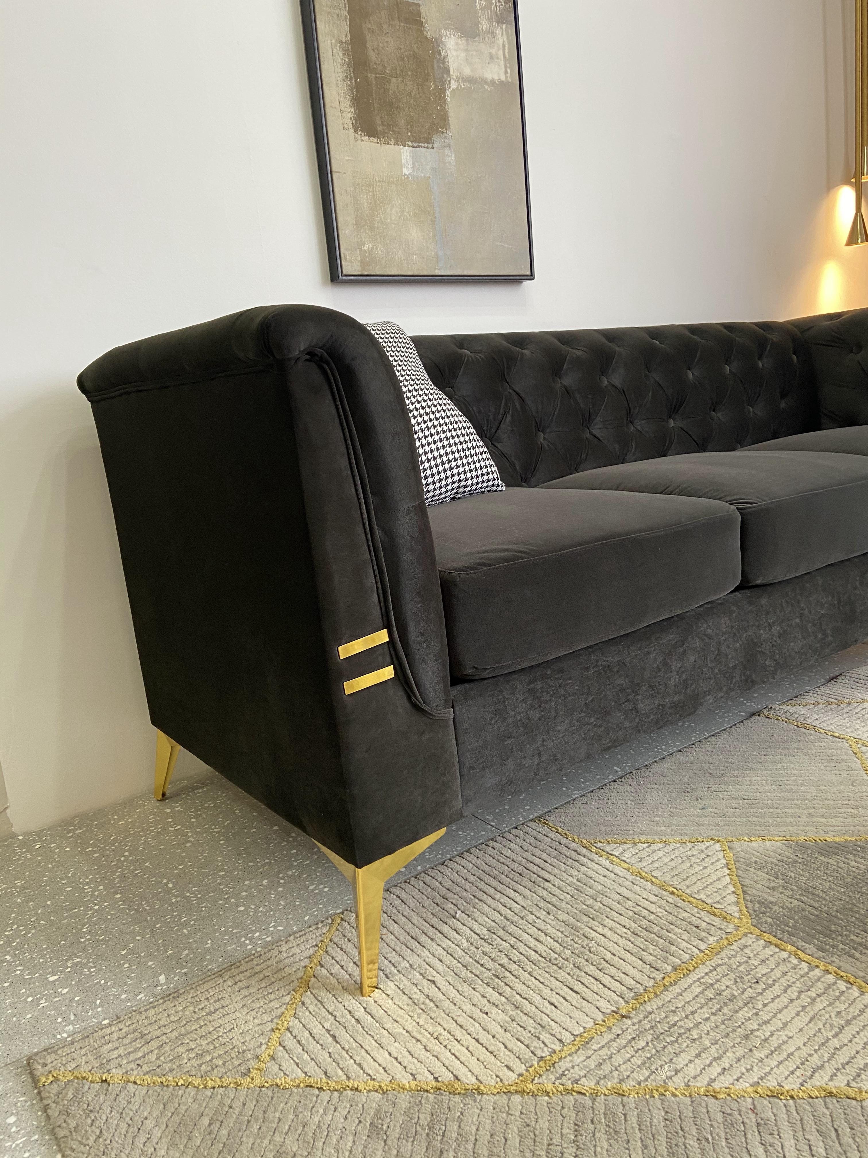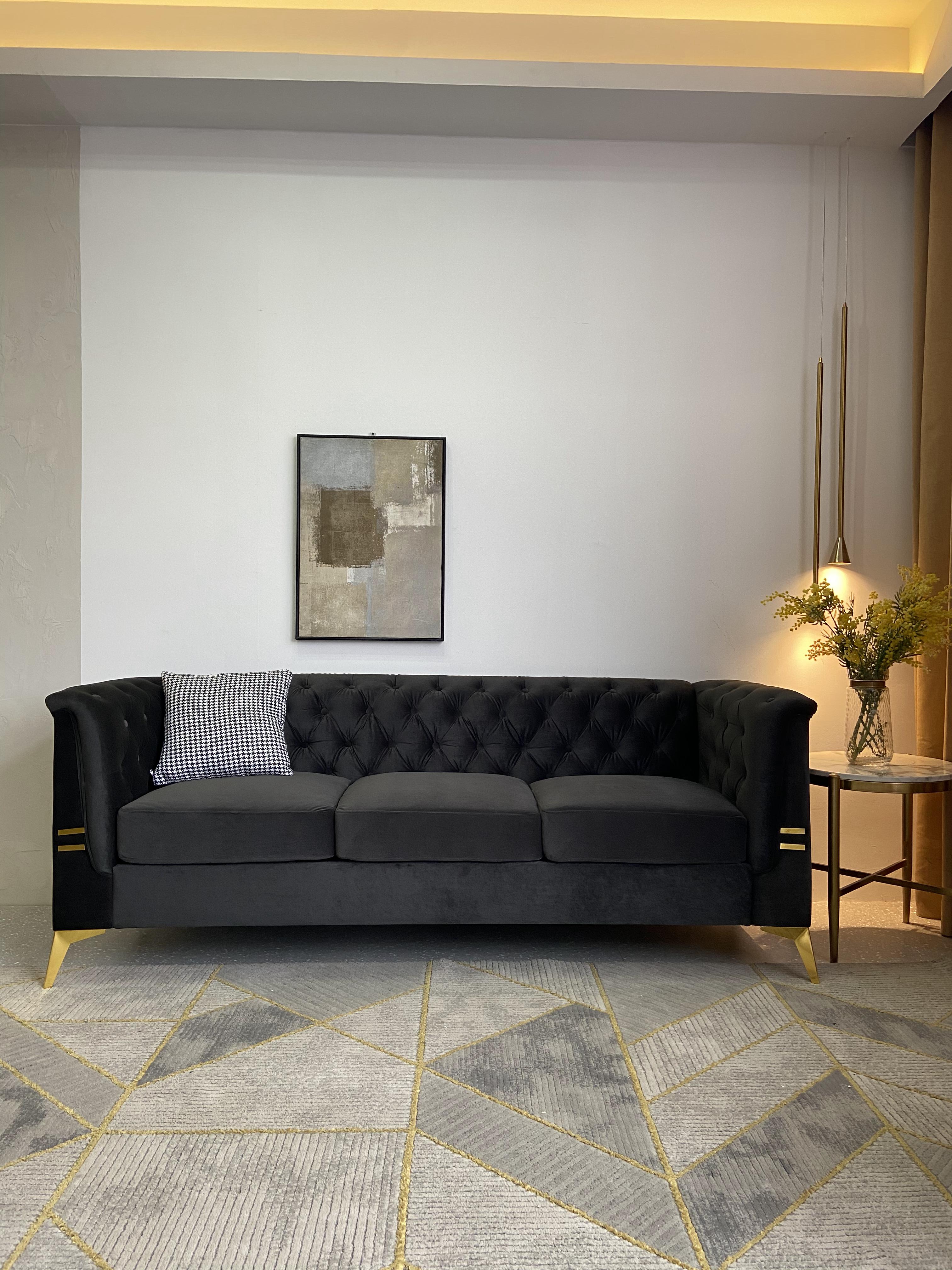 A marriage of comfort and contemporary allure, this eye-catching sofa is sure to lend style to your living room look. Founded atop four tapered feet, its clean-lined frame is crafted from kiln-dried hardwood and is covered in velvet upholstery. While a solid hue makes it a stylish stage for plush patterned pillows and faux fur blankets, it's equally elegant all on its thanks to square arms, tufted seat & back cushion.