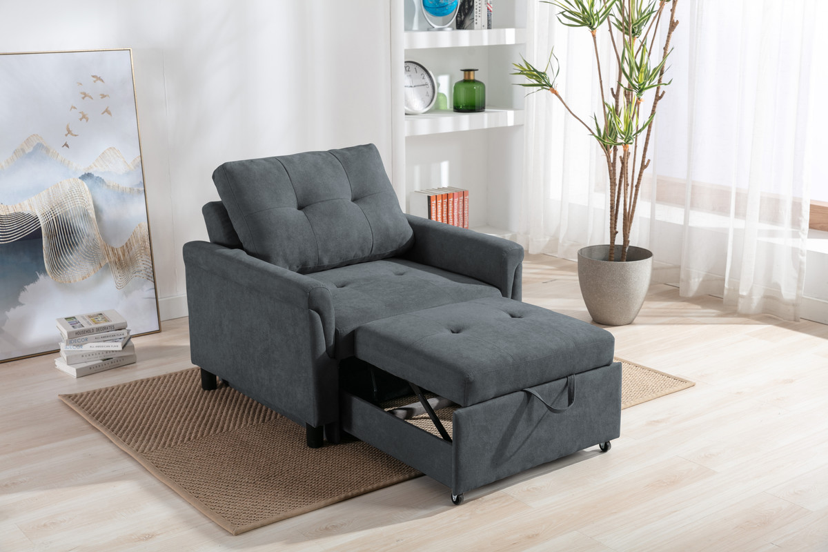 Sit up-right, lie back and relax, and even comfortably sleep on it. The Hannah easily converts into a chair, lounger, or bed to meet your needs. The well-cushioned back and padded armrest provides comfort for your seating experience. This multi-functional chair is built with quality woven fabrics and a solid wood frame, you can sit back, relax, and enjoy any activity with friends and family.Sofa Bed measures 35"W x 58"D x 33"HFoam Filled Seats with Pocket Coil Springs17" Seat Height19.5" Seat Depth27.5" Seat Width22" Arm Height16.5" Seat Back HeightPlastic Legs3.9" Leg Height