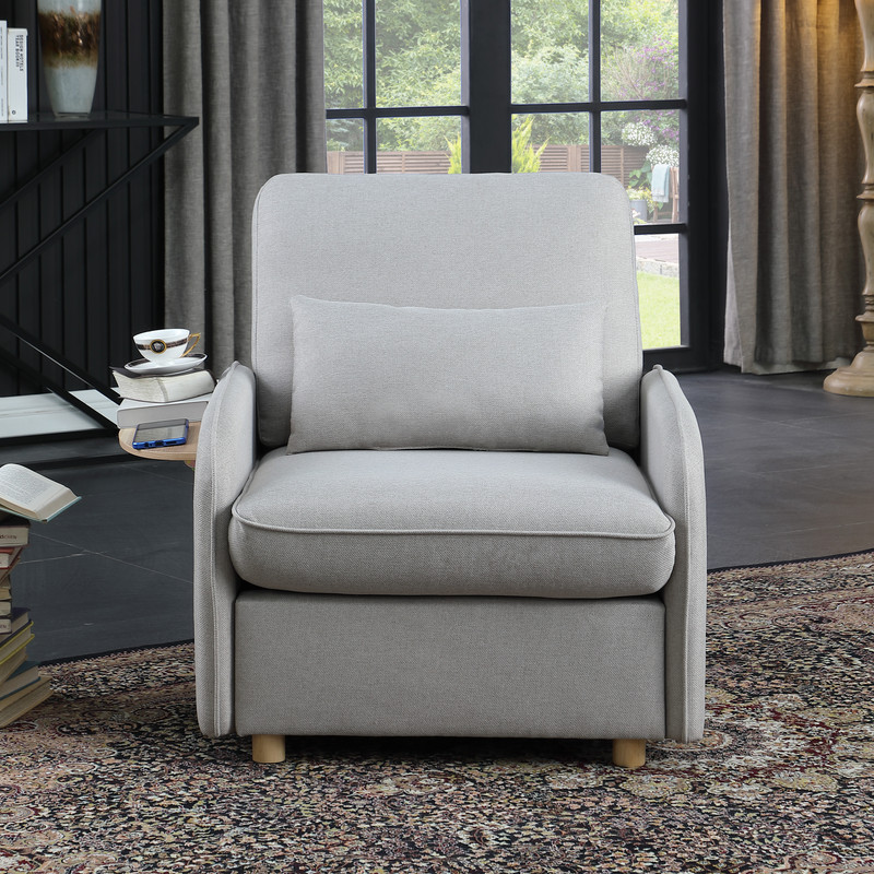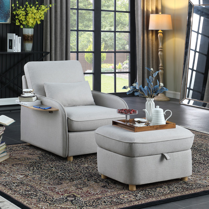Huckleberry Light Gray Linen Accent Chair with Storage Ottoman and Folding Side Table