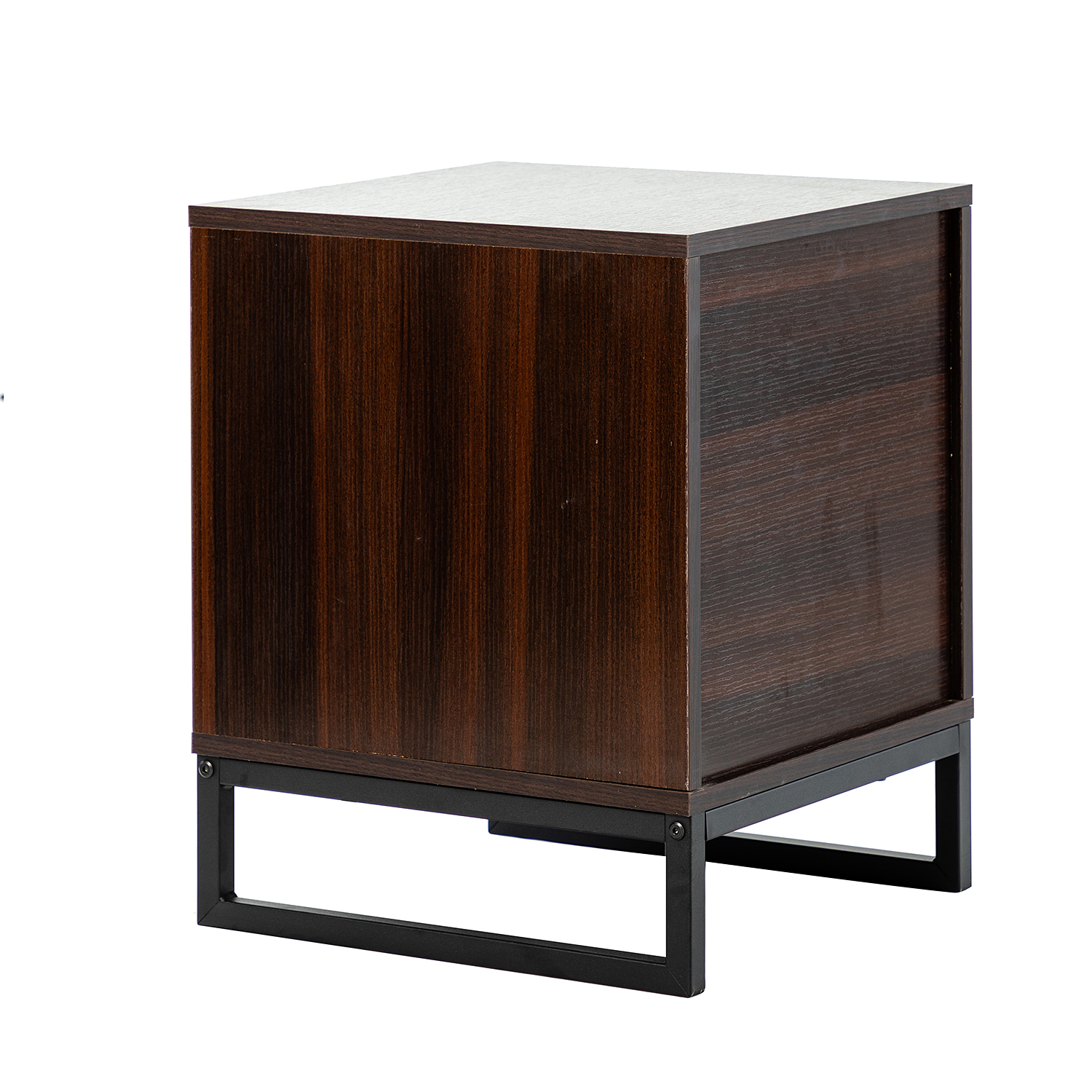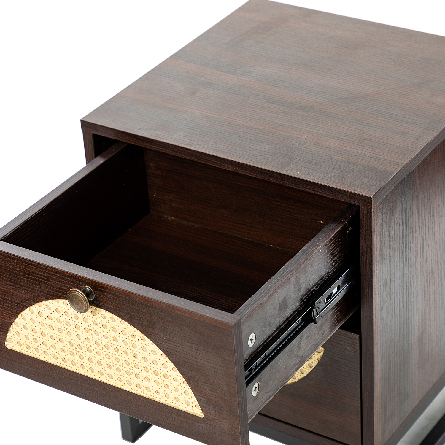 Whether positioned beside your living room sofa or acting as your nightstand in the master suite, this product with storage always lets you stage and stow. Charming and aesthetic, this stylish nightstand brings a textured and classic appeal to your bedroom or living room. Manufactured wooden frame stands atop a stable black metal base, boasting a stream-lined silhouette. It features simulated and understated wood patterns with two rattan woven semicircles dotted on the front of drawers bringing a feel of creativity and texture. Arriving with two practical drawers sliding on interior metal glides, this piece offers convenient concealed storage space to clear up your TV or air conditioner remote control, snacks, tissue and other essentials while the sturdy table top is suitable for a lamp, cell phone, glass of water, or anything else you need within arm's reach. Being a perfect modern design with antique knobs for your home, this versatile nightstand can be used as a side table or end table. Wake up your style with this nightstand and put some pep into your daily routine, from the bedroom to the living space.