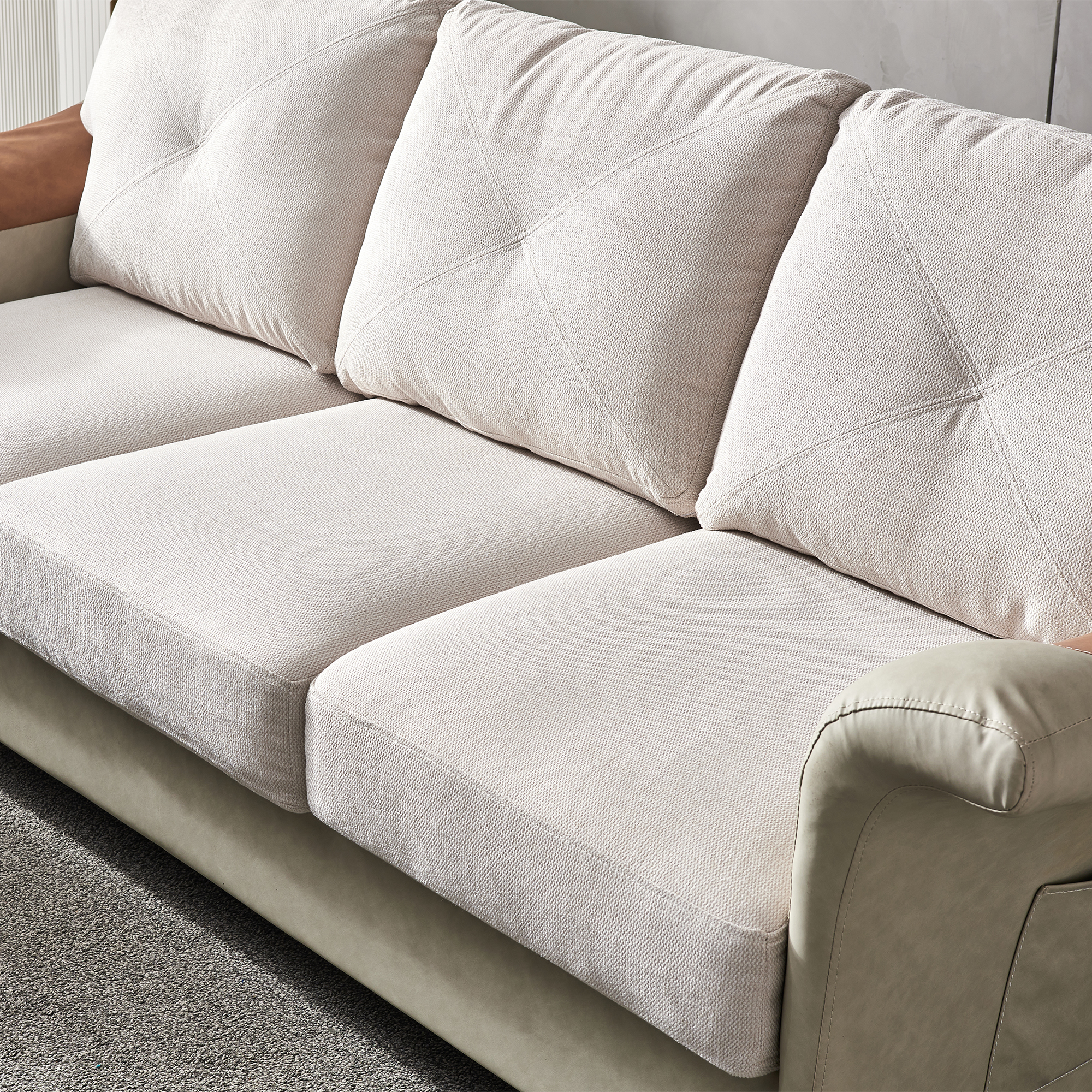 UNIQUE DESIGN:The upholstery mashup of imitation leather and fabric,plus saddle shape armrest make the whole sofa looks unique.