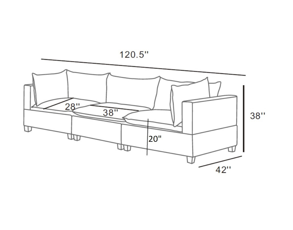 Sit back and relax in the Madison Collection! Crafted from solid wood and fine fabrics, this modern contemporary style couch will welcome you and your guests to enjoy your activities with style and comfort. Featuring down feather filled cushions, pocket coil and foam seating, and quality woven fabric, this European Style living room set offers a timeless look and is the leader of furniture trends. Includes 2 Single-Arm Chairs and 1 Armless ChairCushions are filled with Down FeatherPocket Coil Springs provide Cushion SupportSolid Hardwood FrameLoose Seat and Back CushionsAll pieces attach interchangeably via alligator clips (included)20" Seat Height28" Seat Depth29" Arm Height6" Cushions Thickness3.12" Leg Height