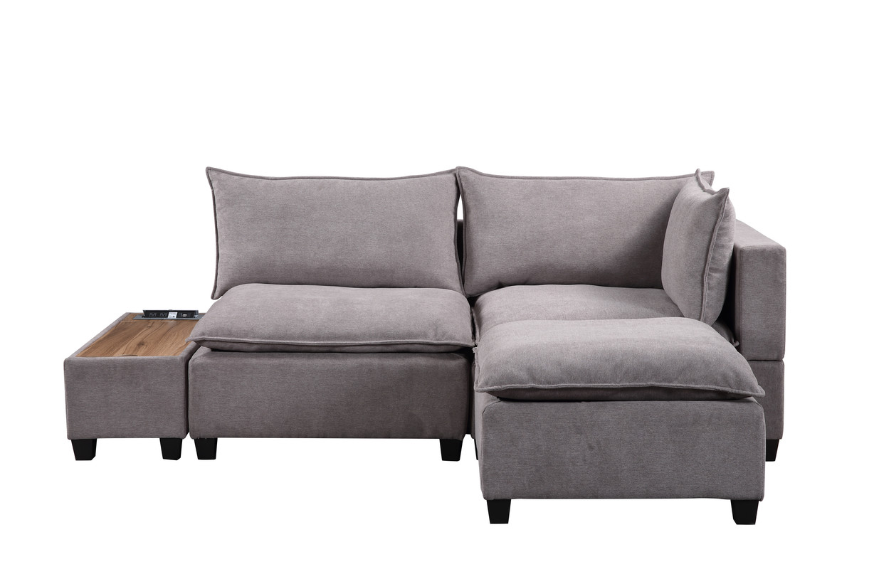 Sit back and relax in the Madison Collection! Crafted from solid wood and fine fabrics, this modern contemporary style couch with ottoman and storage console with USB and charging ports will welcome you and your guests to enjoy your activities with style and comfort. Featuring down feather filled cushions, pocket coil and foam seating, quality woven fabric, and storage USB console, this European Style living room set offers a timeless look and is the leader of furniture trends. Includes 1 Single-Arm Chair, 1 Armless Chair, 1 Ottoman, and 1 Console TableCushions are filled with Down FeatherPocket Coil Springs provide Cushion SupportConsole Table with Storage, USB and AC Charging PortSolid Hardwood FrameLoose Seat and Back CushionsAll pieces attach interchangeably via alligator clips (included)Ottoman measures 34"x34"x20"H20" Seat Height28" Seat Depth29" Arm Height6" Cushions Thickness