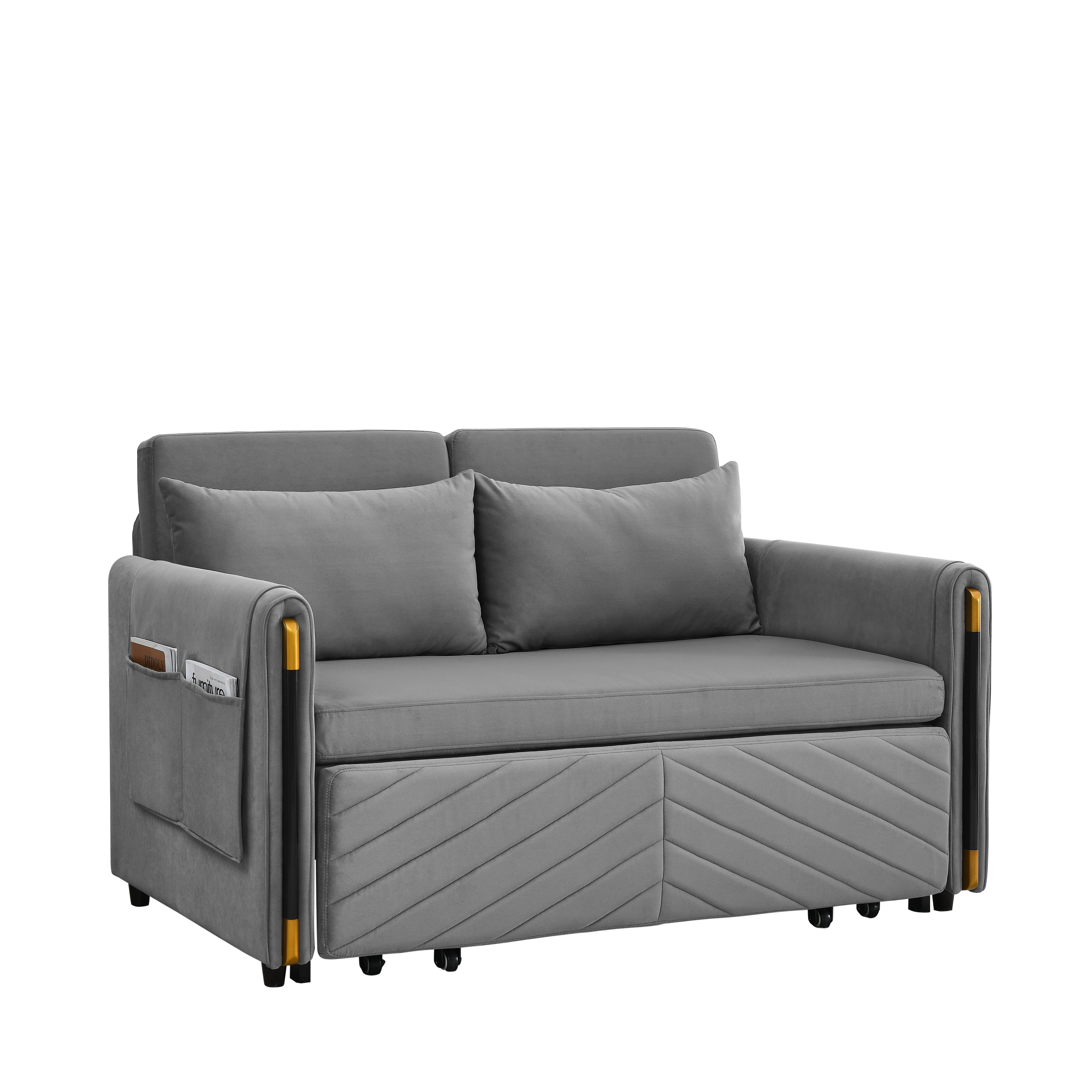 1. Multi-position adjustable pull-out sofa bed with bedhead, By pulling out the bed frame under the seat, this double position sofa can be quickly converted into a bed for resting use.2. Adjustable and super strong: soft high-grain velvet fabric and high-density foam, it can be used for listening, playing games, reading, and sleeping. It will make you feel relaxed and comfortable.3. Suitable for any scene: this multifunctional pull-out sofa bed can be placed in living room and bedroom, it can accommodate 2 people to watch TV, play games or read, it can be used for guests or children's bed, modern design and space saving. This is definitely a good choice for applicable small rooms, apartments, studios, offices.4. Perfect function: pull out the bed frame can quickly turn the sofa into a bed. Pull-out with a bed made of high quality foam and metal iron frame can steadily support you to lie on the bed.5. Removable storage pockets and soft pillows. Our sofa comes with a removable side storage bag for you to reach and use to store your TV remote, cell phone, glasses or books. Also includes two soft pillows for added back support or sleep.6. Easy to assemble and use. Easy-to-follow instructions ensure the perfect build and pull-out recliner setup is quick and easy. If you need a video, please contact me.