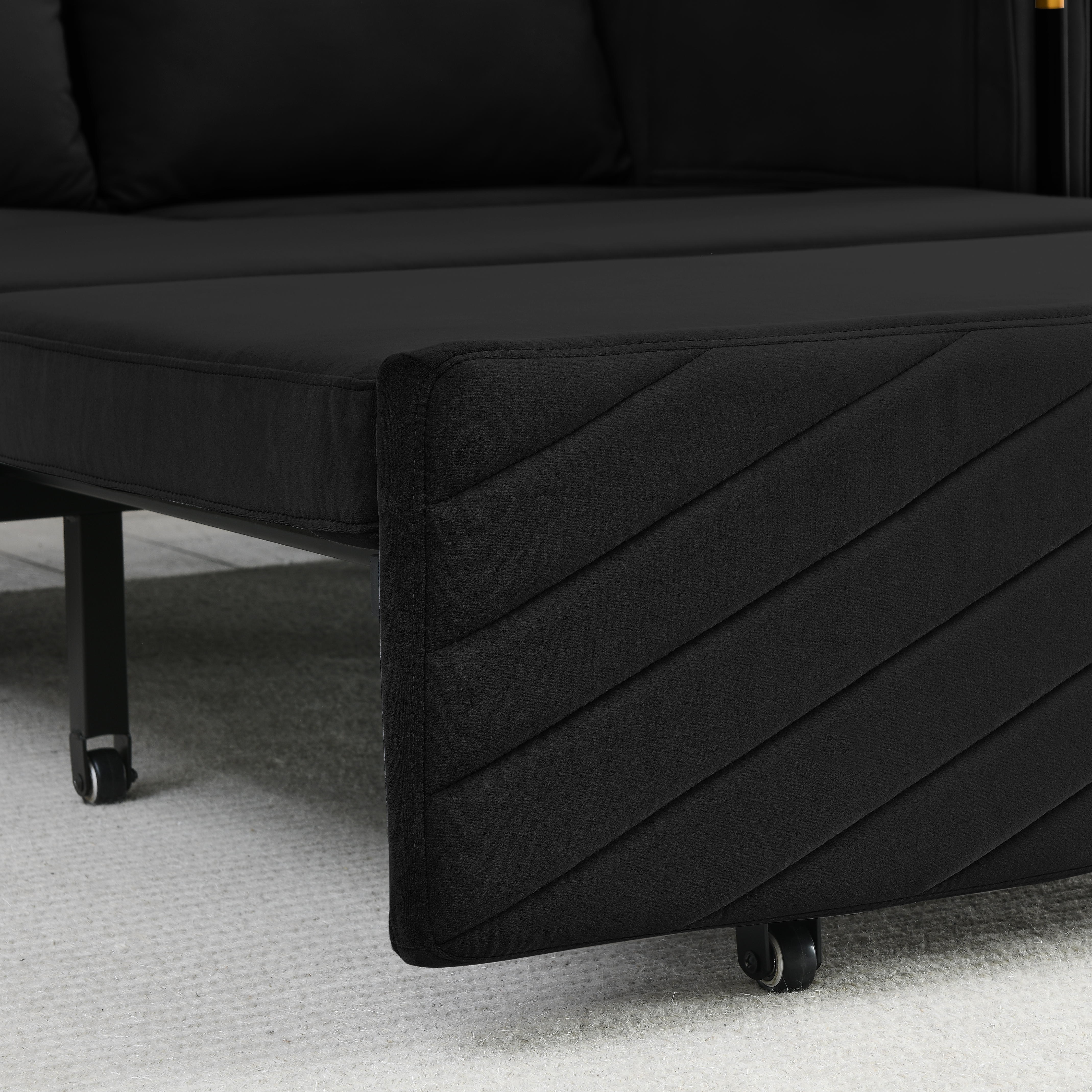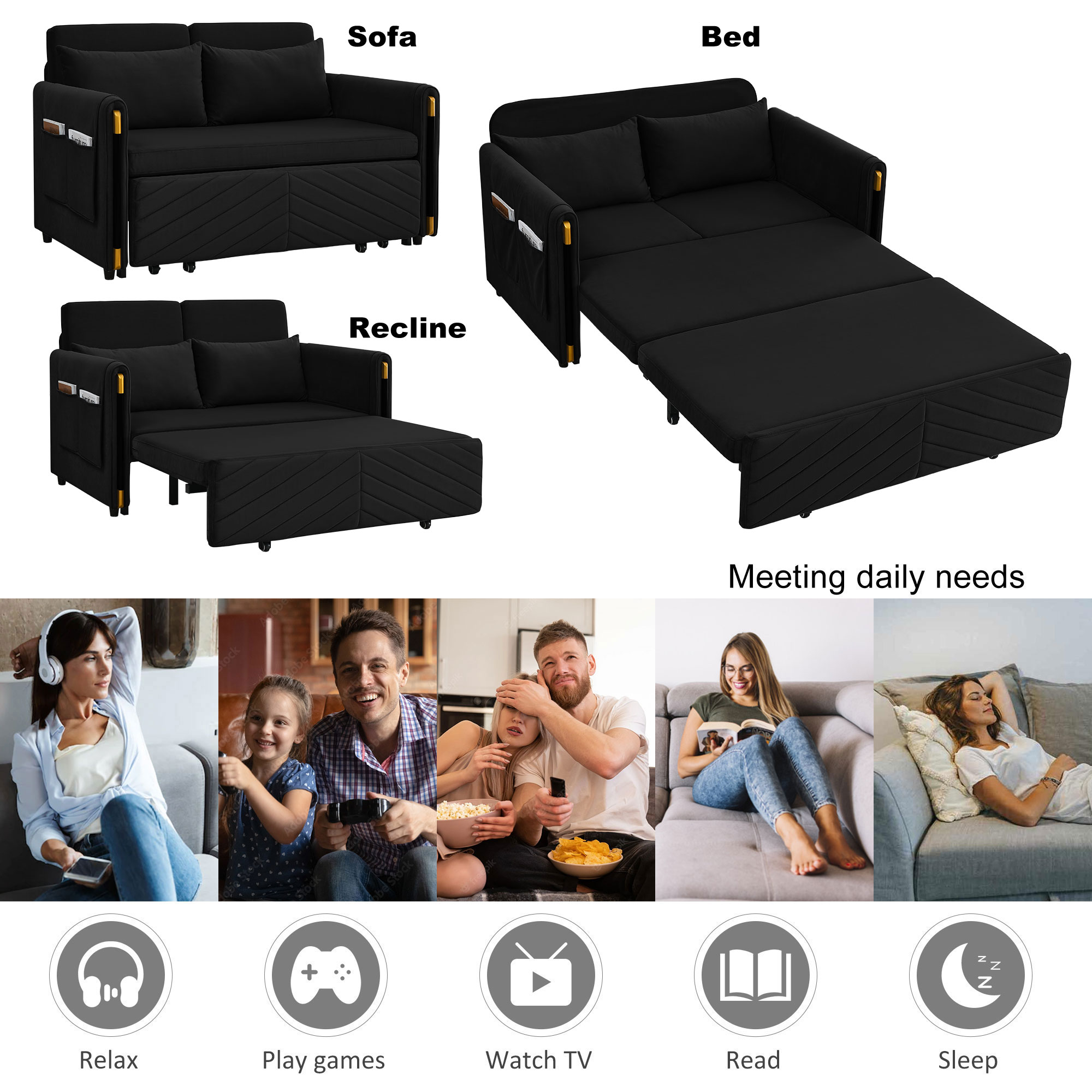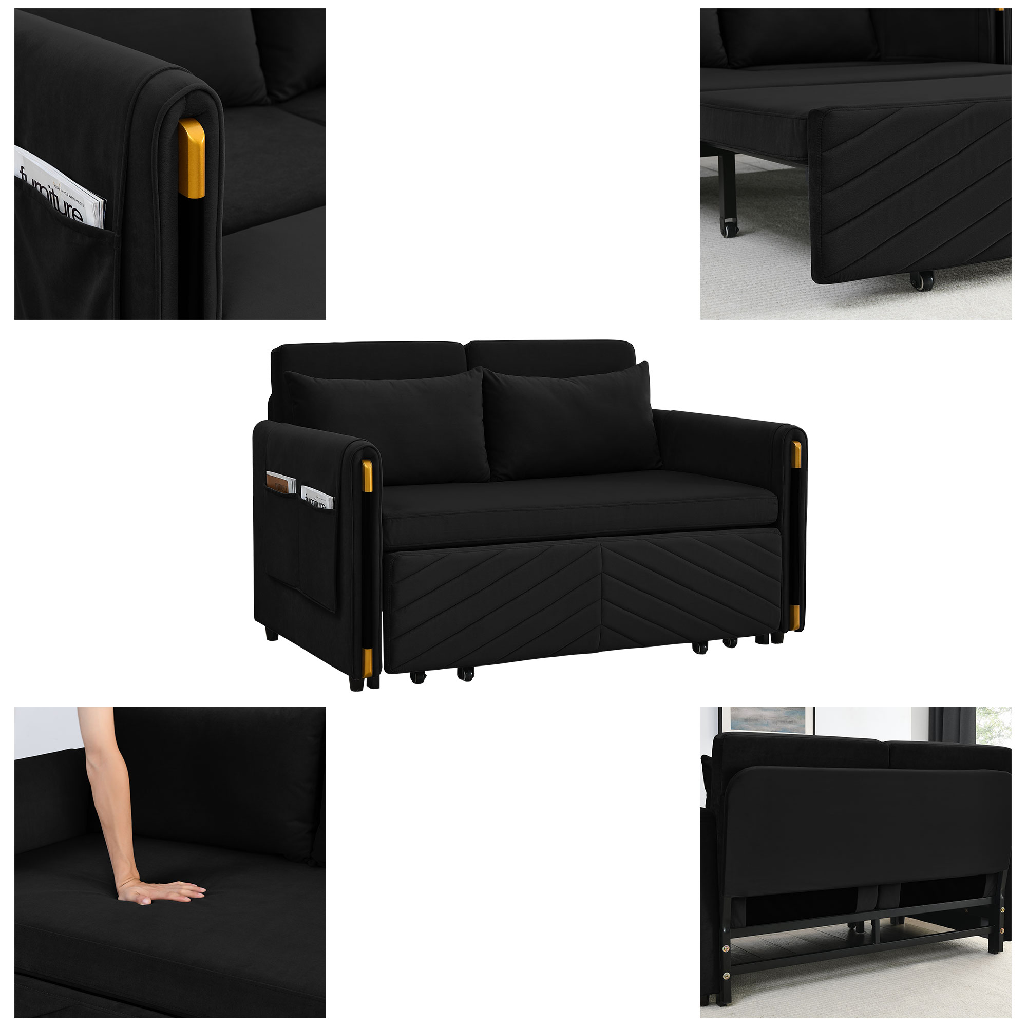 1. Multi-position adjustable pull-out sofa bed with bedhead, By pulling out the bed frame under the seat, this double position sofa can be quickly converted into a bed for resting use.2. Adjustable and super strong: soft high-grain velvet fabric and high-density foam, it can be used for listening, playing games, reading, and sleeping. It will make you feel relaxed and comfortable.3. Suitable for any scene: this multifunctional pull-out sofa bed can be placed in living room and bedroom, it can accommodate 2 people to watch TV, play games or read, it can be used for guests or children's bed, modern design and space saving. This is definitely a good choice for applicable small rooms, apartments, studios, offices.4. Perfect function: pull out the bed frame can quickly turn the sofa into a bed. Pull-out with a bed made of high quality foam and metal iron frame can steadily support you to lie on the bed.5. Removable storage pockets and soft pillows. Our sofa comes with a removable side storage bag for you to reach and use to store your TV remote, cell phone, glasses or books. Also includes two soft pillows for added back support or sleep.6. Easy to assemble and use. Easy-to-follow instructions ensure the perfect build and pull-out recliner setup is quick and easy. If you need a video, please contact me.