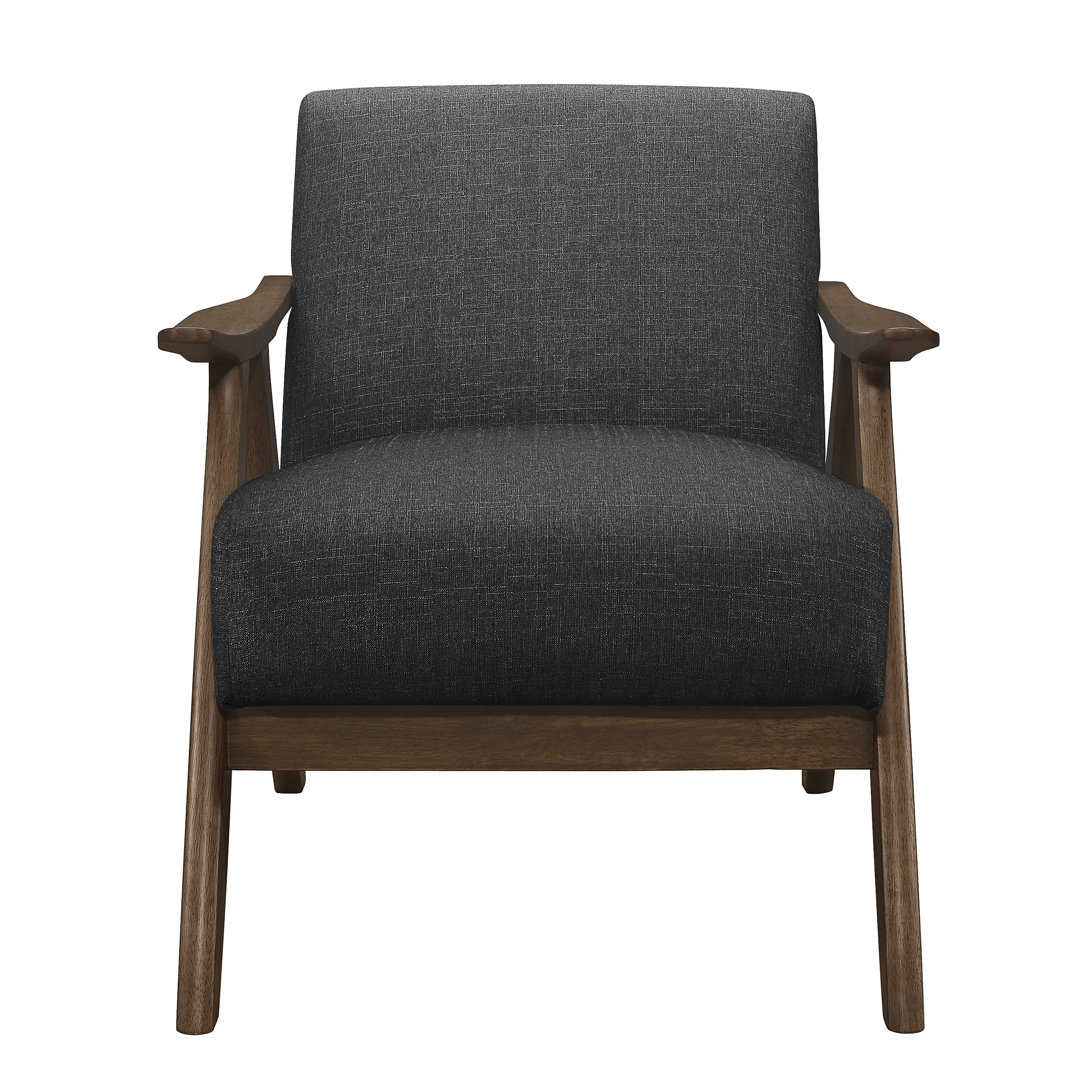 PRODUCT FEATURES: -• Country of Origin: Malaysia• Solid rubber wood frame• Foam padding over pocket coils• Textured fabric upholstery• Attached back and seat cushions• Exposed wood frame with walnut finish• Fabric Type: Textured• Fabric Color: Dark Gray• Fabric Content: 100% polyester• Fabric Cleaning Code: Upholstery (S)PRODUCT DESCRIPTION: -The retro-inspired wood framing of the Damala Collection will perfectly accent your modern home décor. Subtle contouring to the chair’s wood frame is finished in walnut, presenting as a classic complement to the dark gray fabric that covers the padded chair seat and back.PRODUCT DIMENSIONS: -Overall Dimension: 28.5" x 32" x 31.5"HSeat Width: 21.5"Seat Depth: 21"Seat Height: 18"Arm height: 23"Listing Includes: - One Accent Chair Only.Shipment Service:Shipping Service Include Curb Side Delivery with Free Lift Gate Service.NOTE: No Inside Home Delivery.